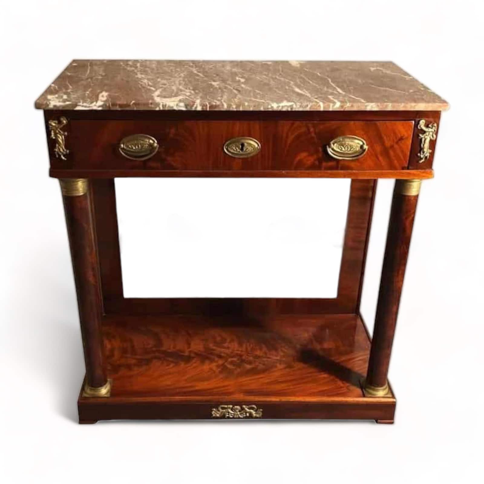 The Empire table has a beautiful mahogany veneer and a brown- maroon colored marble top and original brass fittings. The elegant columns stand on a rectangular base, the back is decorated with a mirror. The console table has one central drawer.
