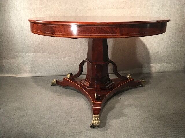 This unique and very elegant Empire table dates back to around 1810-20. It comes from Germany. It was probably made in the northern part of Germany or possibly in Berlin. The table stands out for its beautiful mahogany veneer and the exquisitely designed base. The top is raised on a central hexagonal foot which stands on a trefoil base. Foot and base are connected by three s-shaped wood strips with brass decor. The base stands on three brass lion paw casters.