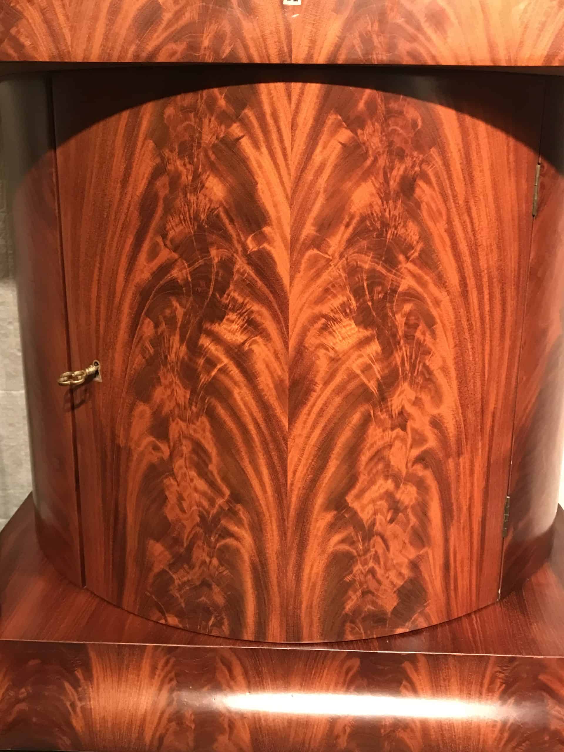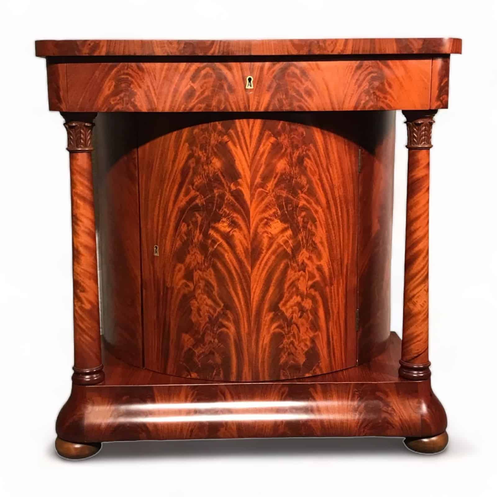 The console cabinet has a central drawer in the upper part. Below that is a strongly curved central door which is flanked by two columns. The cabinet stands on a slightly protruding base. The console has a gorgeous mahogany veneer on front , sides and top. It is in very good condition.