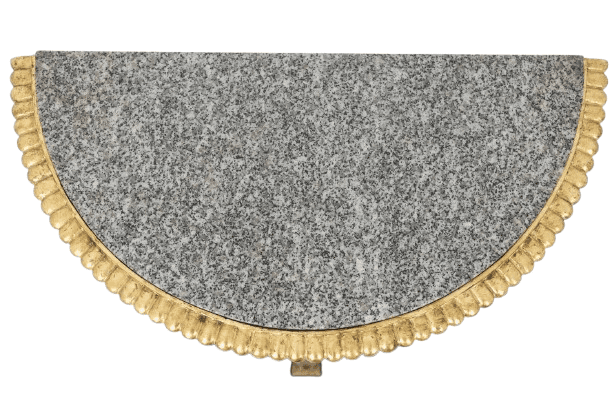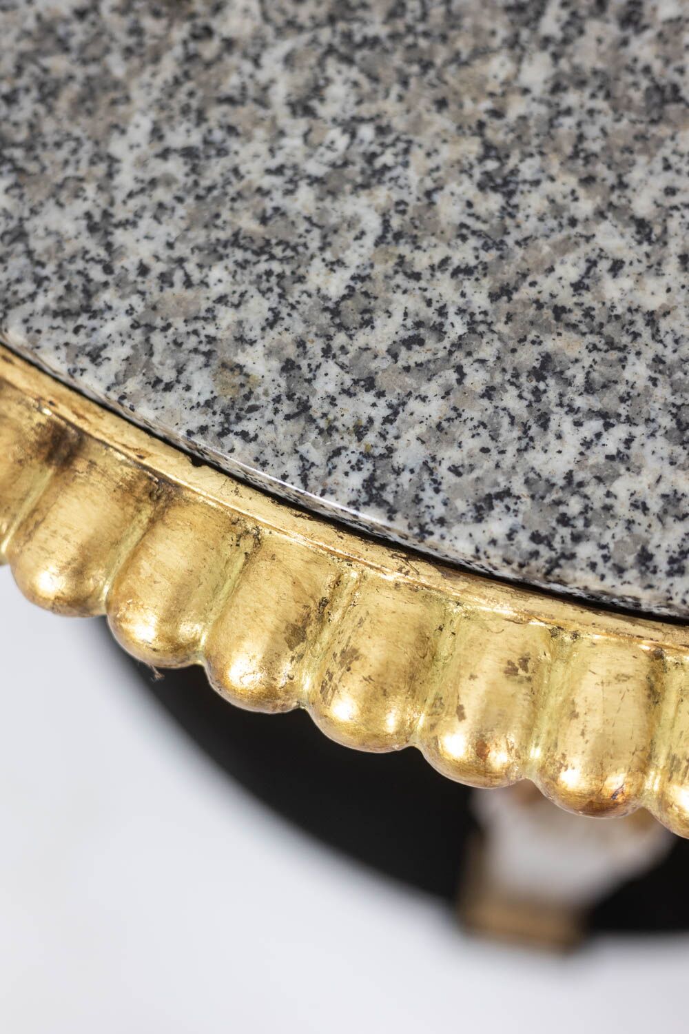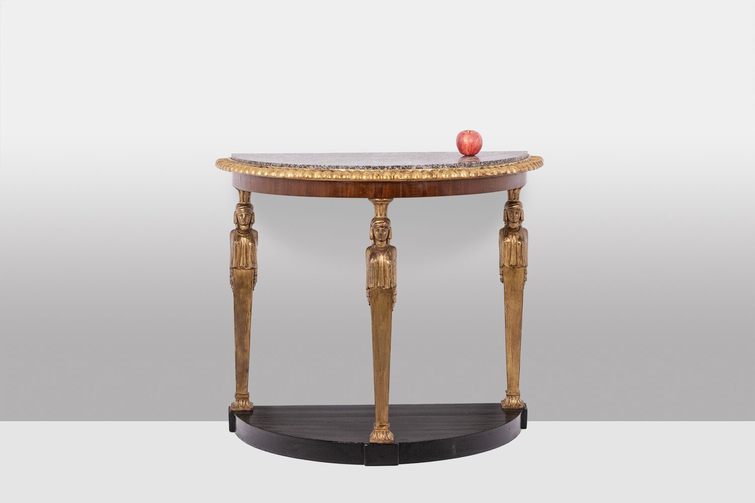 This exquisite Empire style half-moon console table, crafted around 1880, features an elegant design characterized by intricately carved caryatids or canephora (female figures bearing a burden). The caryatids are beautifully detailed, with gilded wood headdresses and flowing drapery. Adding a regal and classical touch to the piece. The console’s mahogany base and belt provide a rich, warm contrast to the gilded accents, while the granite marble top adds sophistication and durability. This French work, with its impressive craftsmanship, embodies the grandeur and opulence of the Empire style, making it a timeless piece of furniture that would elevate any interior.