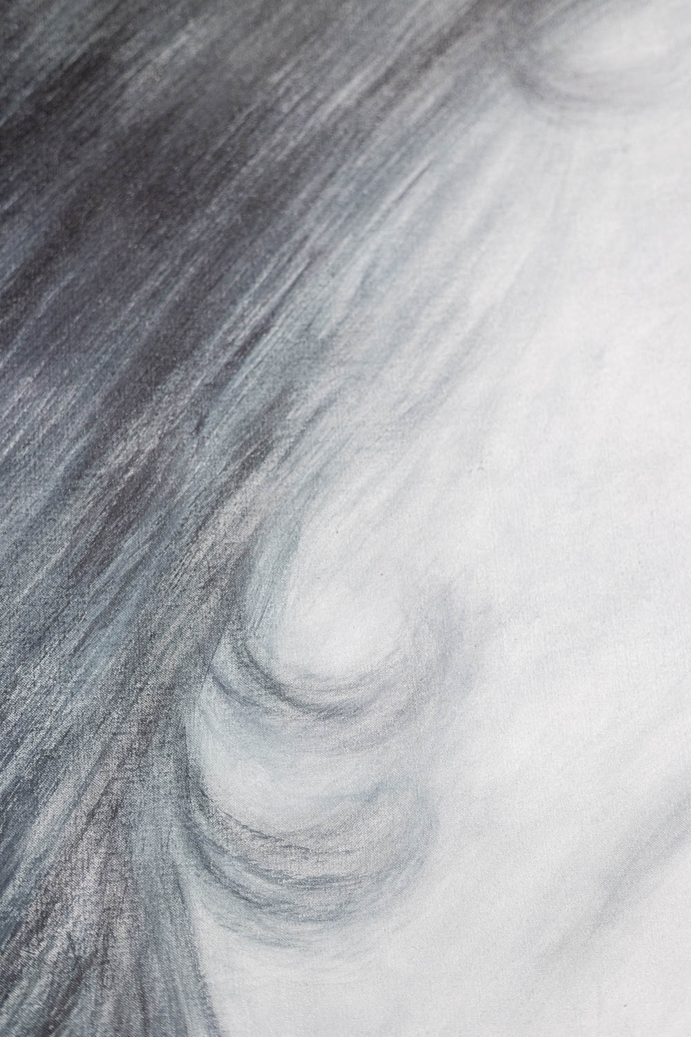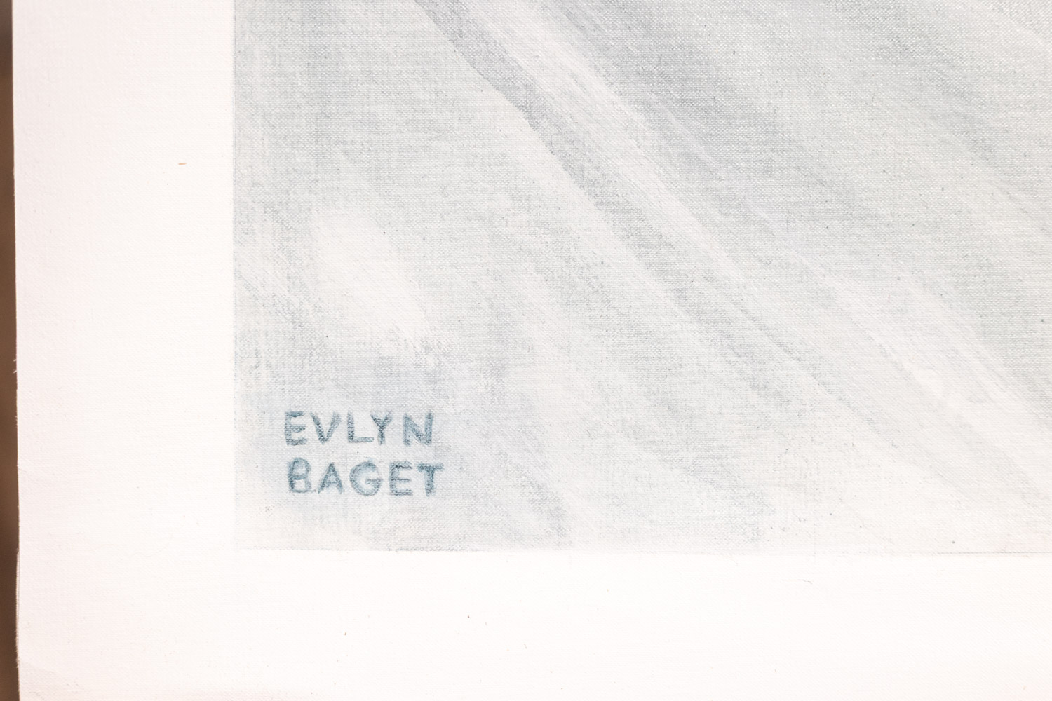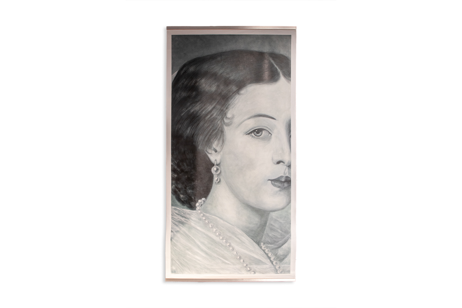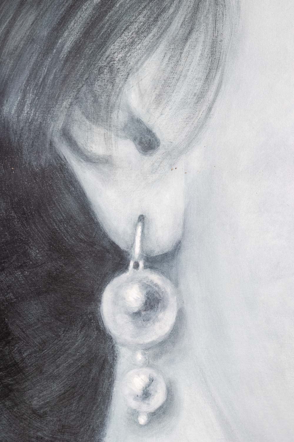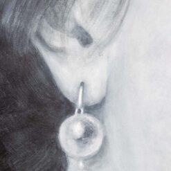 Monumental painted detail of a 19th-century portrait of a young woman by Evelyne Baget. Hand-painted on canvas and signed lower right, the work reinterprets historical imagery through a contemporary lens, focusing on scale, texture, and intimate detail.