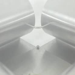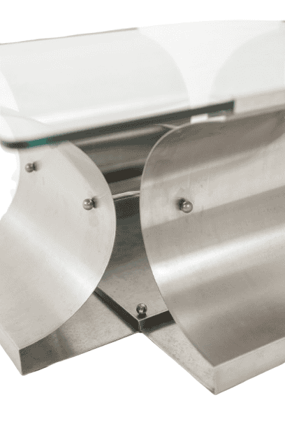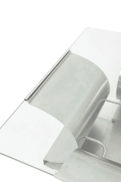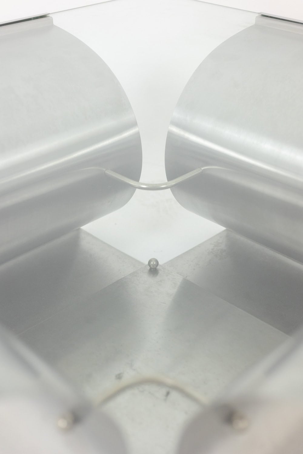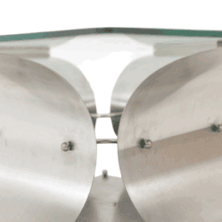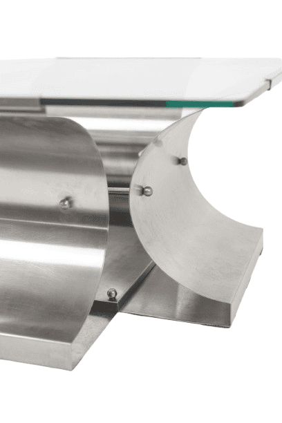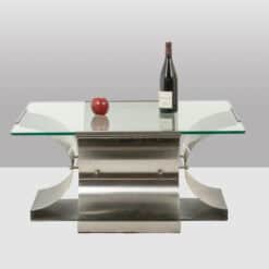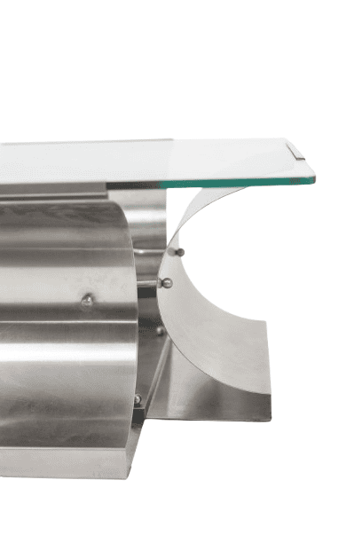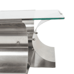 The architectural steel base creates a strong graphic presence while maintaining visual lightness through its clean, angular lines and softly reflective surface. The transparent glass top enhances the sculptural quality of the base, making it an ideal statement piece for contemporary, modernist, or collectible interiors.