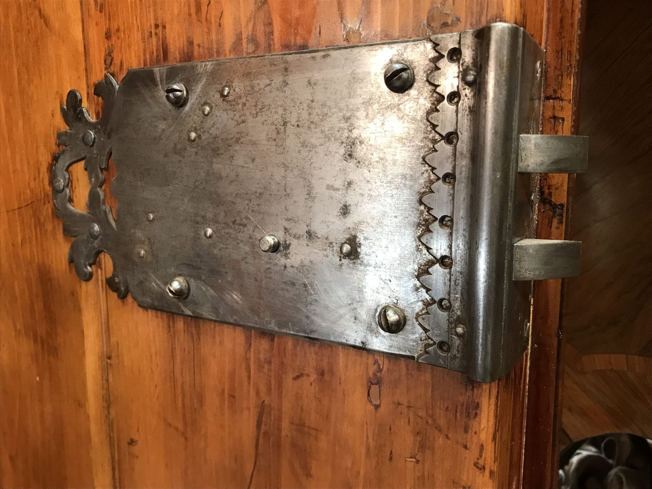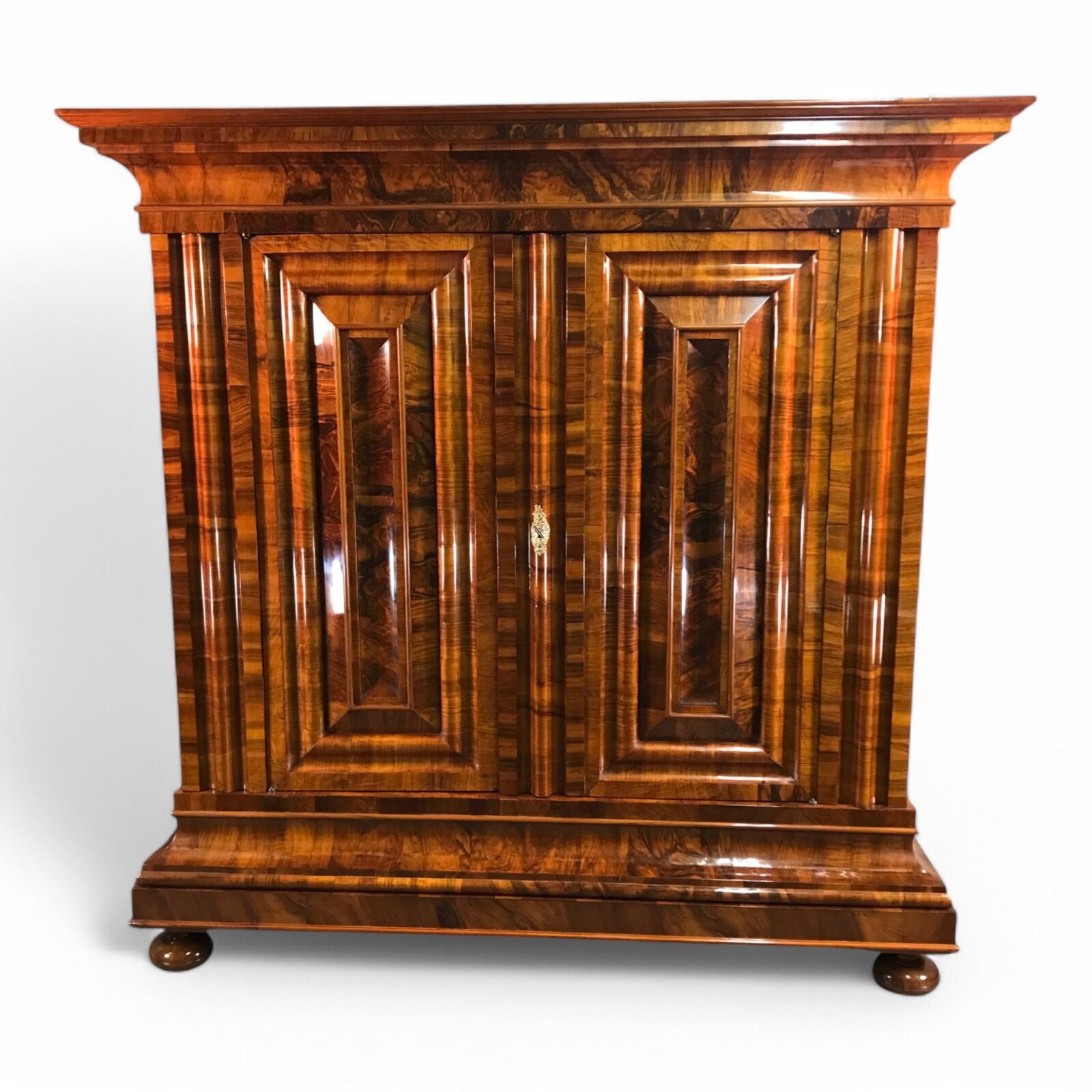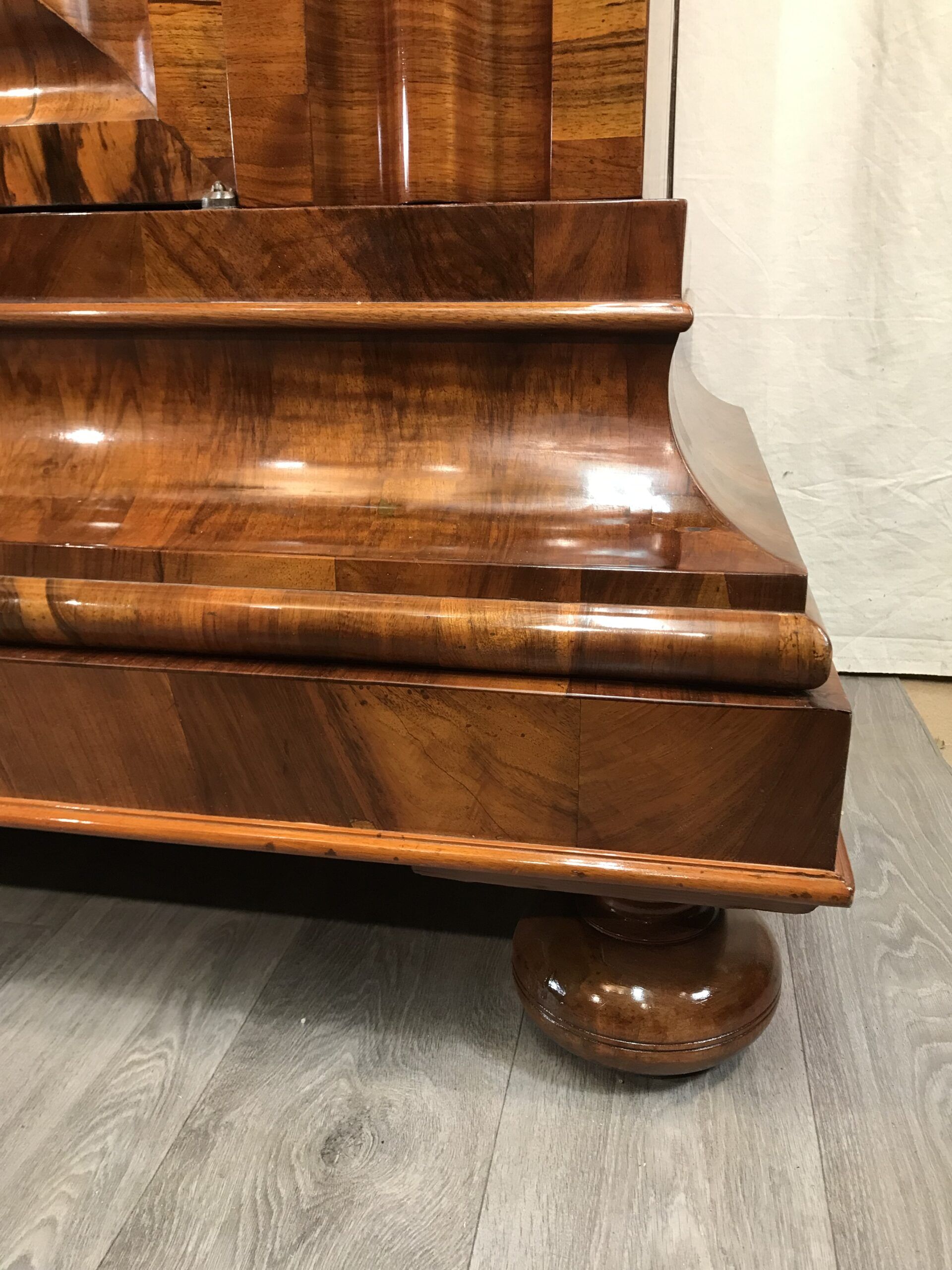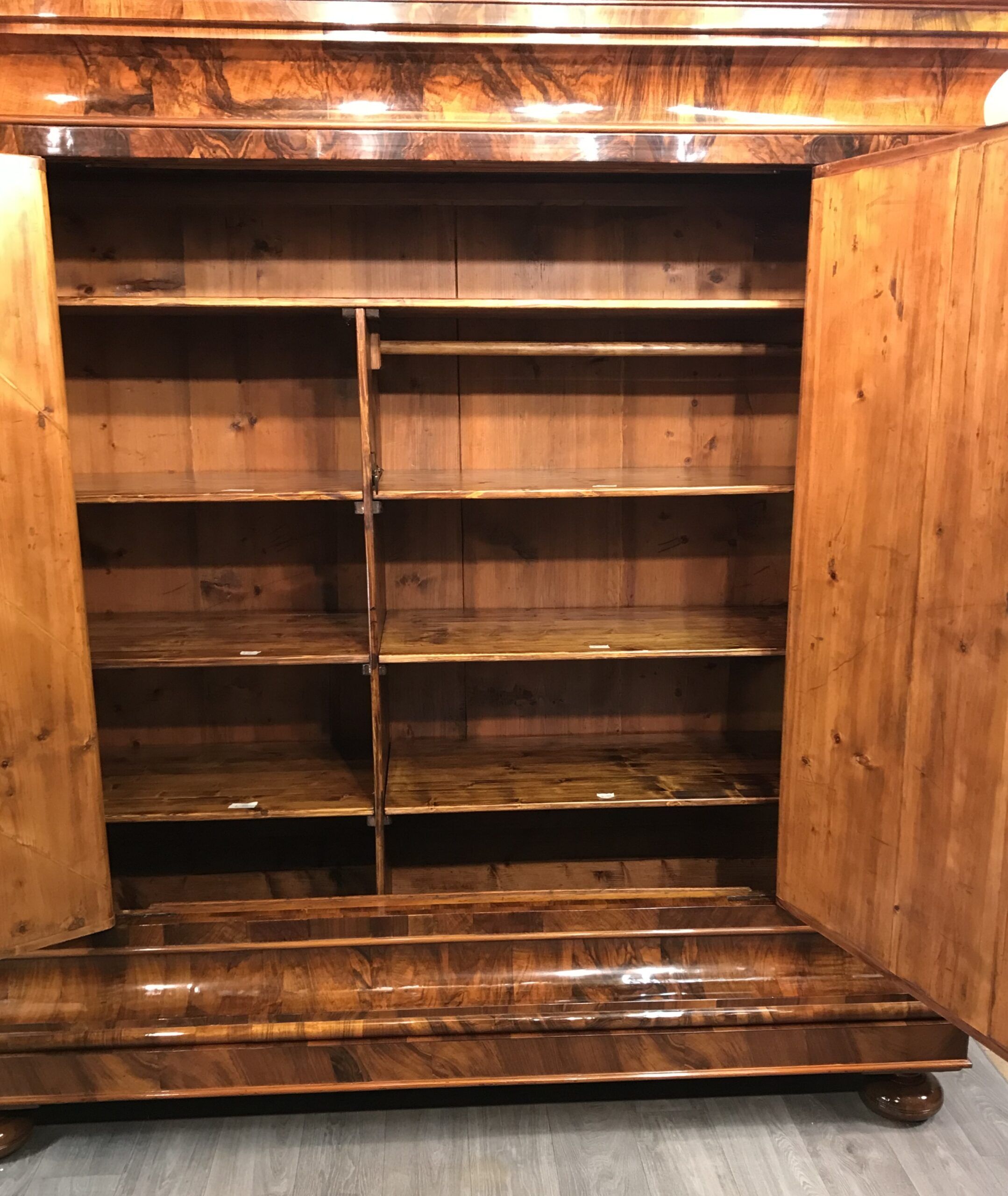 The armoire has been expertly refinished by our German workshop. The hand applied shellac polish enhances the beauty of the walnut wood grain.