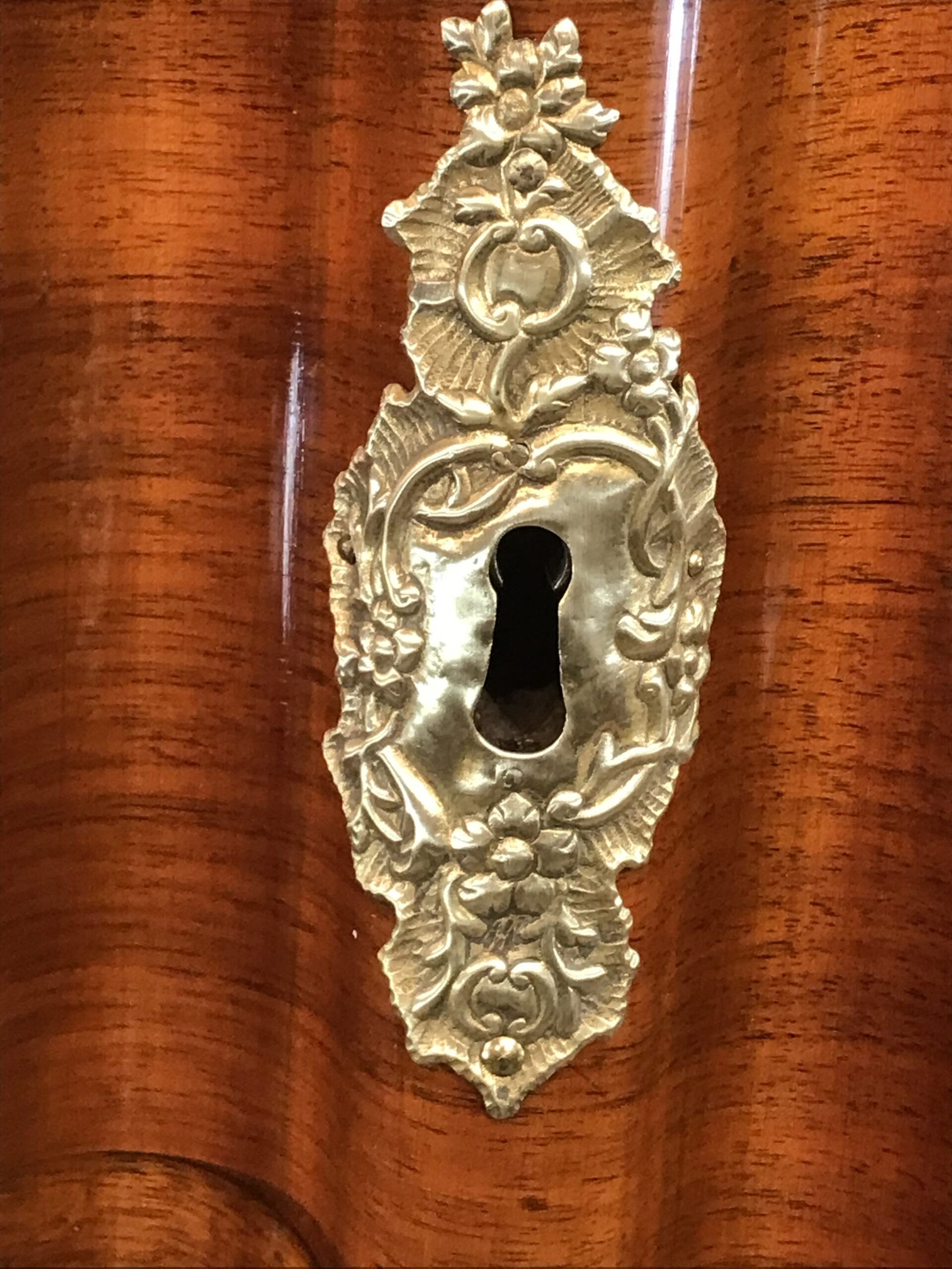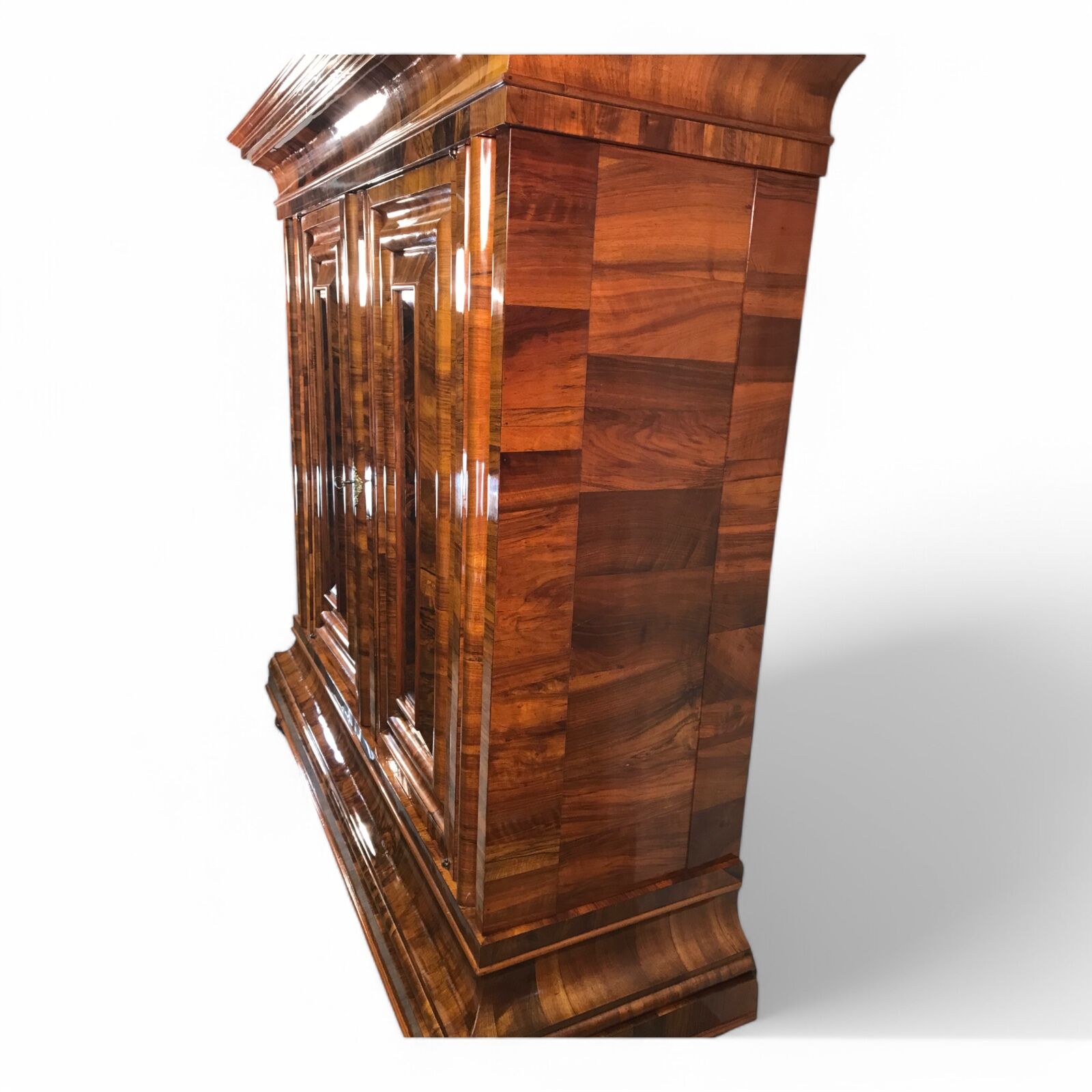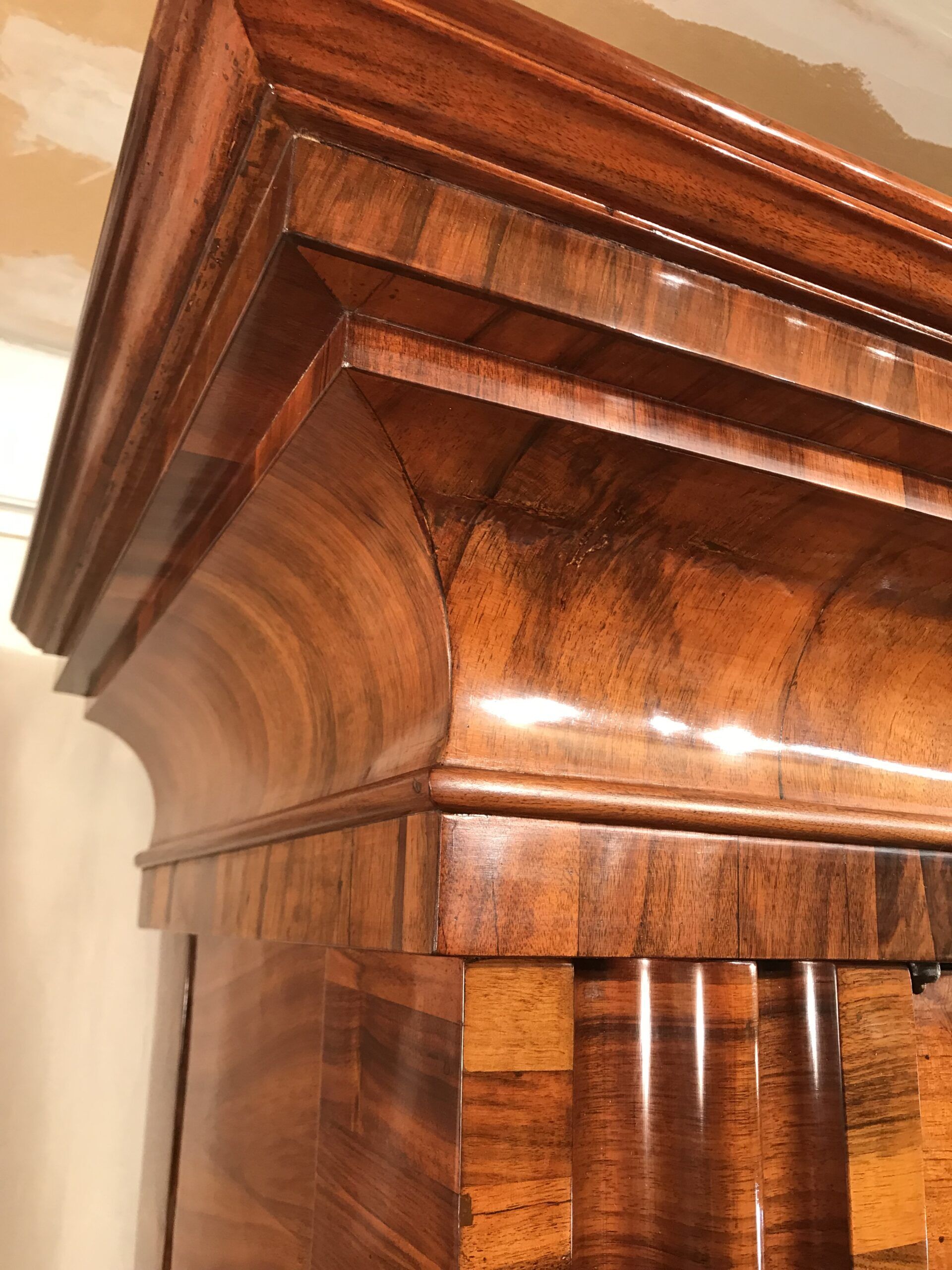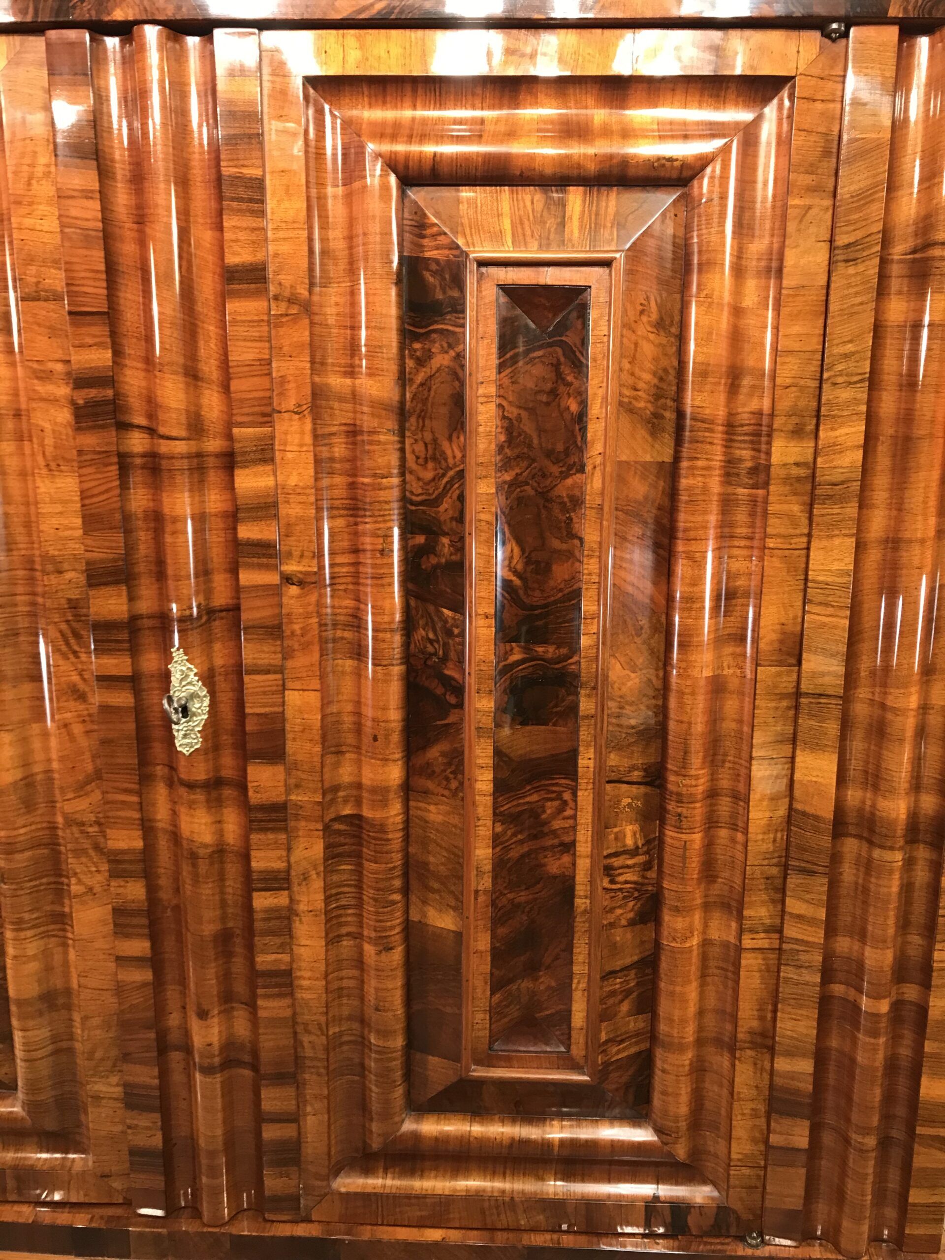 Exquisite Frankfurter Wellenschrank made around 1730. The name Wellenschrank (meaning “wavy cabinet”) refers to the defining feature of its three-dimensional, wave-like front panels. This technique, achieved through expert wood carving and layering, creates a rhythmic, undulating effect that gives the armoire a sense of movement and depth. Master craftsmen employed book matched veneers, where mirrored wood grain patterns were arranged symmetrically across the doors and moldings. This meticulous technique enhances the luxurious appearance of the piece, making each Wellenschrank unique.