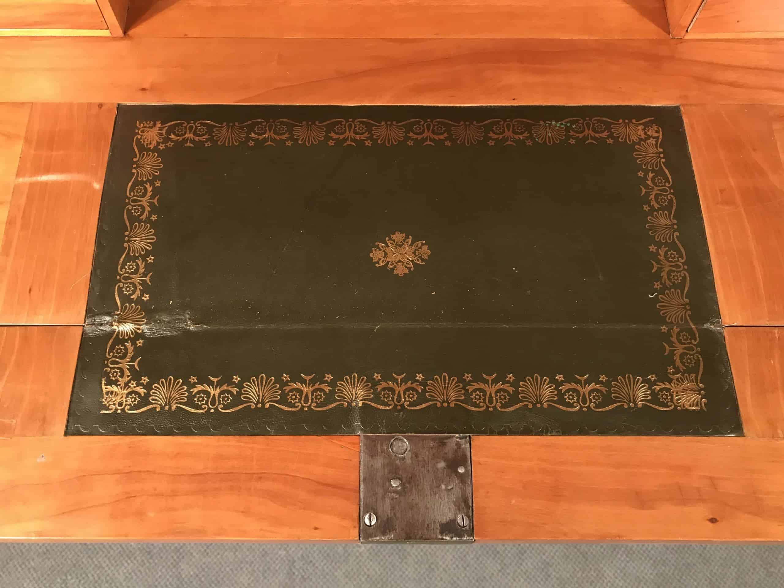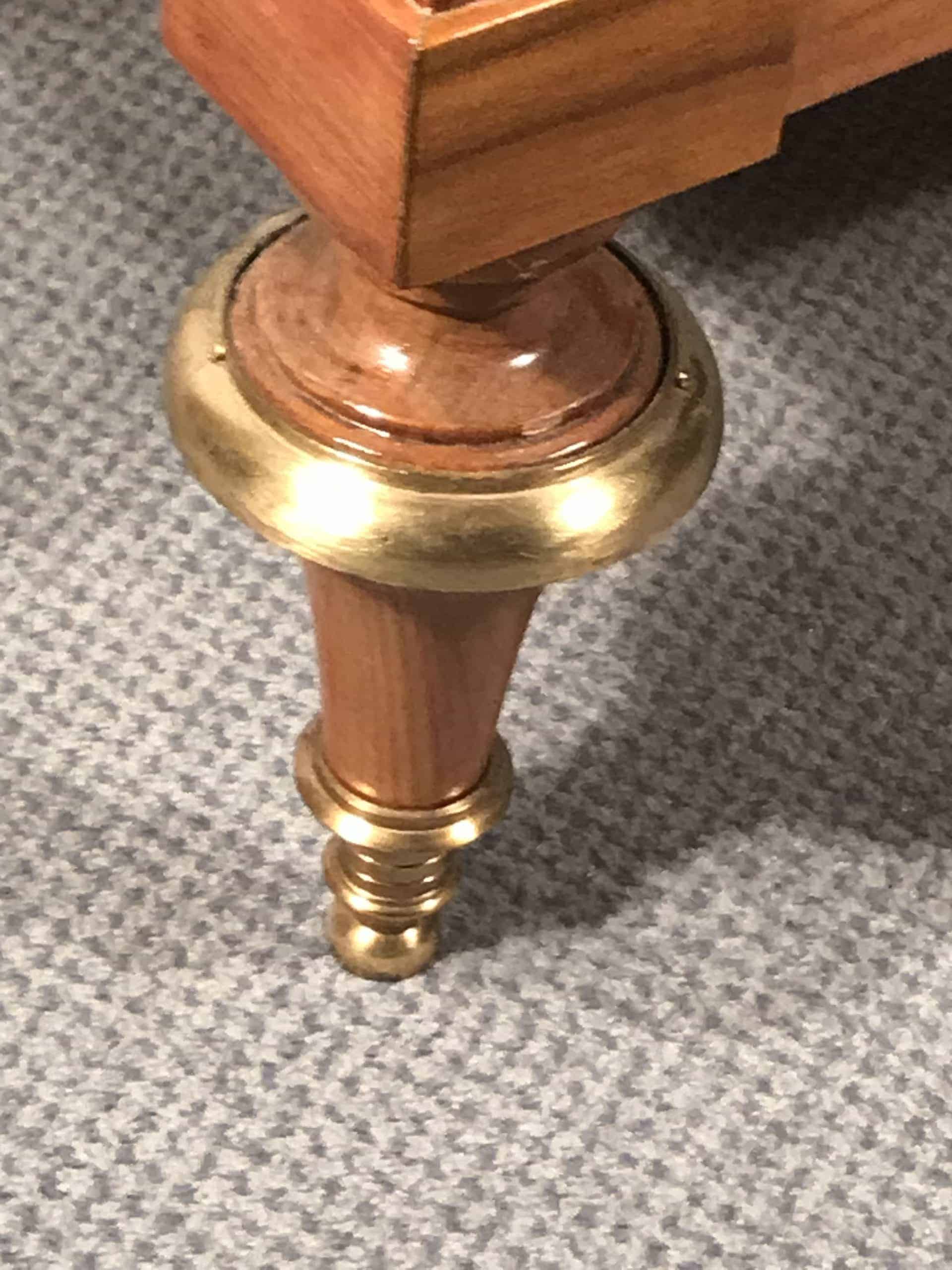 The commode is in very good condition. all the brass hardware is original. The leather was probably replaced.