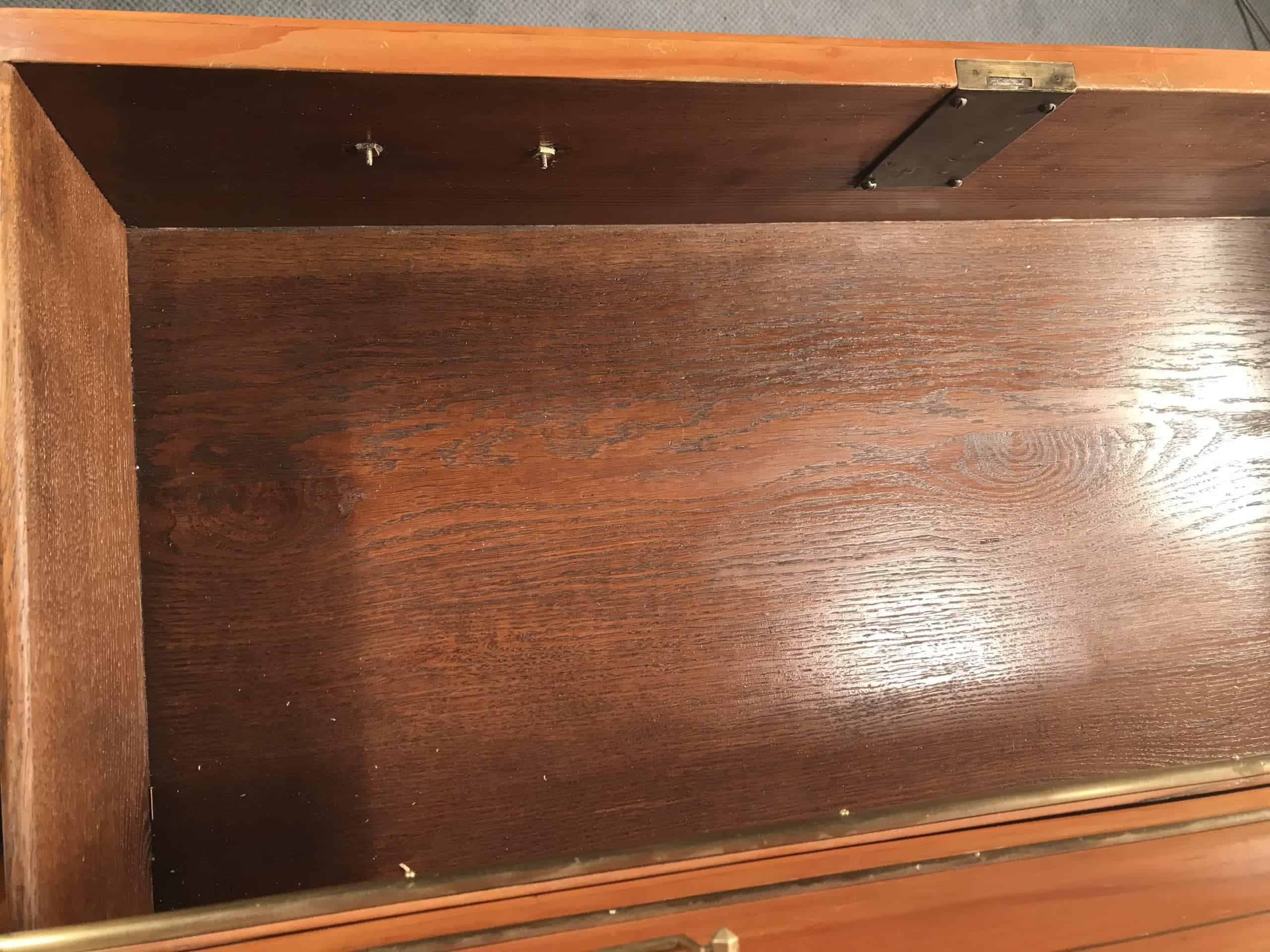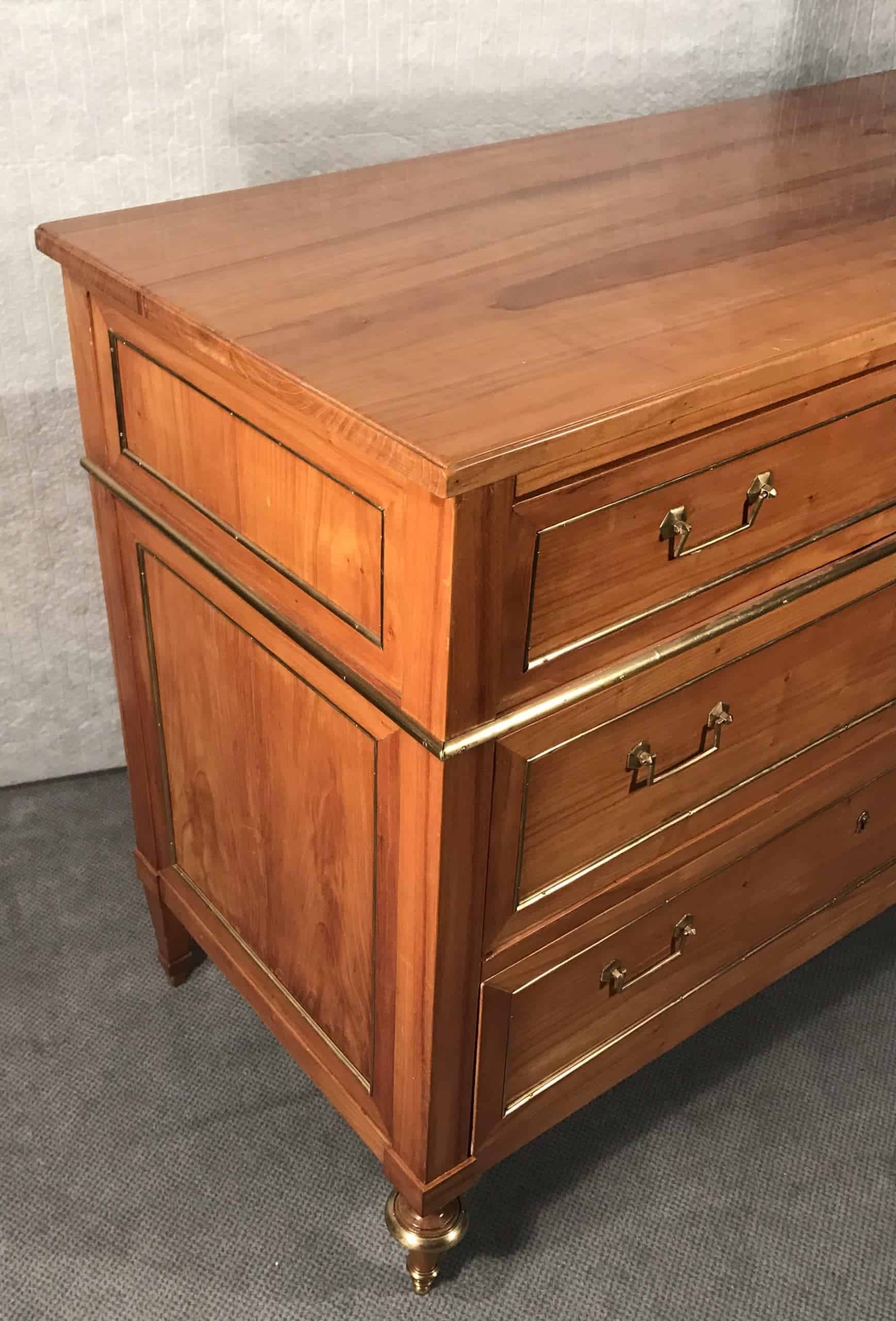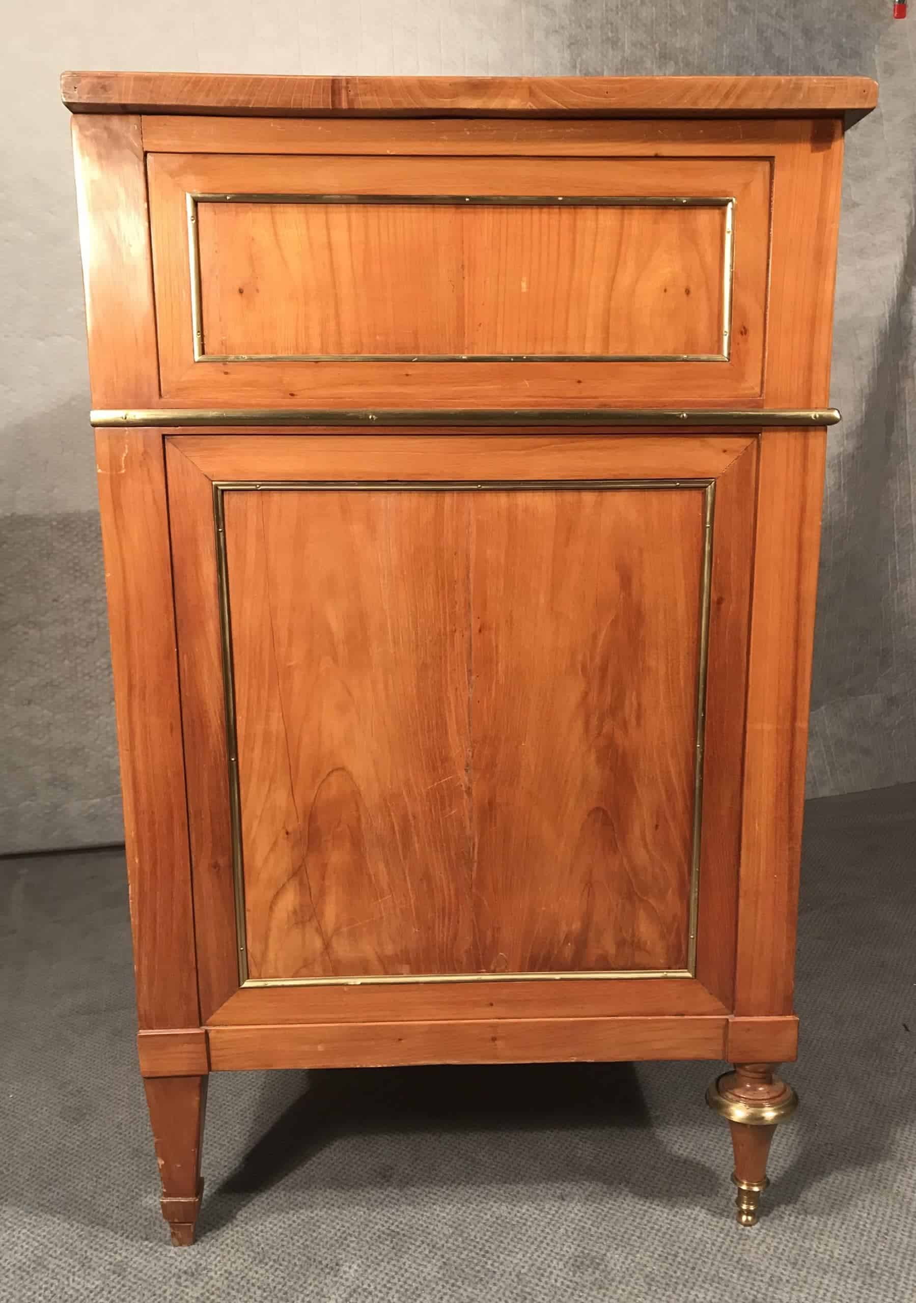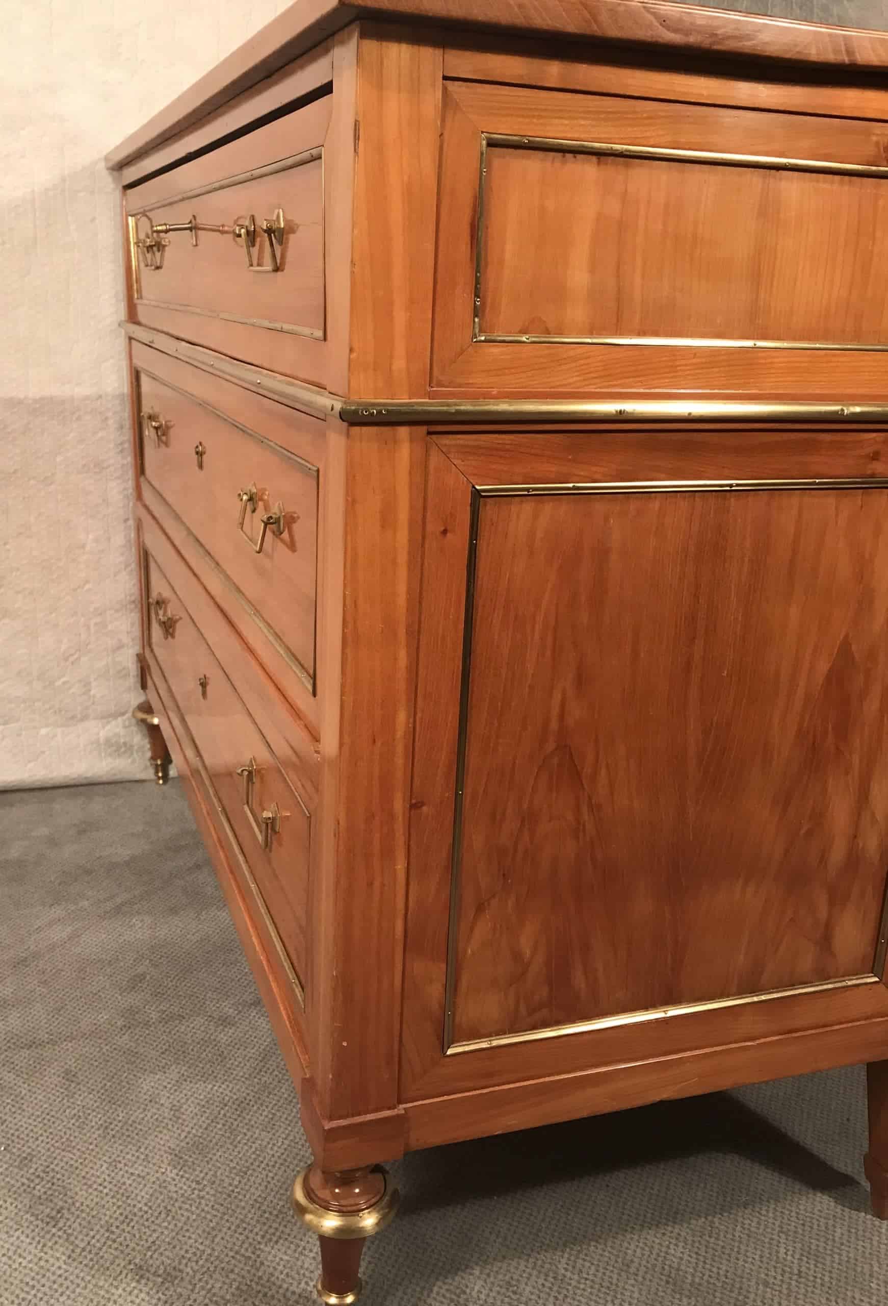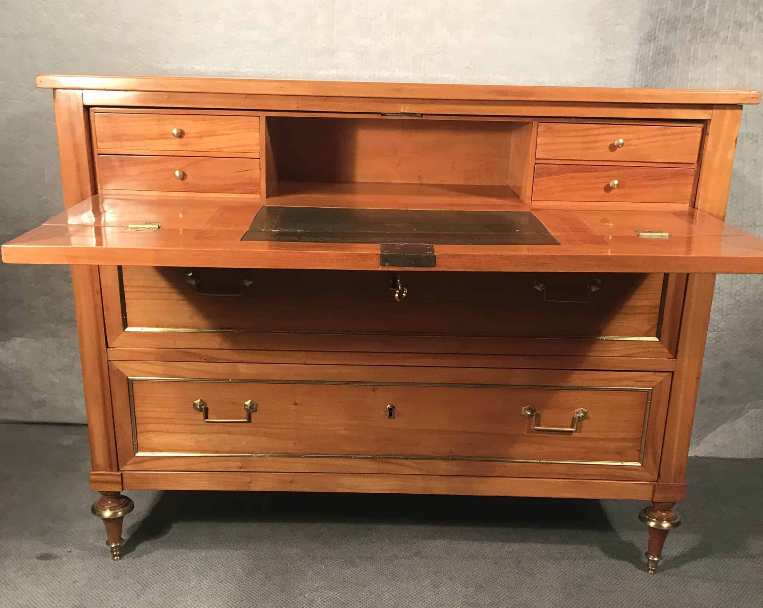 A warm colored cherry veneer embellishes this beautiful French antique chest of drawers. Behind the upper drawer is a writing top with 4 small drawers and a central open compartment. Prestigious green leather covers the middle part of the writing surface. Brass fittings and hardware decorate the drawers and feet of this exquisite piece.
