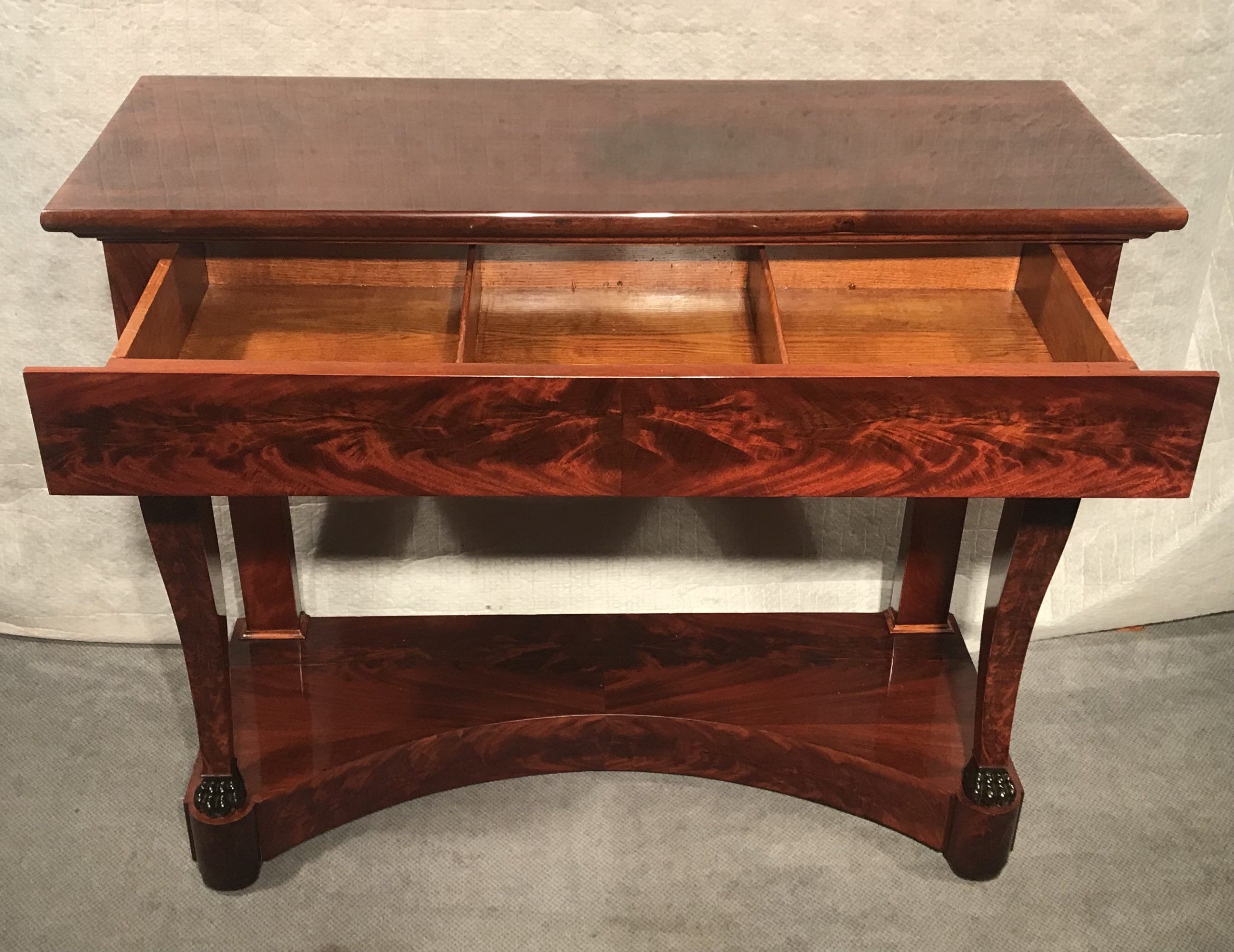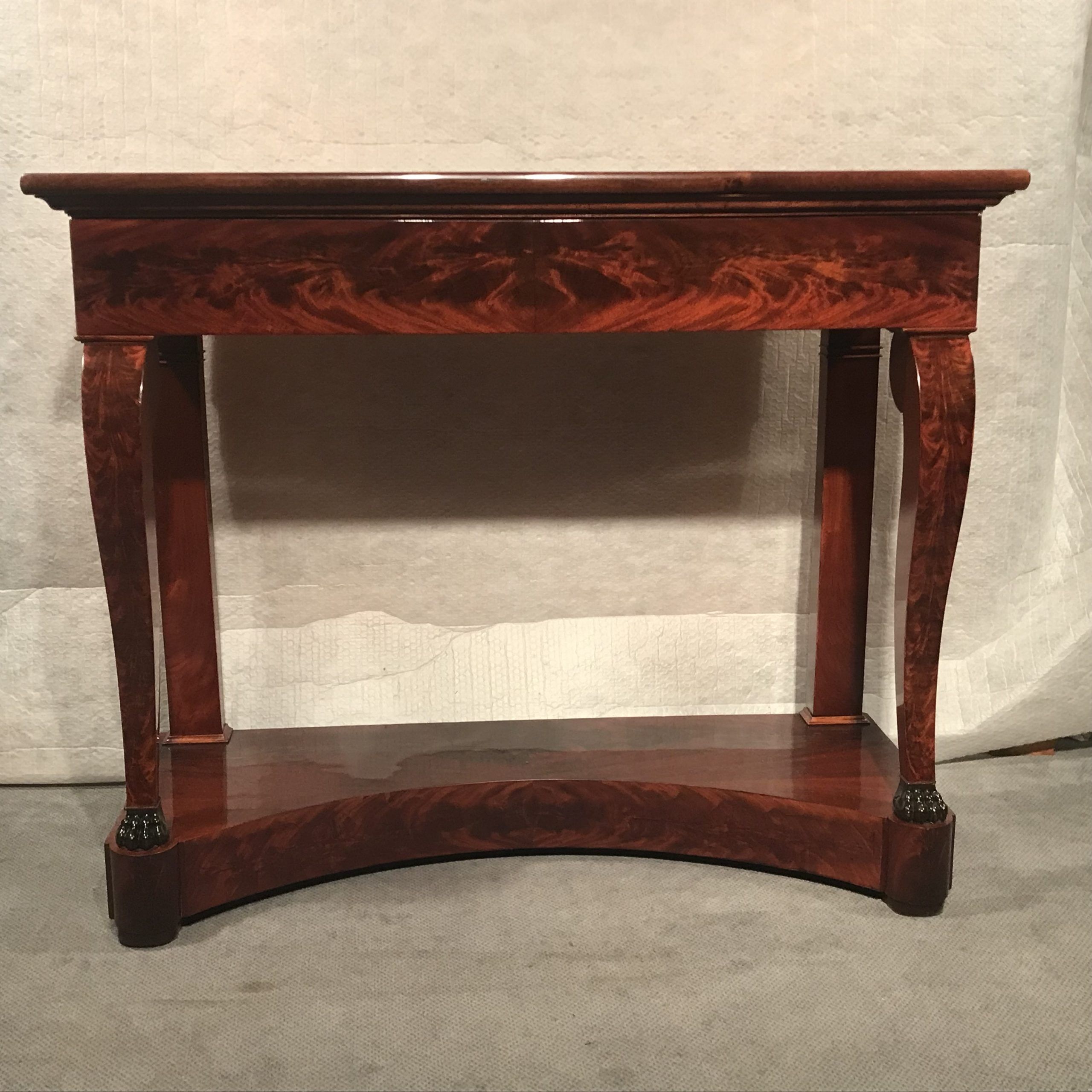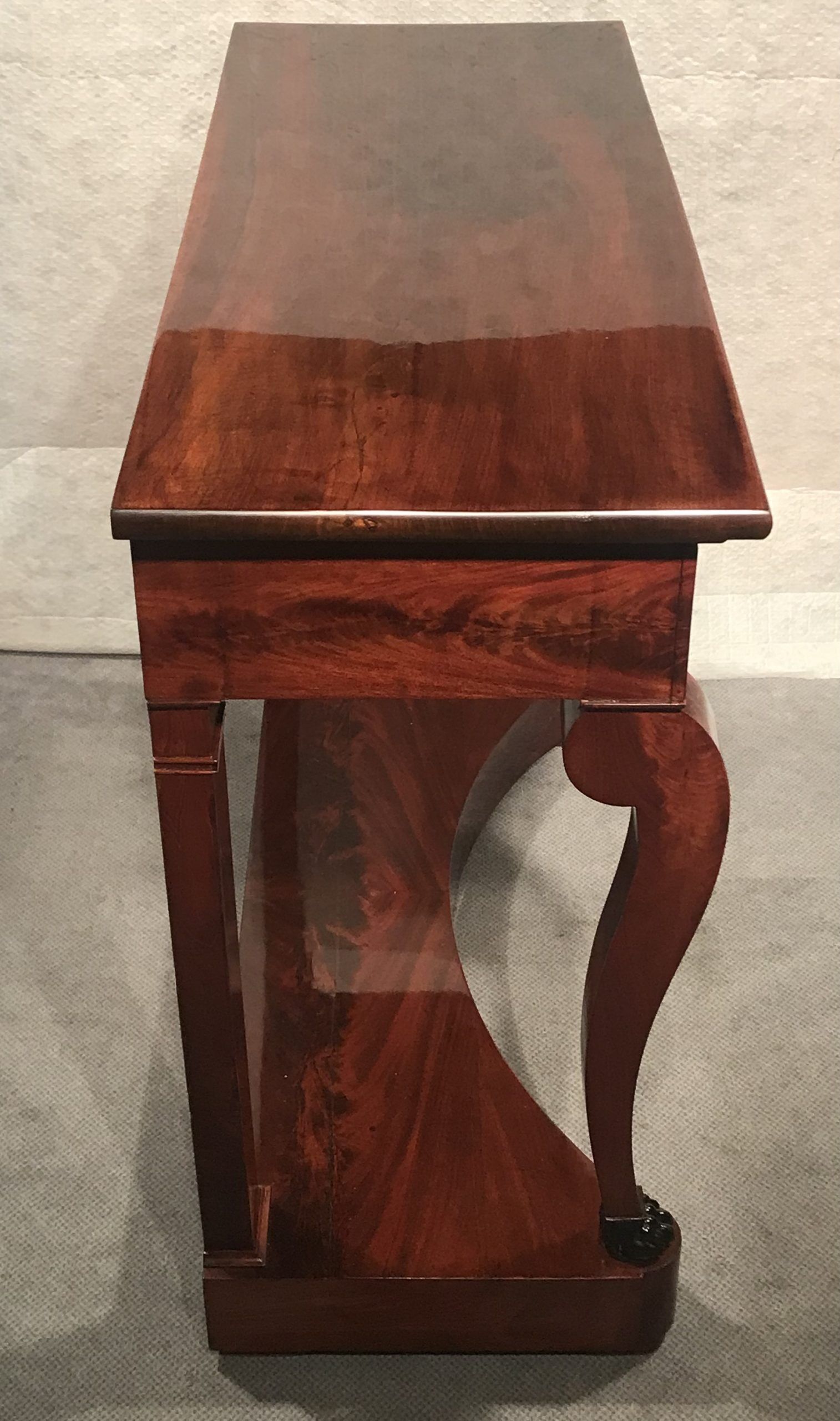 This elegant yet unpretentious French antique console table of the 19th century is a typical example of the French Restoration period. This was the period following the reign of Napoleon. The console table has in-curving square-section legs with paw feet. The table has one central drawer. The mahogany veneer of the top matches the veneer on the other parts of this beautiful console table. It comes own refinished condition with a shellac finish.