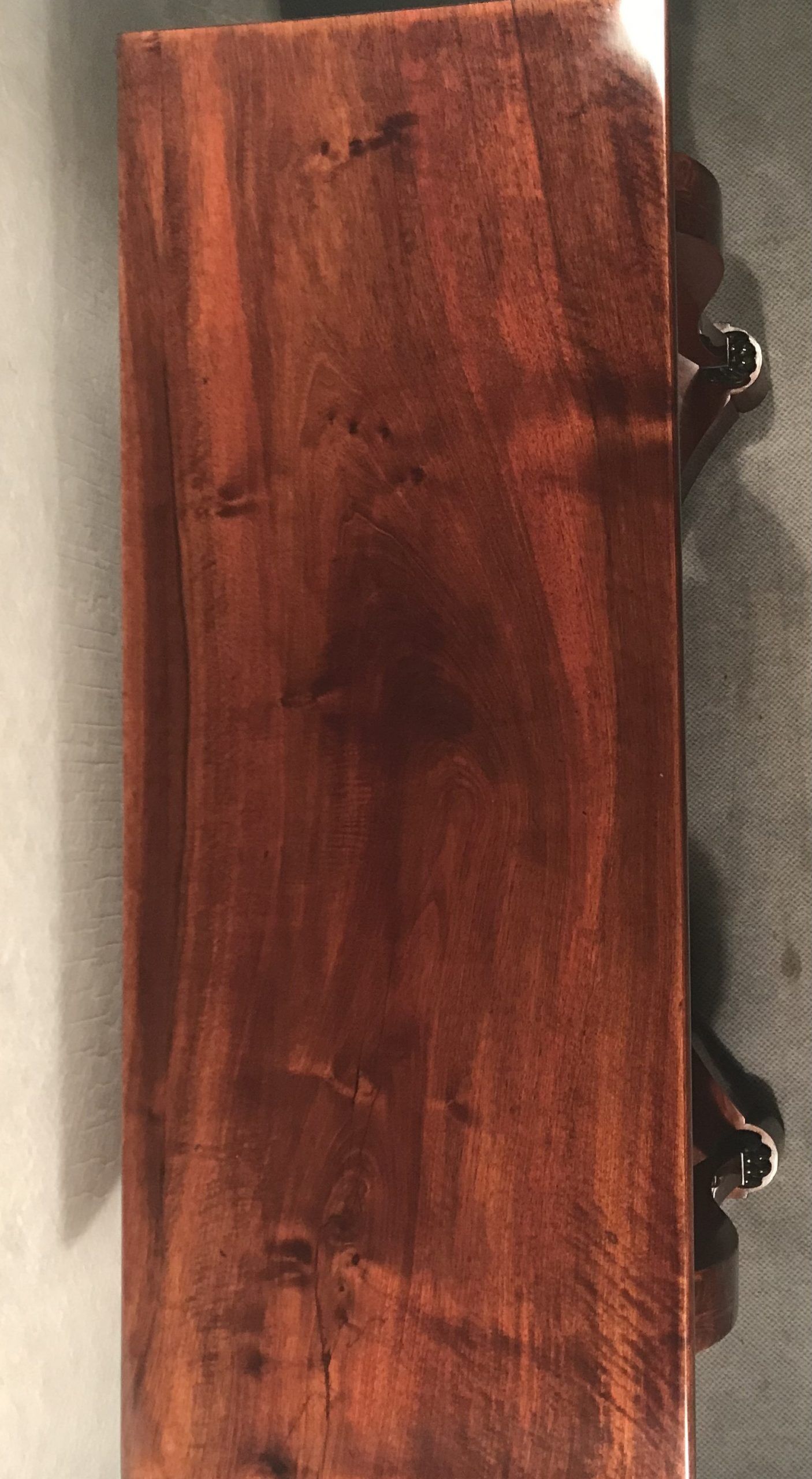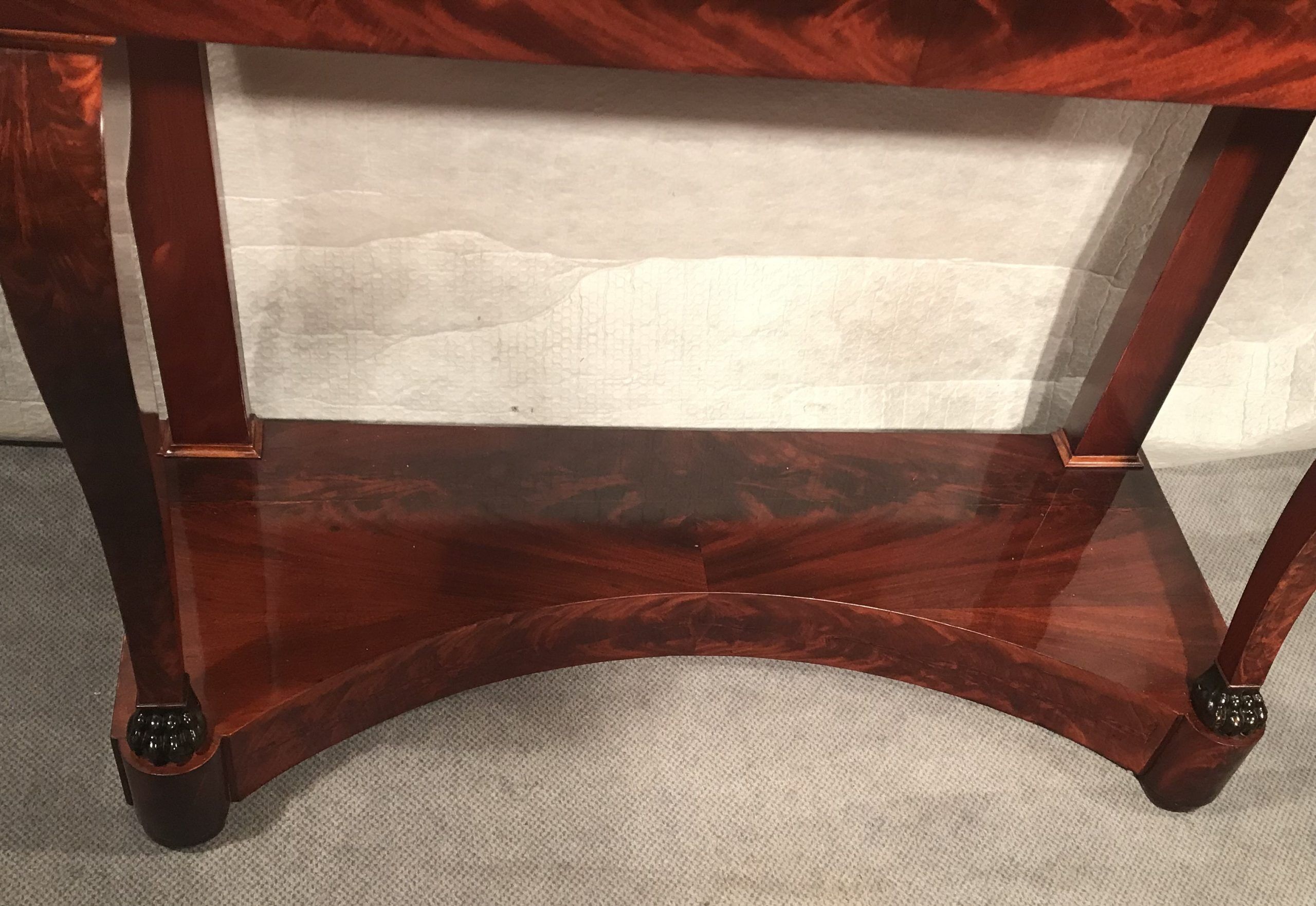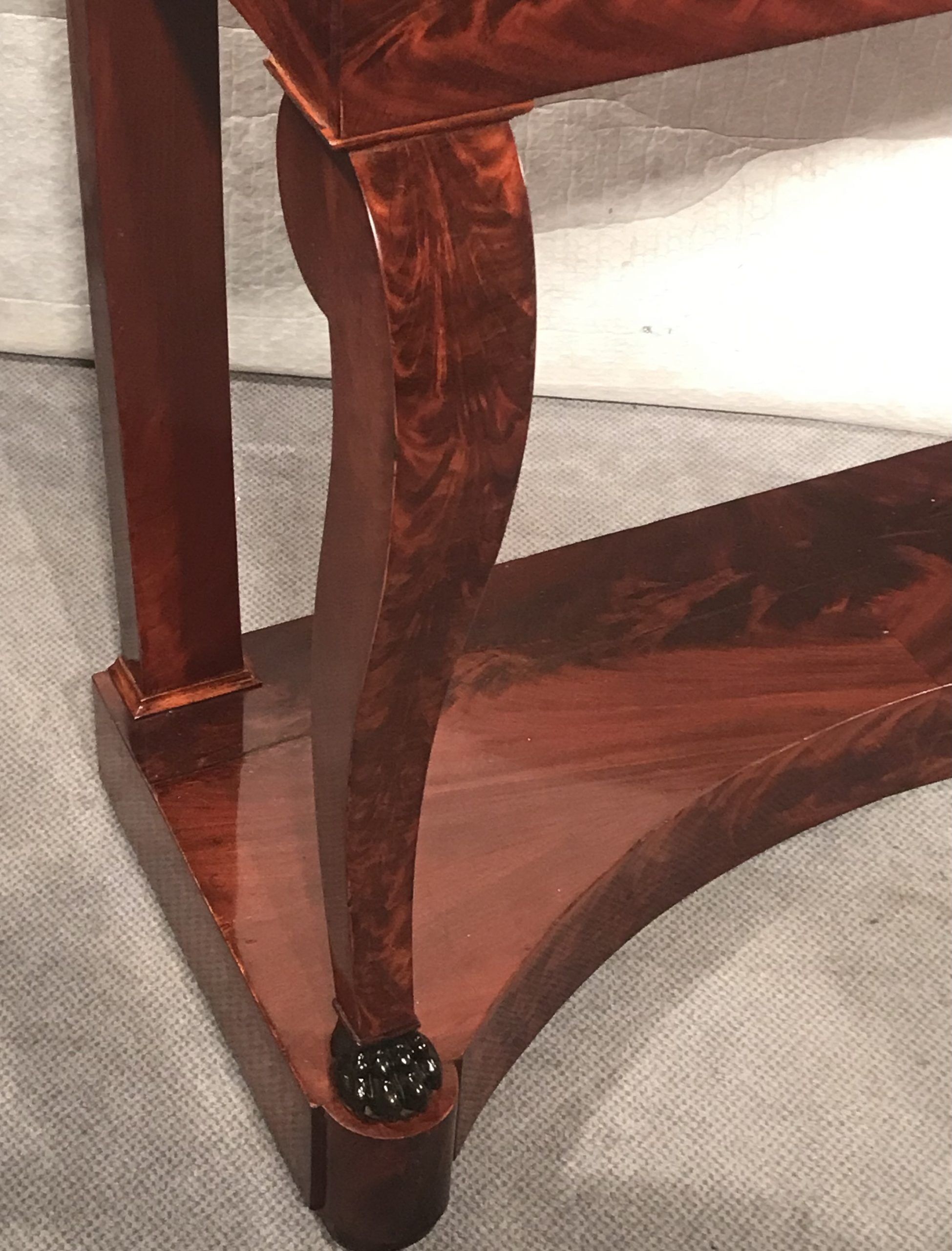 This elegant yet unpretentious French antique console table of the 19th century is a typical example of the French Restoration period. This was the period following the reign of Napoleon. The console table has in-curving square-section legs with paw feet. The table has one central drawer. The mahogany veneer of the top matches the veneer on the other parts of this beautiful console table. It comes own refinished condition with a shellac finish.