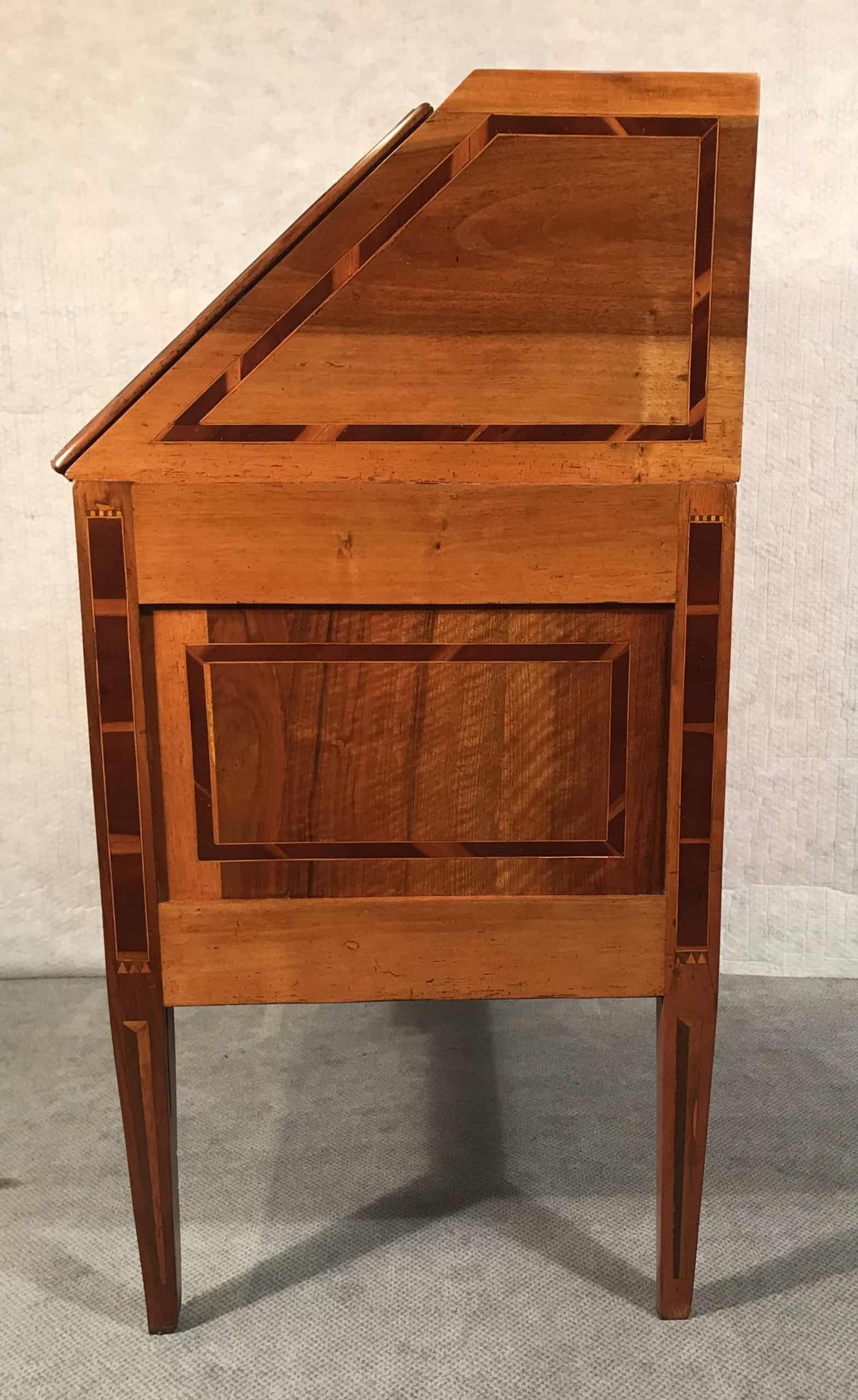 This is a must have piece for every lover of French antiques or Louis XVI furniture. The elegant 18th century secretaire features a beautiful walnut veneer. Complemented is the walnut veneer by a superb geometric designed marquetry, composed of plum wood and satinwood.
