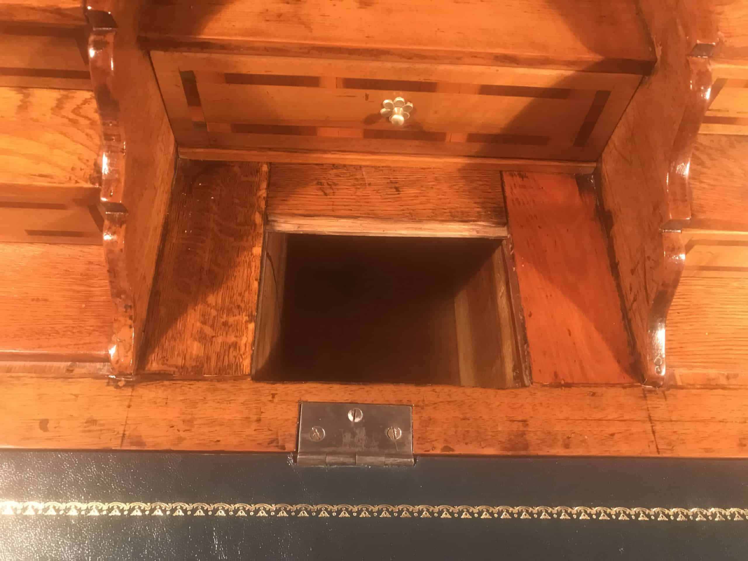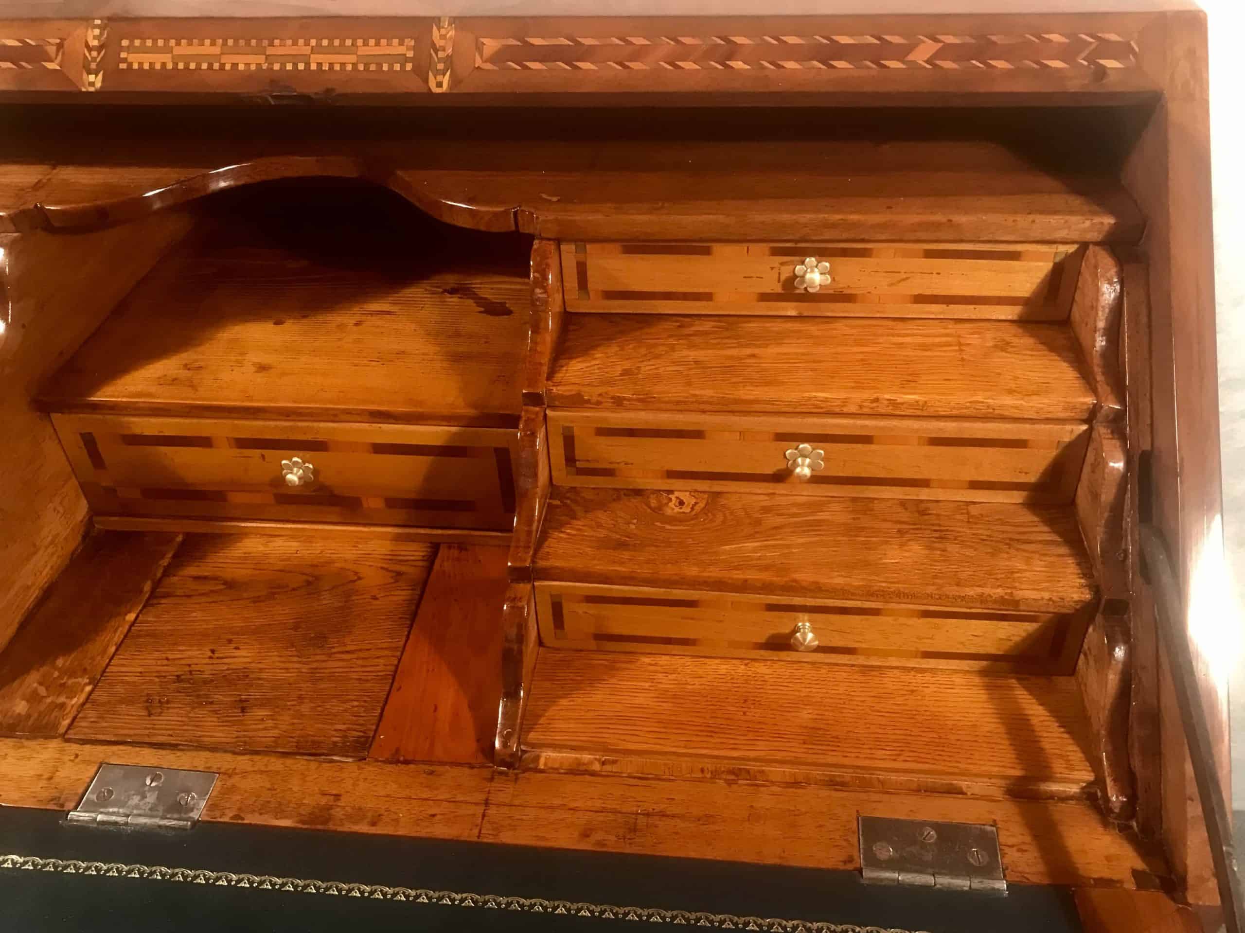 The marquetry bands frame the mirrored walnut veneer on the outside of the writing top and the veneer and hardware on the two bottom drawers. The inside with its central compartment and 7 small drawers repeats this motif beautifully in a slightly simpler manner.