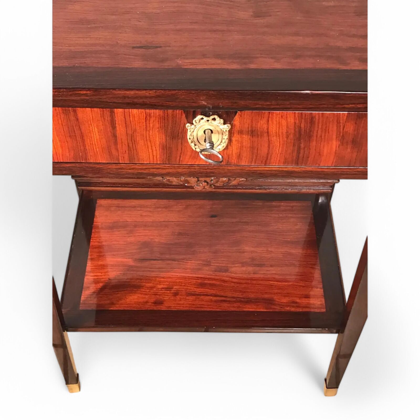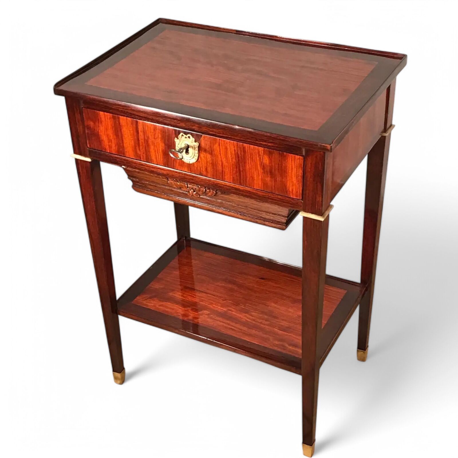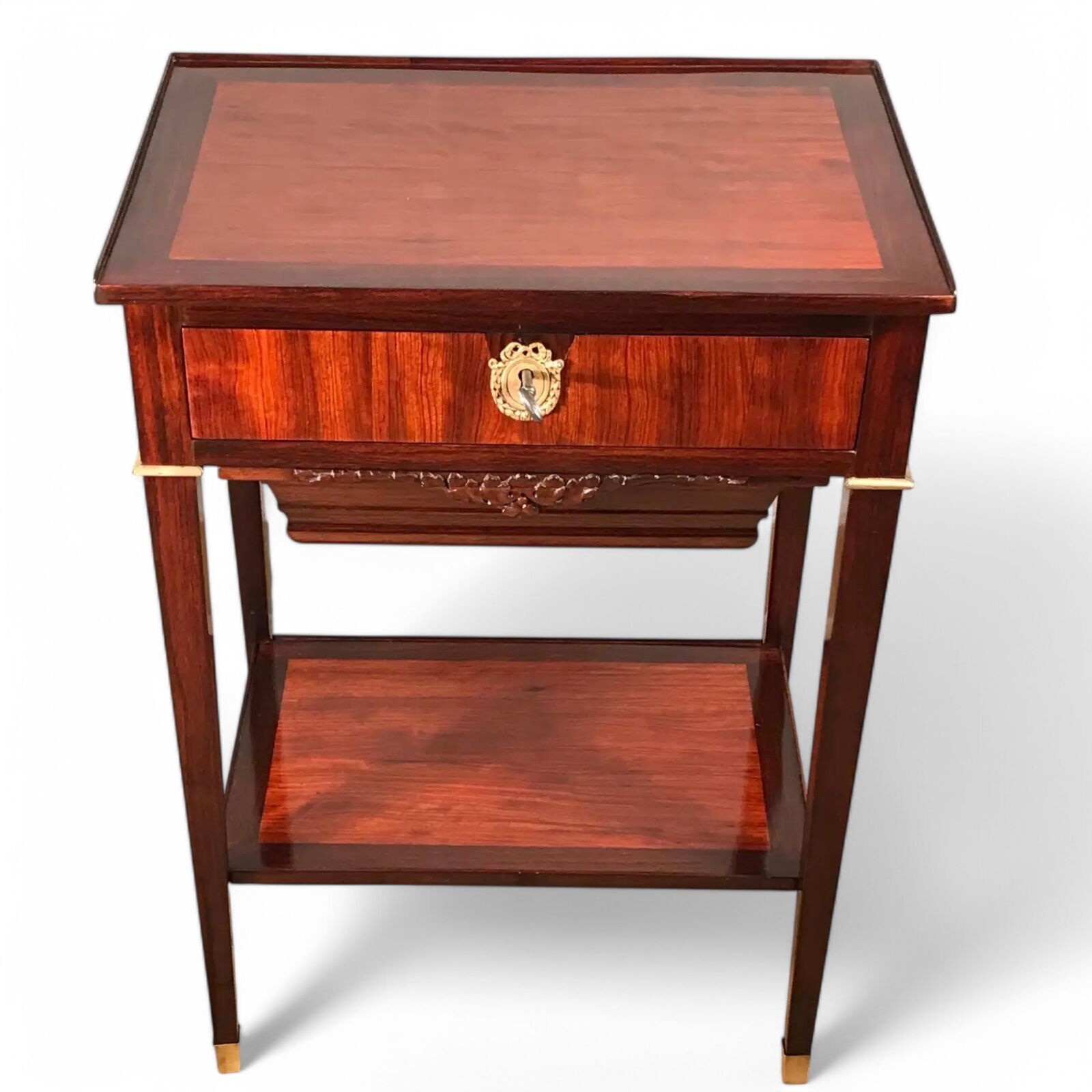 The piece includes a central drawer and a lower wool drawer with a finely decorated front, making it ideal as a sewing table. A third, lower shelf adds functionality and visual balance, offering extra space for storage or display.