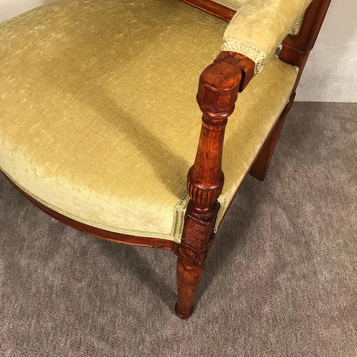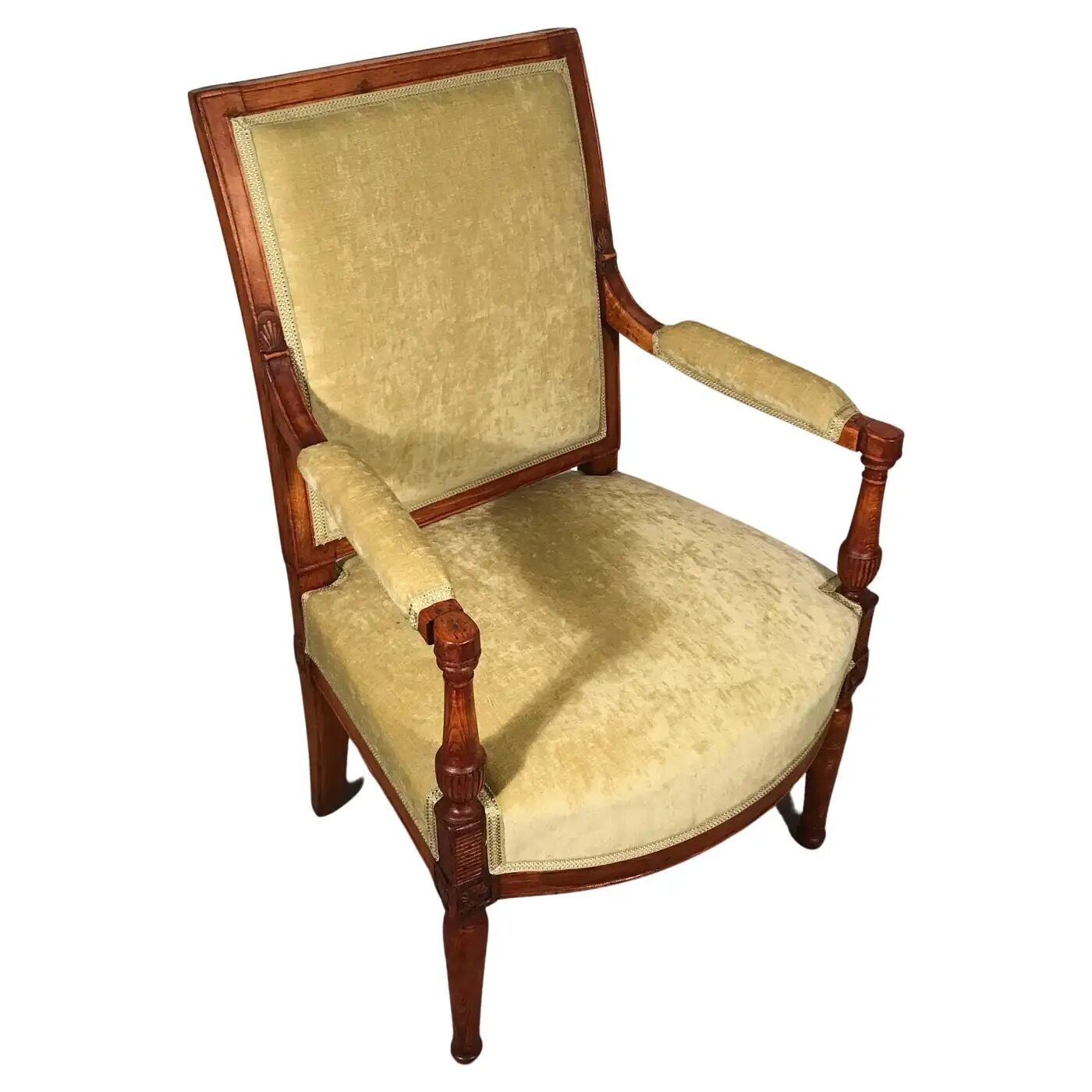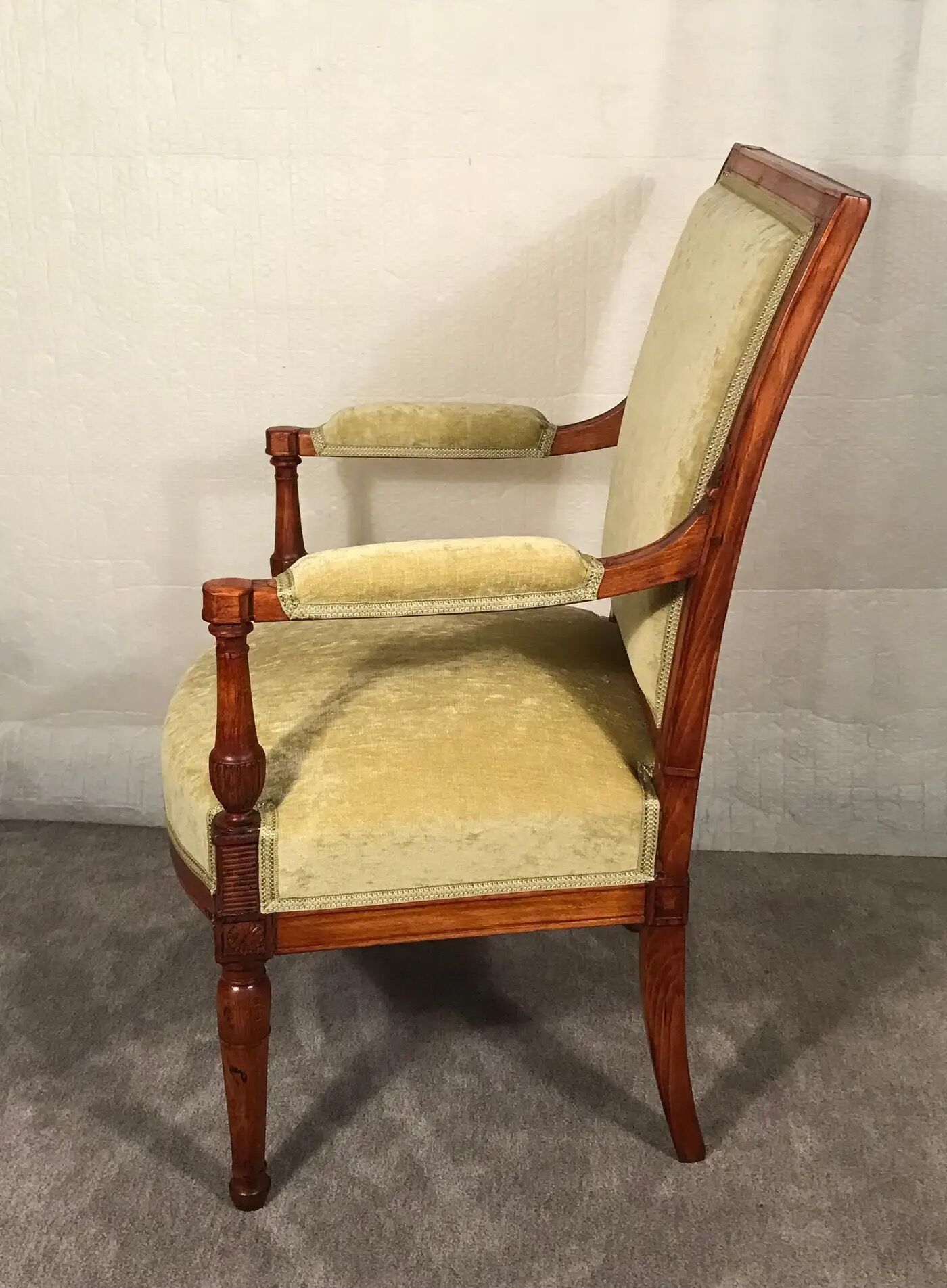 Discover the elegance and historical charm of this Directoire armchair, originating from France around 1800. This piece showcases a meticulously carved walnut frame, reflecting the refined craftsmanship of the period.