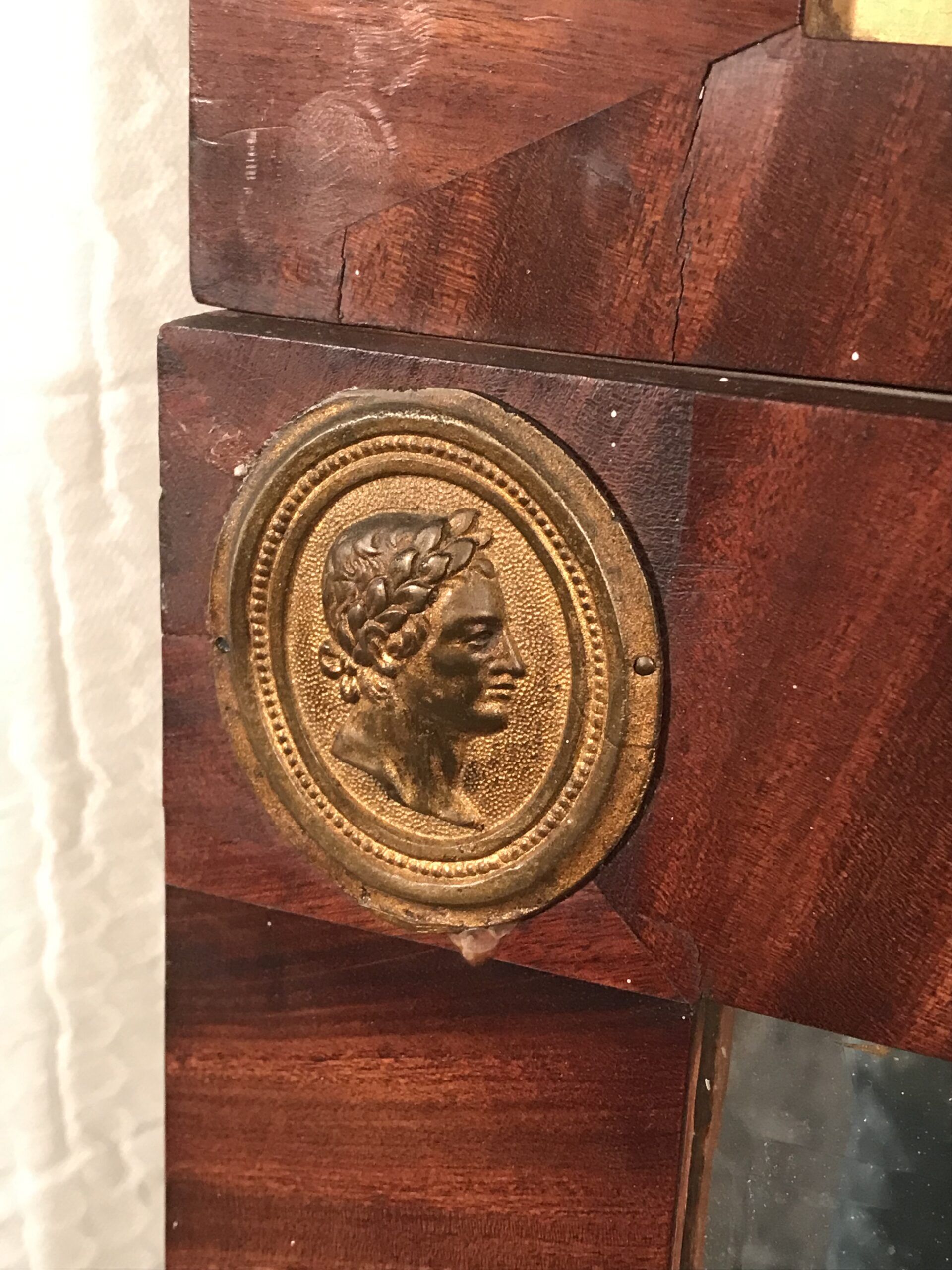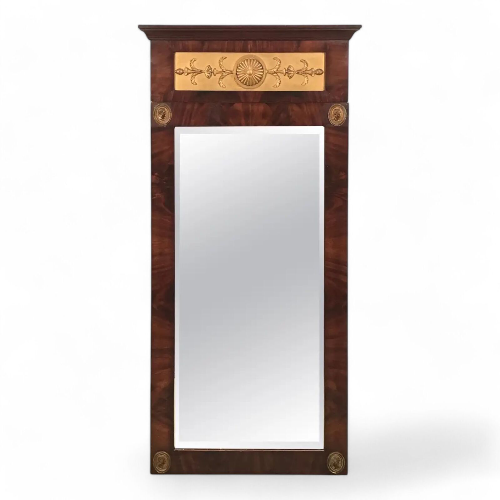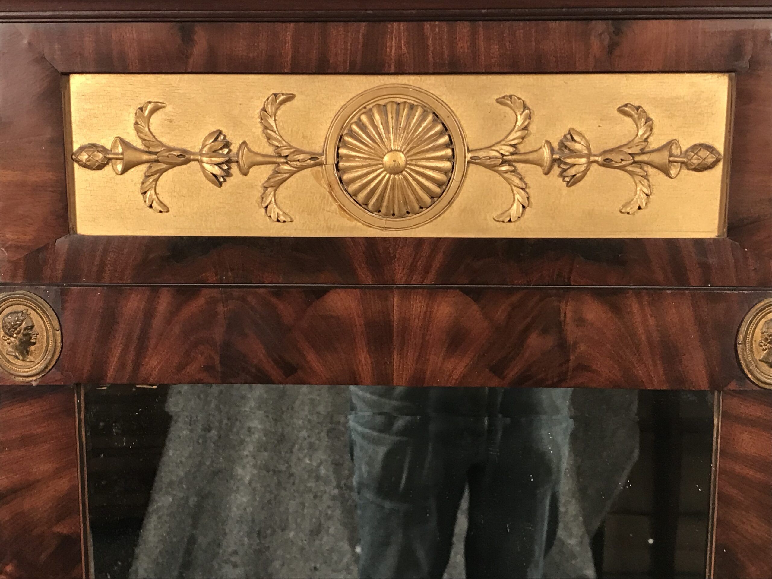 French Empire Mirror (1800-1810) Mahogany Frame with Brass Antique Head and gilt wood Floral Decorations