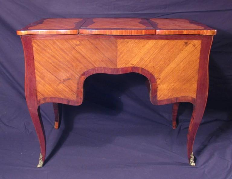 For the beautiful marquetry of this antique dressing table, the maker combined three types of veneer: Rosewood, kingwood and satinwood. Raised on curved and slender legs the dressing table has four exterior drawers, a pull-out writing top, a built in flip up central mirror. On one side there is an area to place cosmetic containers and on the other side an area to place beauty products.