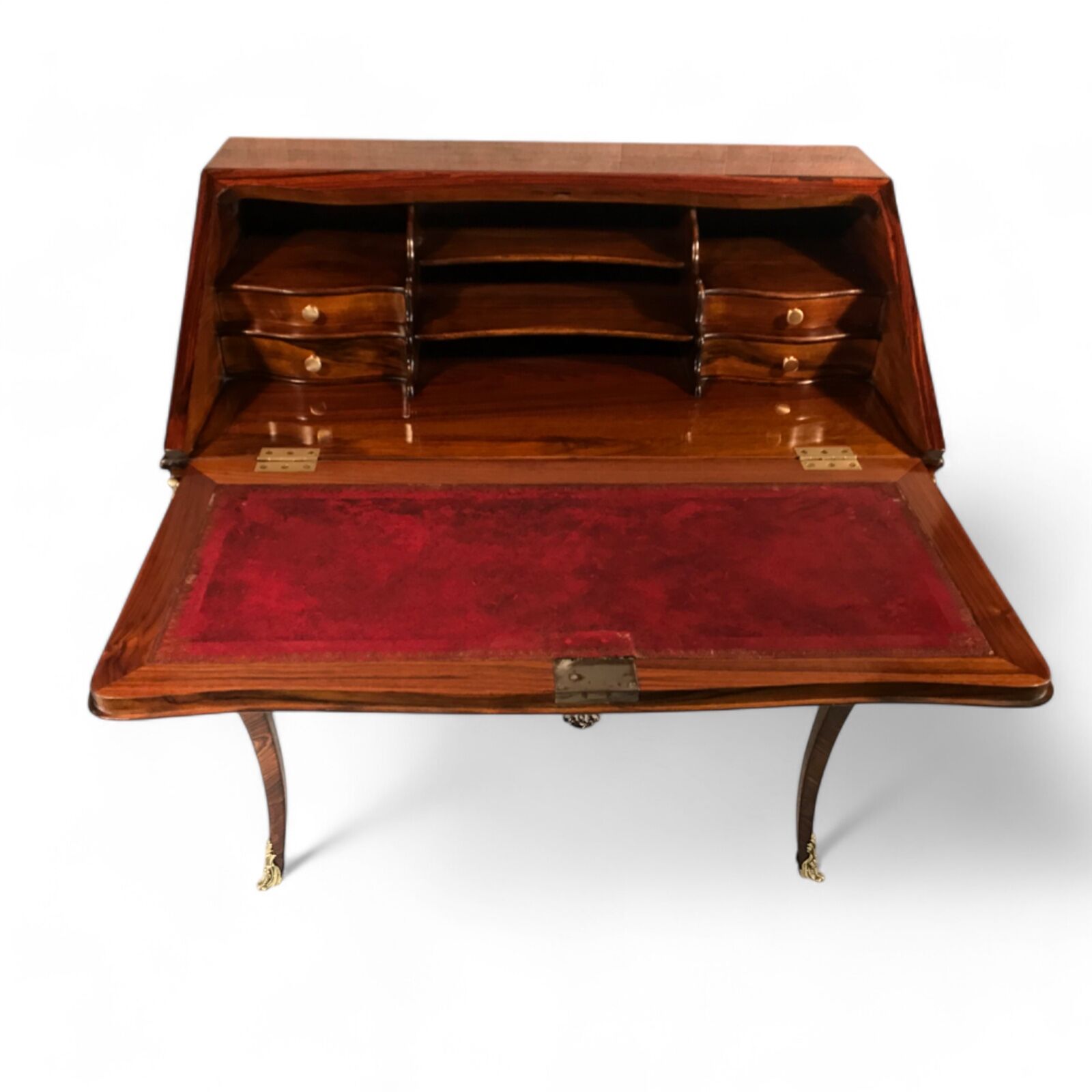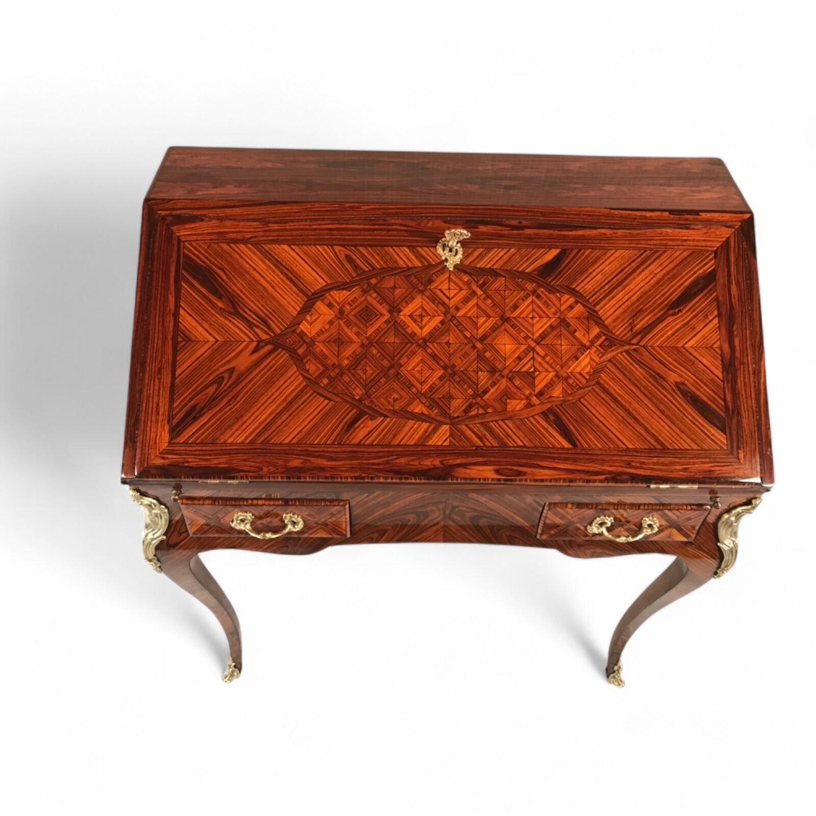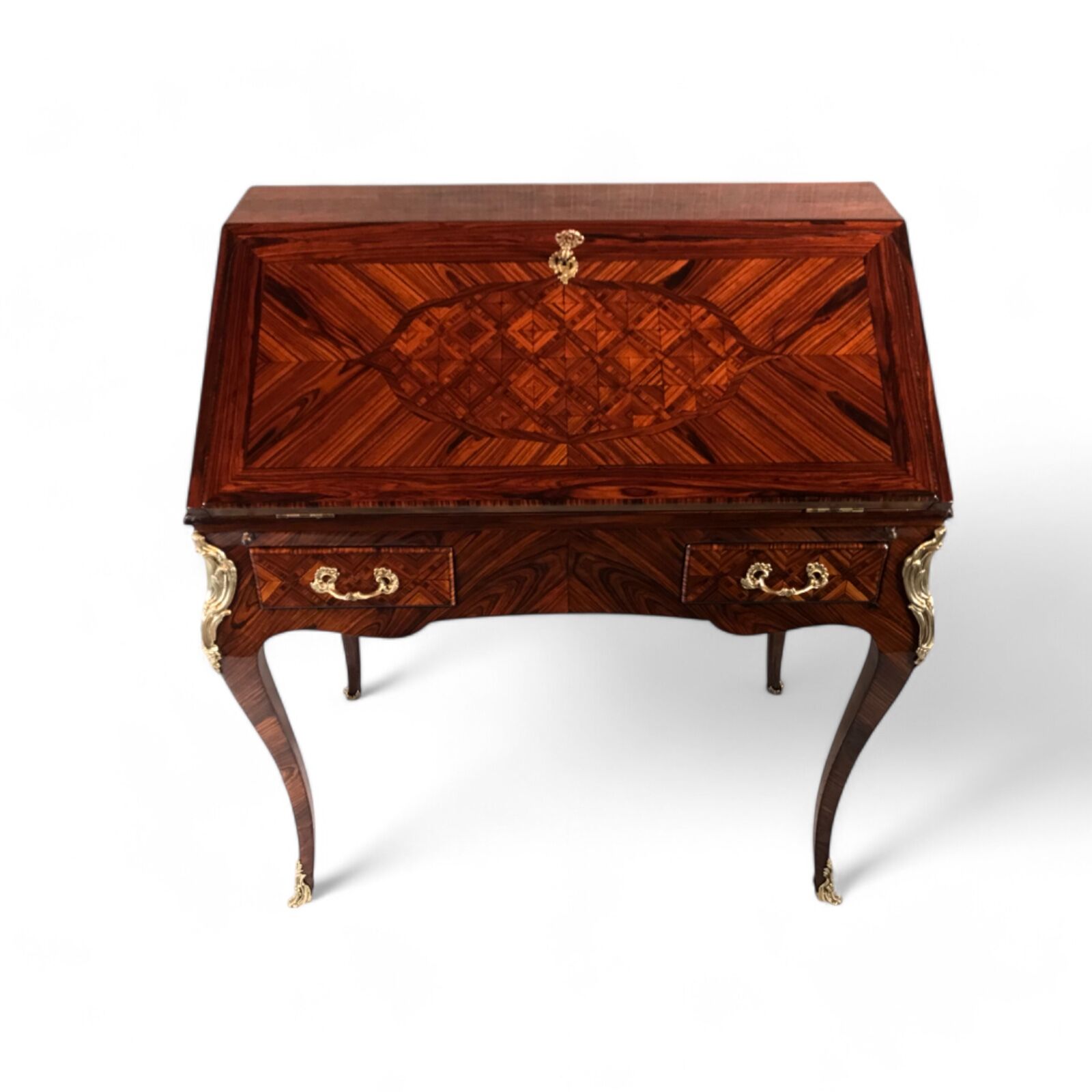 This stunning French Louis XV secretary desk, crafted in Paris around 1750, is a remarkable example of 18th-century artistry and sophistication. Standing on four elegant curved legs adorned with bronze accents and applications, this desk exudes timeless charm and regal elegance. The writing flap showcases an exceptional marquetry design, highlighted by a central cube marquetry medallion, a hallmark of superior craftsmanship. Inside, you’ll find a thoughtfully organized layout featuring four drawers and four open compartments, offering both beauty and functionality. Luxurious red leather lines the writing surface, adding a touch of refinement. Beneath the writing flap, two additional drawers provide ample storage while maintaining the desk’s streamlined silhouette. This exceptional piece has been beautifully refinished to preserve its historical integrity while enhancing its natural beauty. It is in wonderful condition, ready to grace your home with its timeless allure. Whether displayed in a study, living room, or entryway, this 18th-century Louis XV secretary desk is a perfect blend of form and function, ideal for antique lovers and collectors seeking a rare and elegant treasure.