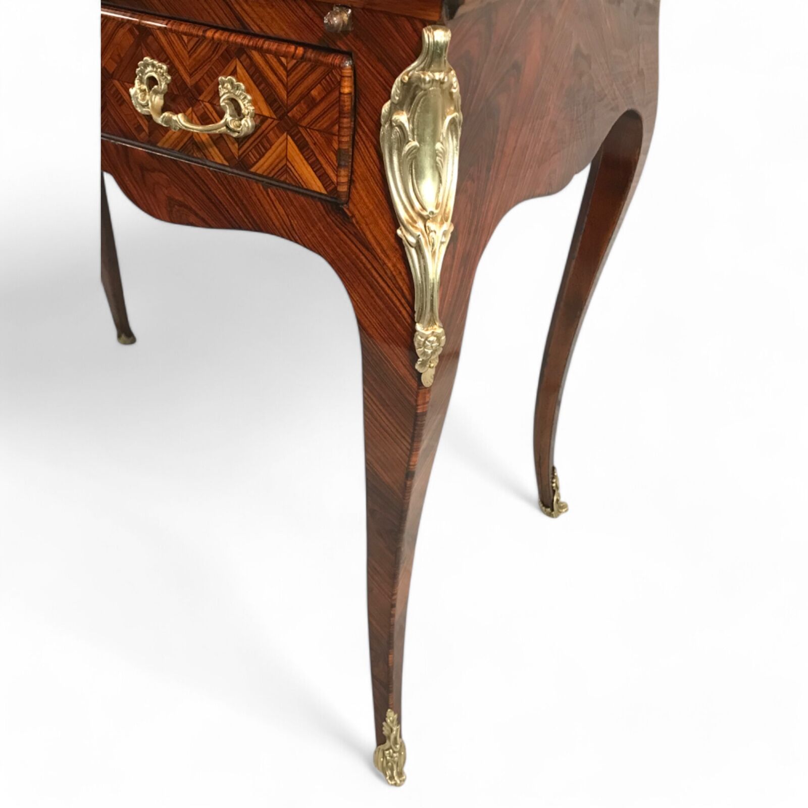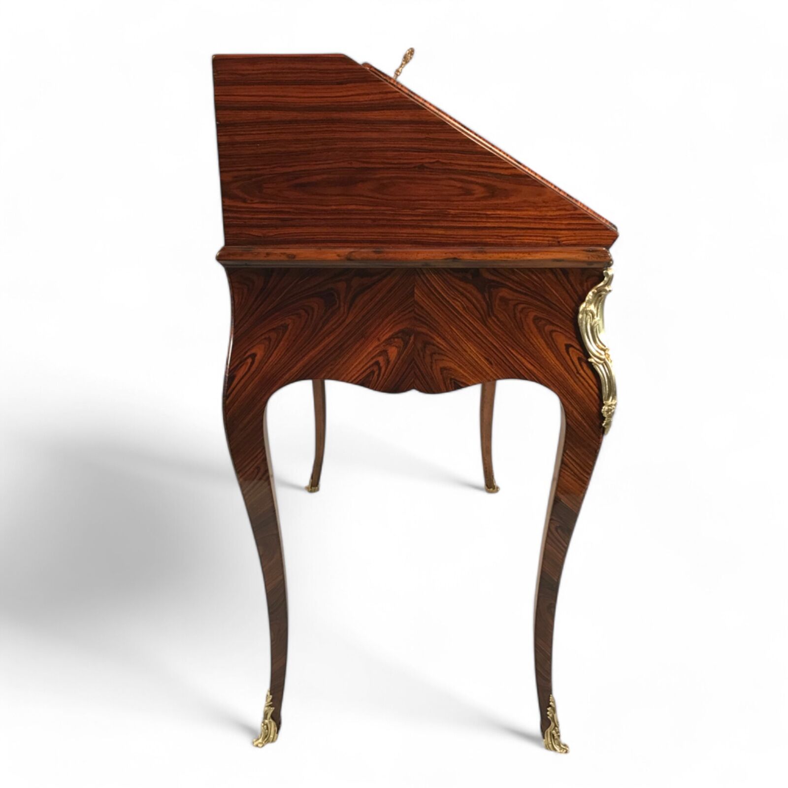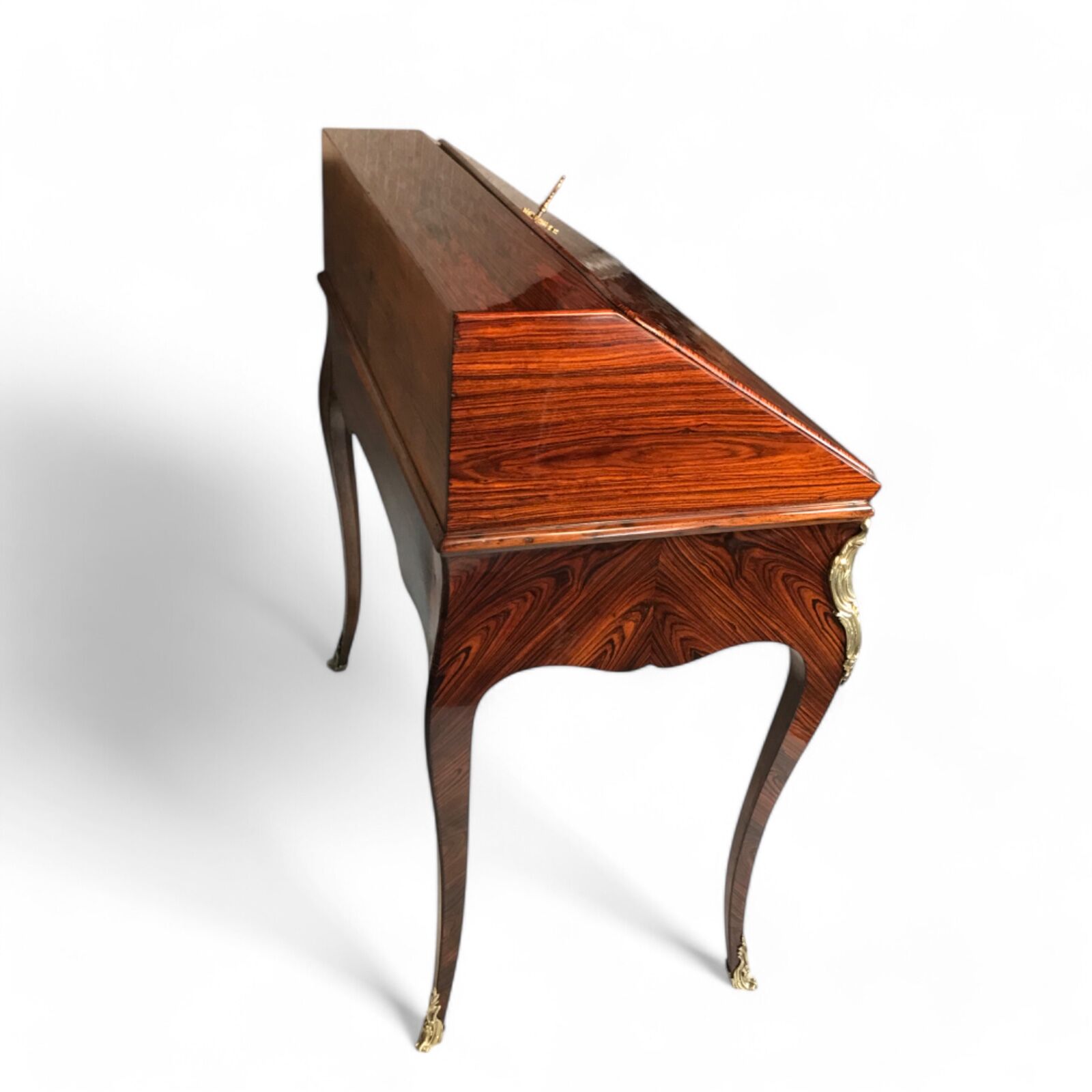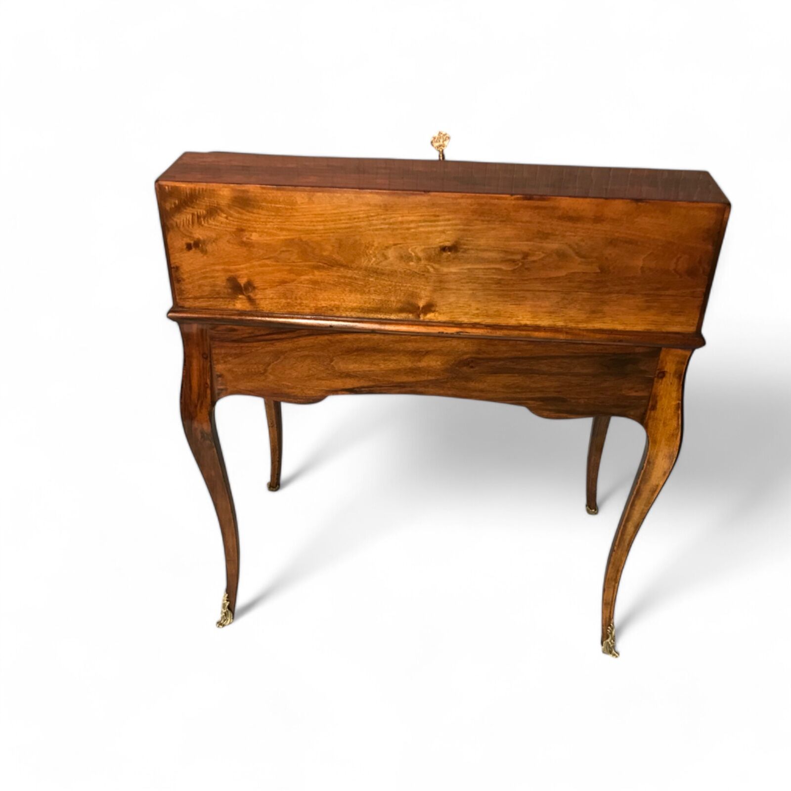This stunning French Louis XV secretary desk, crafted in Paris around 1750, is a remarkable example of 18th-century artistry and sophistication. Standing on four elegant curved legs adorned with bronze accents and applications, this desk exudes timeless charm and regal elegance. The writing flap showcases an exceptional marquetry design, highlighted by a central cube marquetry medallion, a hallmark of superior craftsmanship. Inside, you’ll find a thoughtfully organized layout featuring four drawers and four open compartments, offering both beauty and functionality. Luxurious red leather lines the writing surface, adding a touch of refinement. Beneath the writing flap, two additional drawers provide ample storage while maintaining the desk’s streamlined silhouette. This exceptional piece has been beautifully refinished to preserve its historical integrity while enhancing its natural beauty. It is in wonderful condition, ready to grace your home with its timeless allure. Whether displayed in a study, living room, or entryway, this 18th-century Louis XV secretary desk is a perfect blend of form and function, ideal for antique lovers and collectors seeking a rare and elegant treasure.