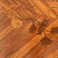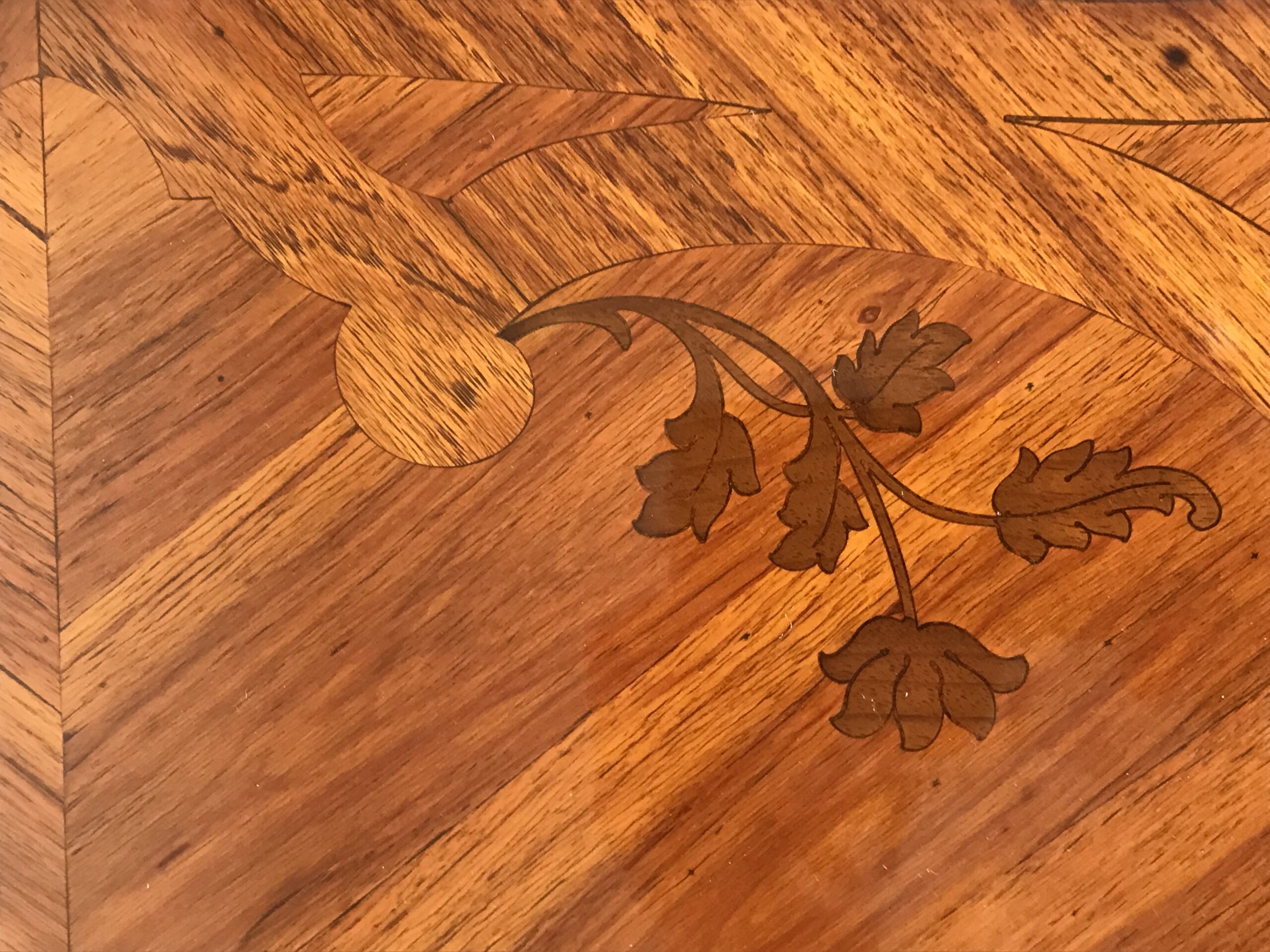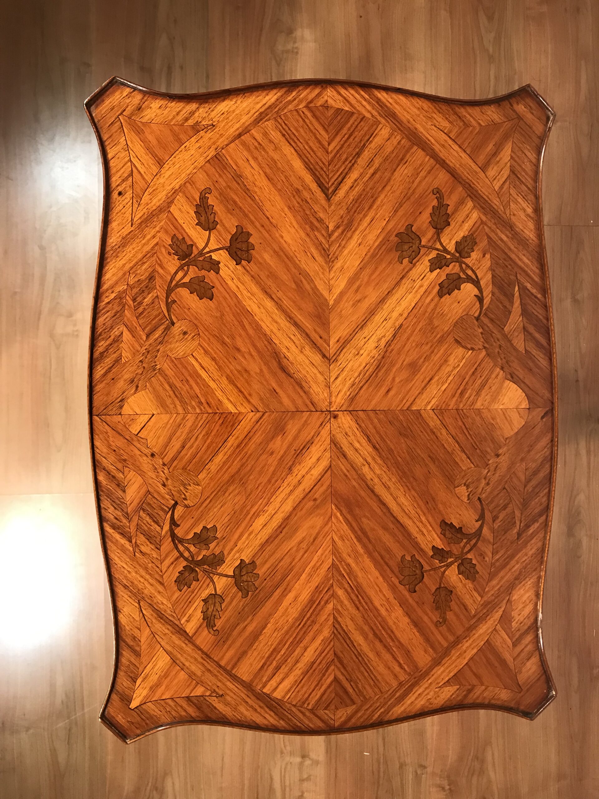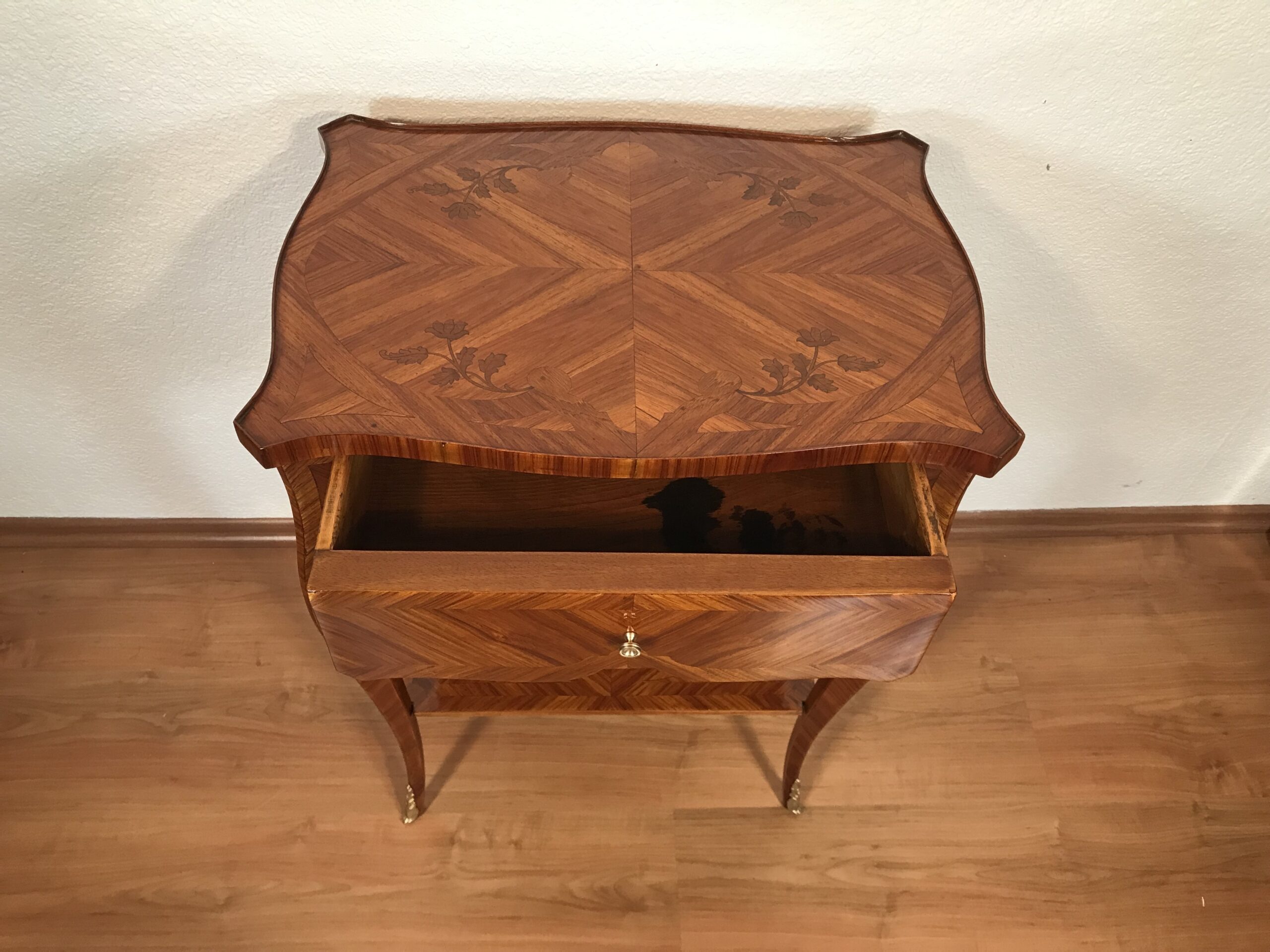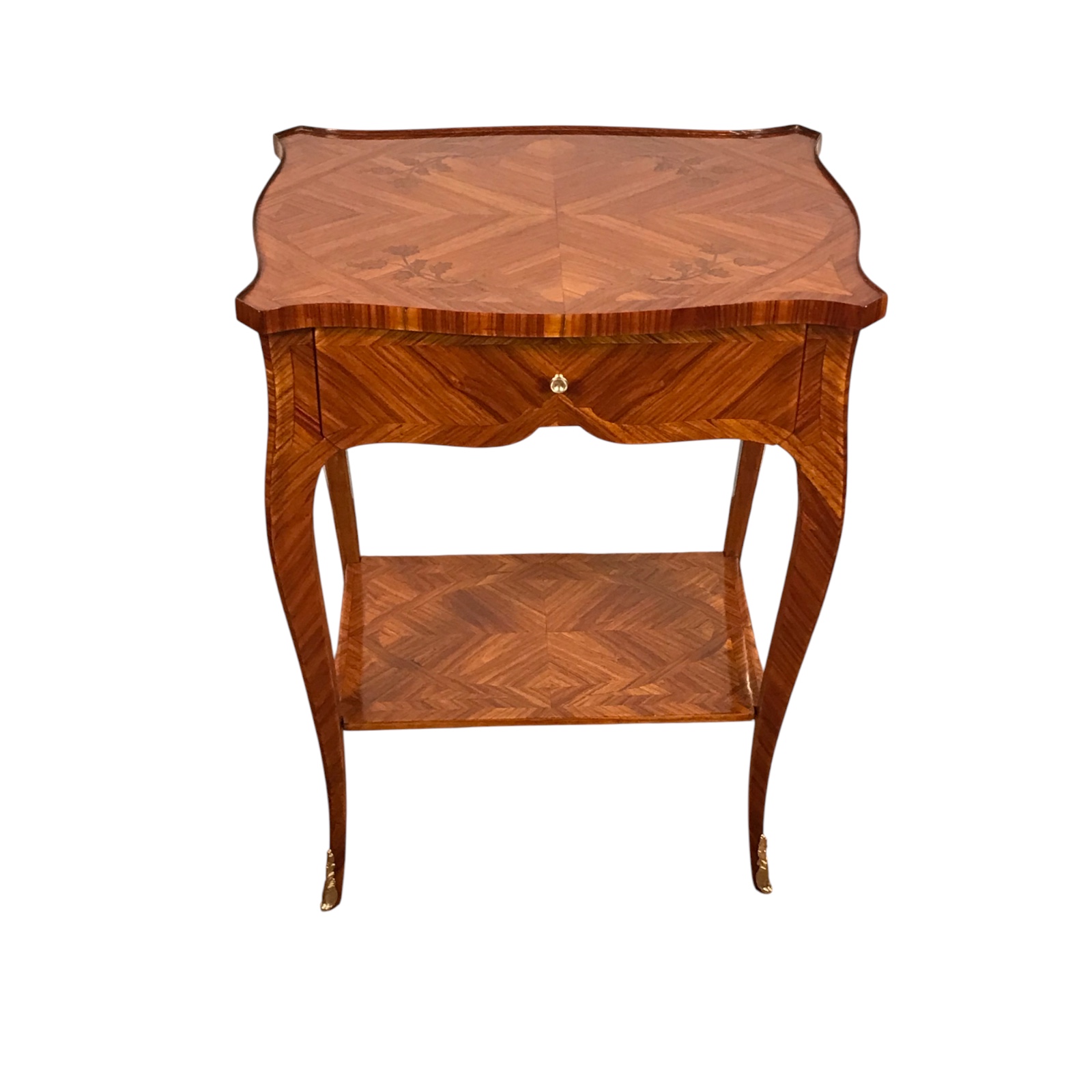 Elegant French Louis XV style side table from the 19th century. This refined antique accent table features a rectangular curved top with beautiful rosewood veneer and delicate floral marquetry inlay. A matching lower shelf echoes the same veneer pattern, adding both charm and functionality. The table includes a convenient single drawer and has been professionally refinished, highlighting its timeless craftsmanship.