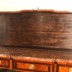 Elegant French Louis XV-Transition chest of drawers from around 1770–1780, featuring three spacious drawers set on gracefully curved feet. Crafted in exquisite satinwood, rosewood, and kingwood veneer, the lower drawers are decorated with a refined sans travers veneer design. The chest is finished with its original gilt-bronze mounts and a striking rose-beige marble top, adding both sophistication and authenticity. Expertly refinished with traditional French polish, this 18th-century commode embodies the transitional style between Rococo and Neoclassicism—making it a timeless statement piece for refined interiors.