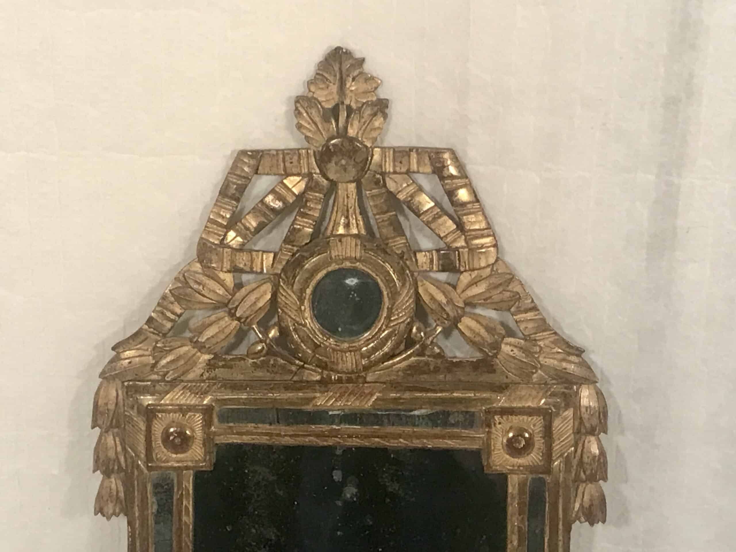 From the delicate Louis XVI bow adorning the top to the intricate floral vines and leaves gracefully cascading along the frame, each element tells a story of meticulous artistry. At the heart of this mirror lies its mirror glass, nestled between two ornate gilt wood cords.