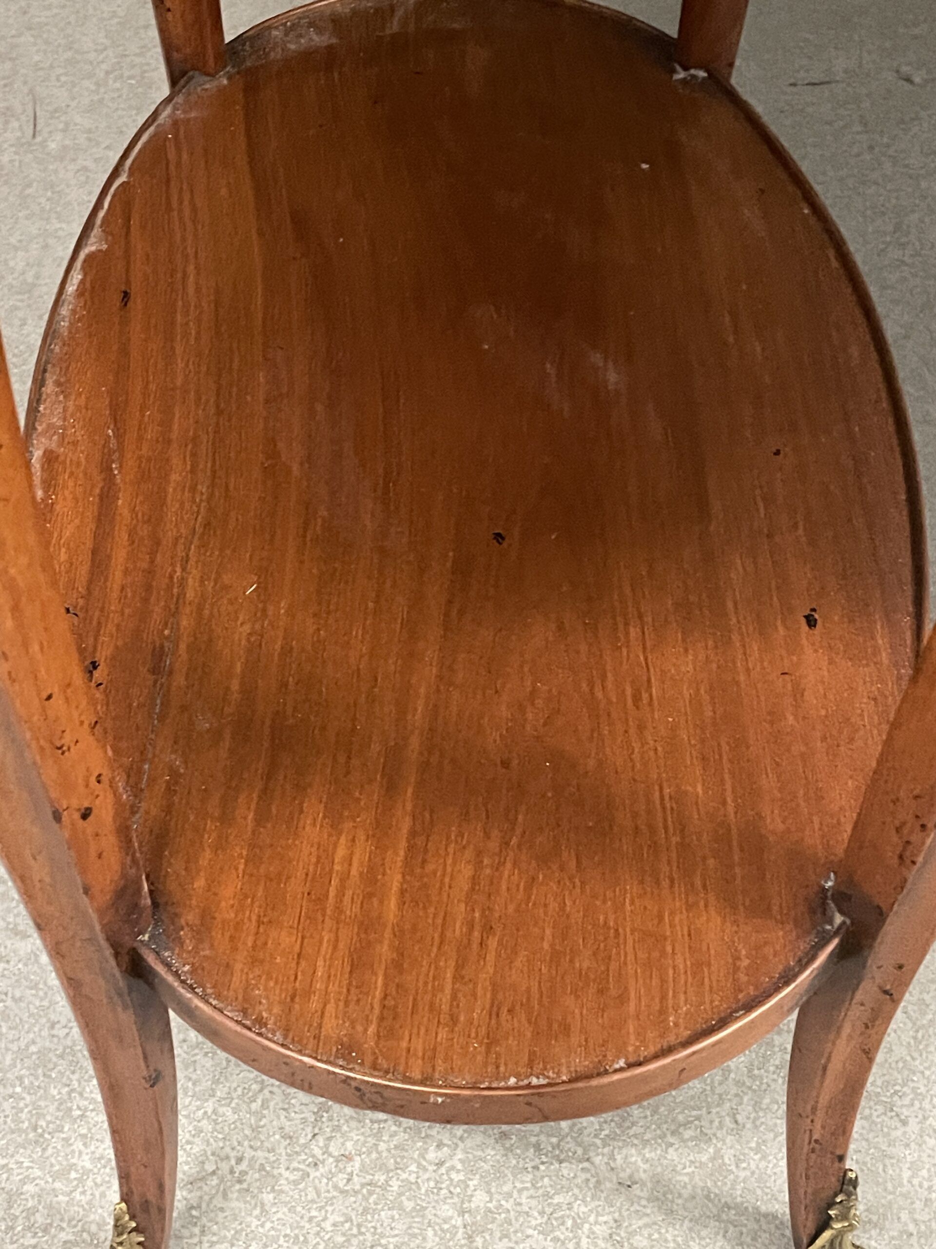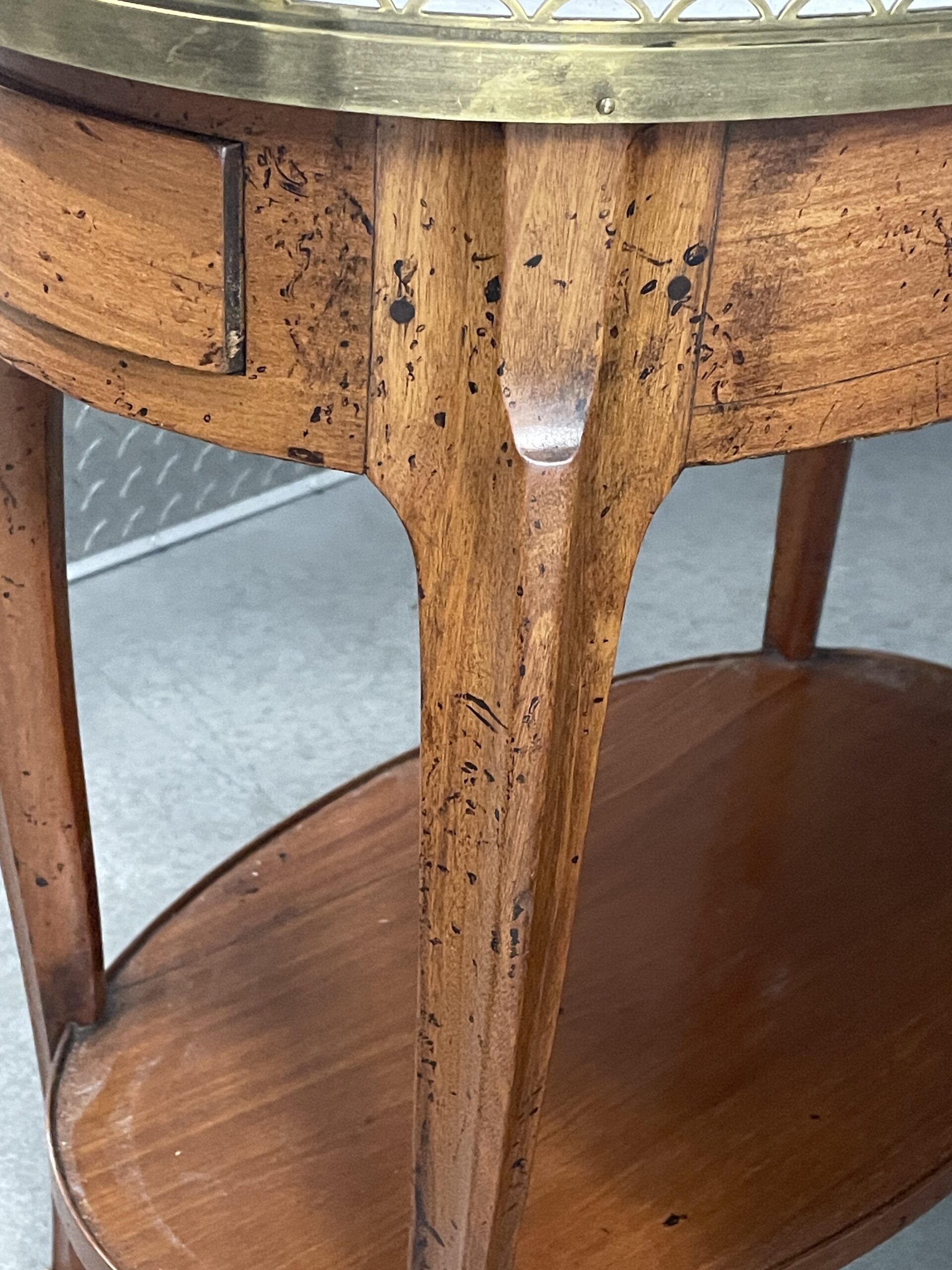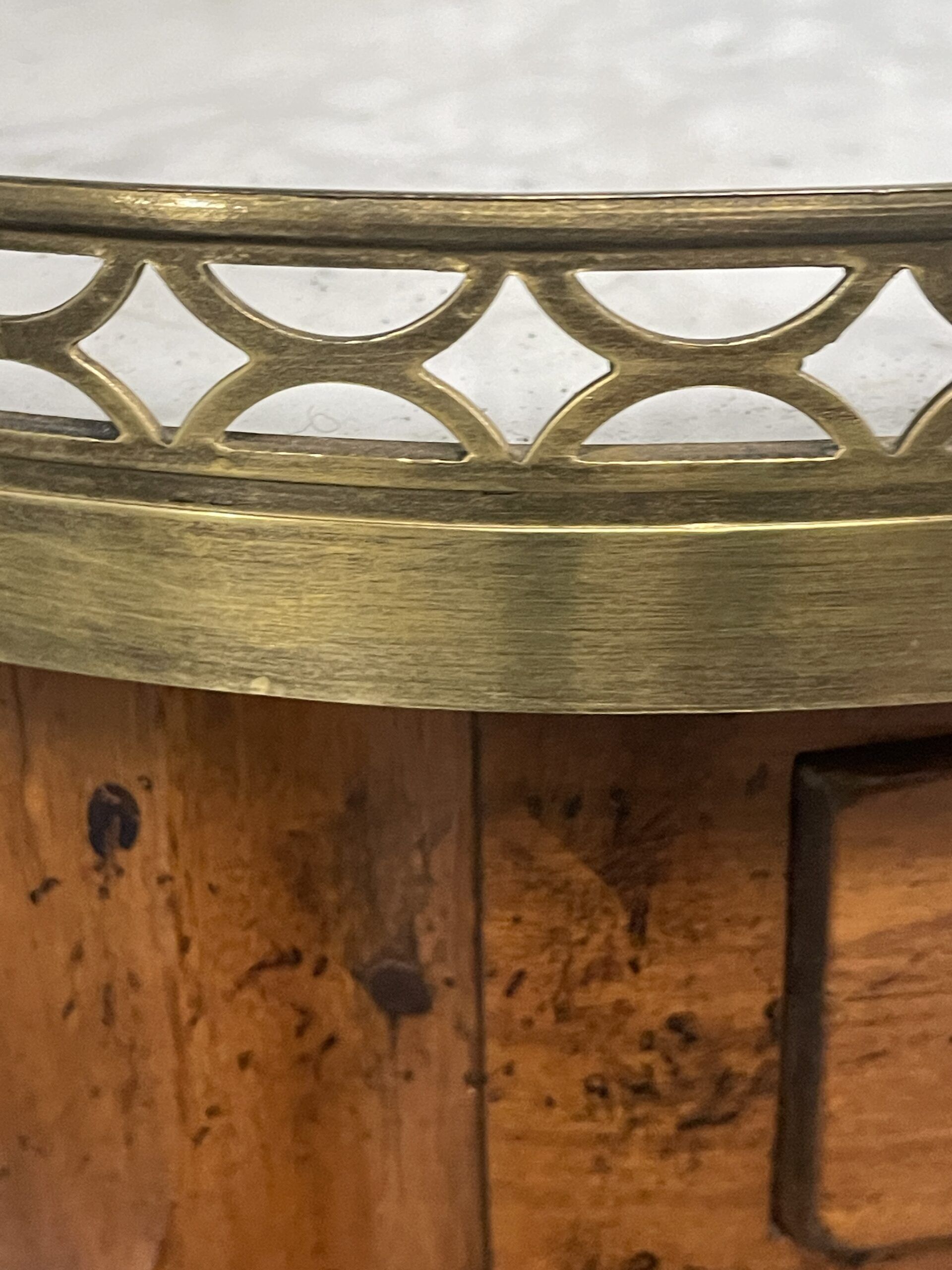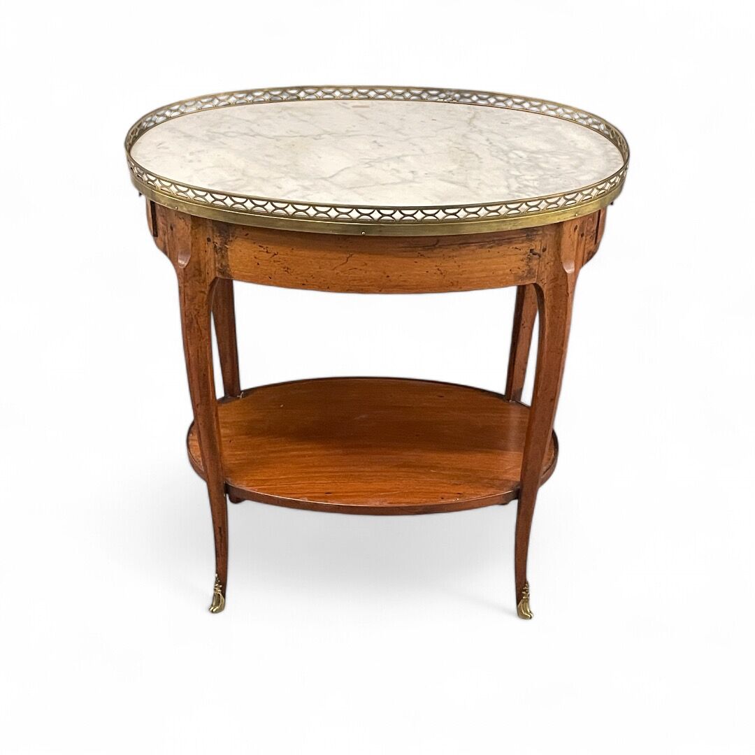 This elegant French oval side table dates from the Directoire period around 1800. Crafted from solid walnut, it features the clean, refined lines typical of Directoire design. The table’s smooth marble top is framed by a delicate brass railing, adding a touch of sophistication.