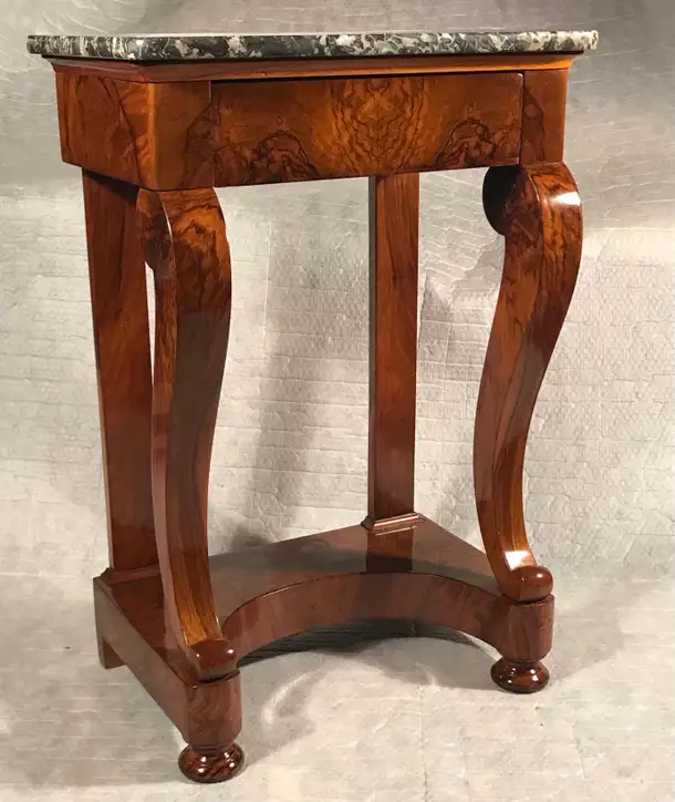 Experience a captivating French Restoration console table from the 1820-1830 period. This exquisite piece features an elegant mahogany veneer and s-shaped front legs on a concave-shaped base. Topped with beautiful grey-white marble, it exudes sophistication and adds a unique charm to the console table. Meticulously refinished in our workshop, our skilled craftsmen applied a flawless shellac hand polish. Discover the allure of this stunning console table, showcasing timeless beauty and craftsmanship of French design. This beautiful antique piece is ready for your home today!