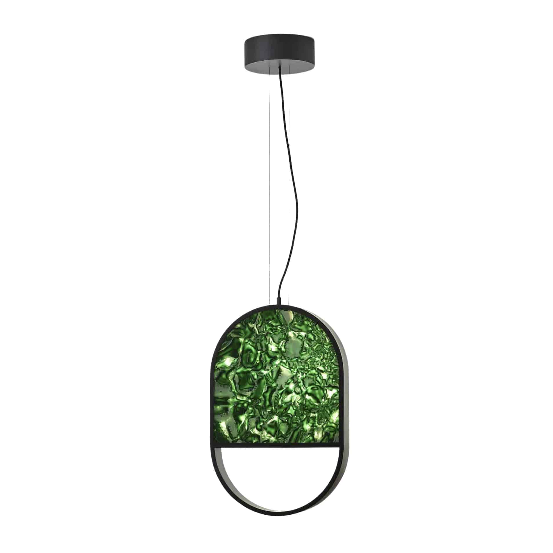 Geometric pendant light in oval shape accentuates the aesthetic expression and structure of Brokisglass, which itself is remarkably distinctive. The collection is defined by basic geometric shapes that characterize the overall contours of the lights and instill them with a singular graphic element to achieve a striking contrast with the animate, almost sculptural makeup of the glass. The suspension components make up the glass geometric shapes, their edges rendered in black profiles.