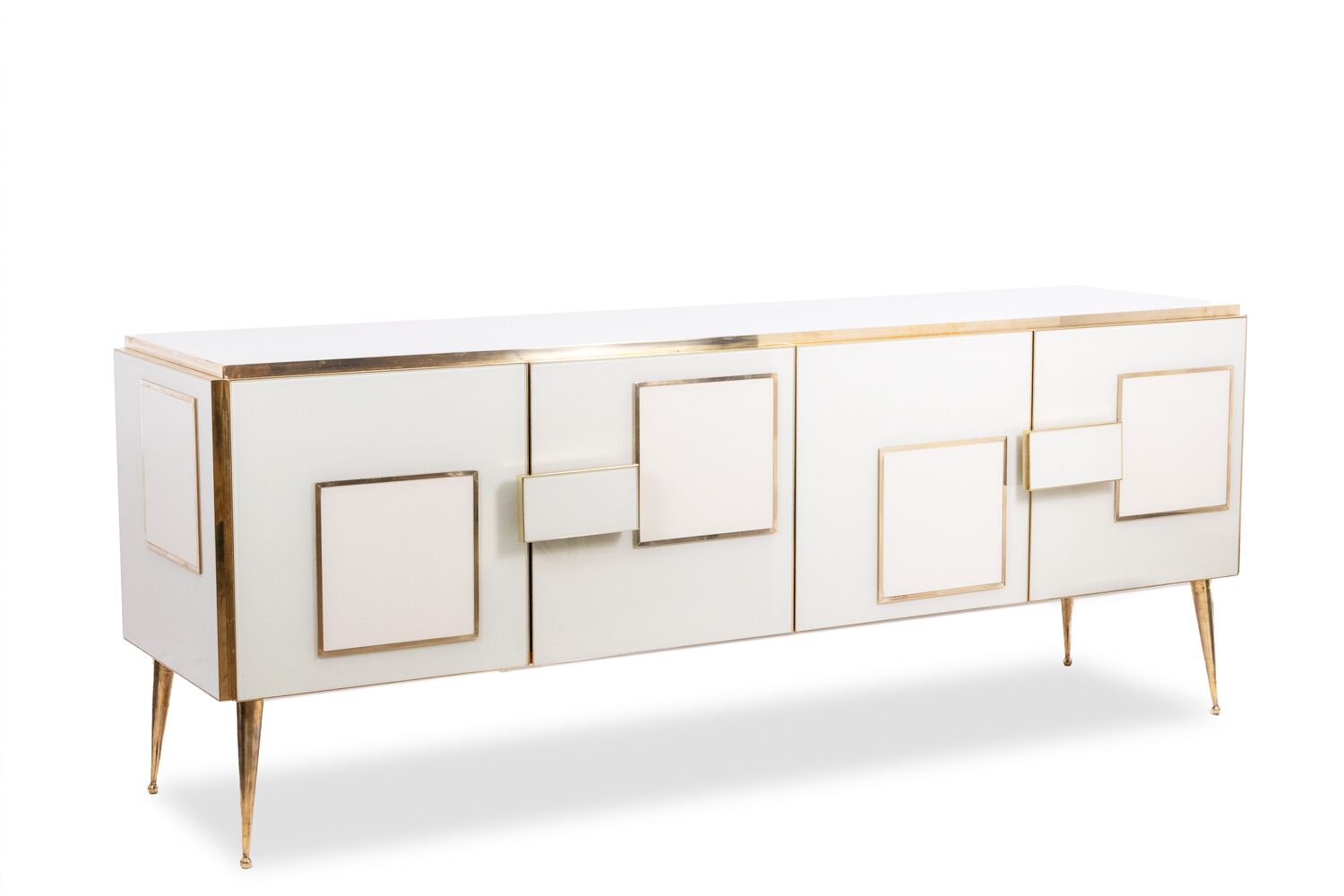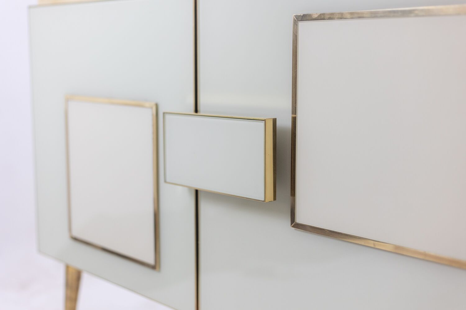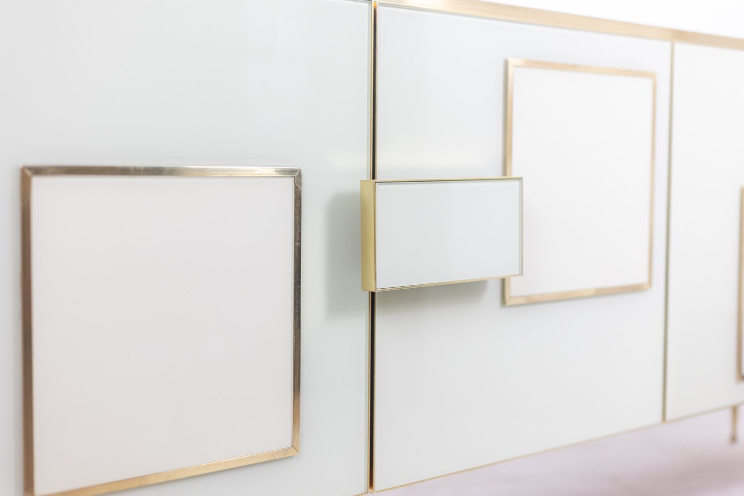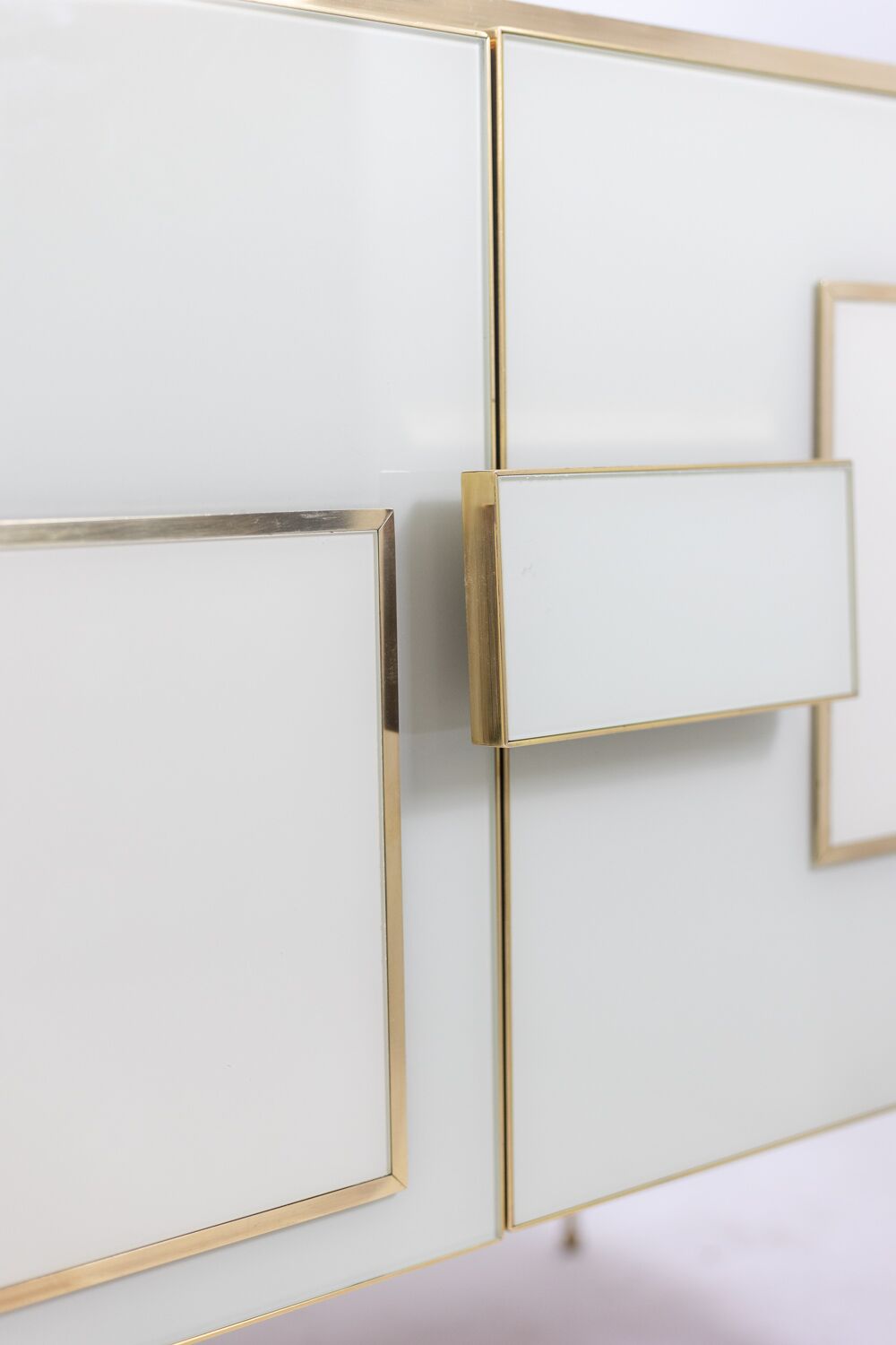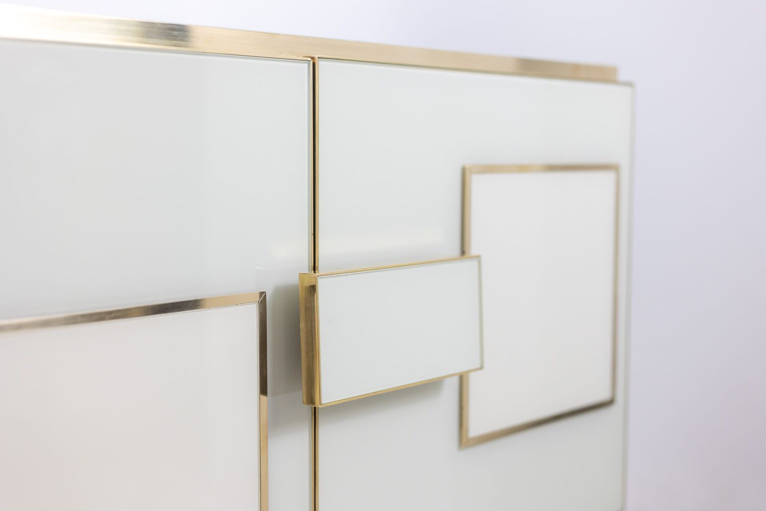 This contemporary Italian geometric sideboard stands out with its striking design and premium materials. The sideboard features a sleek white-colored glass front and gilded brass accents, making it a sophisticated addition to any modern interior. It opens with four doors, each adorned with square and rectangular shapes, and uses rectangular handles for a cohesive look. The spindle-shaped gilded brass base ends in small decorative balls, adding a touch of elegance and uniqueness.