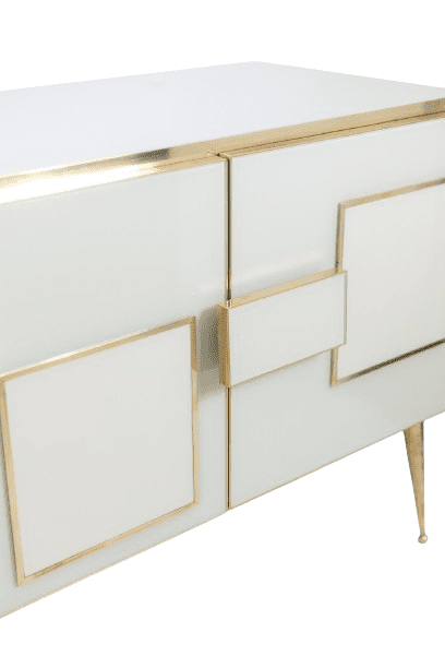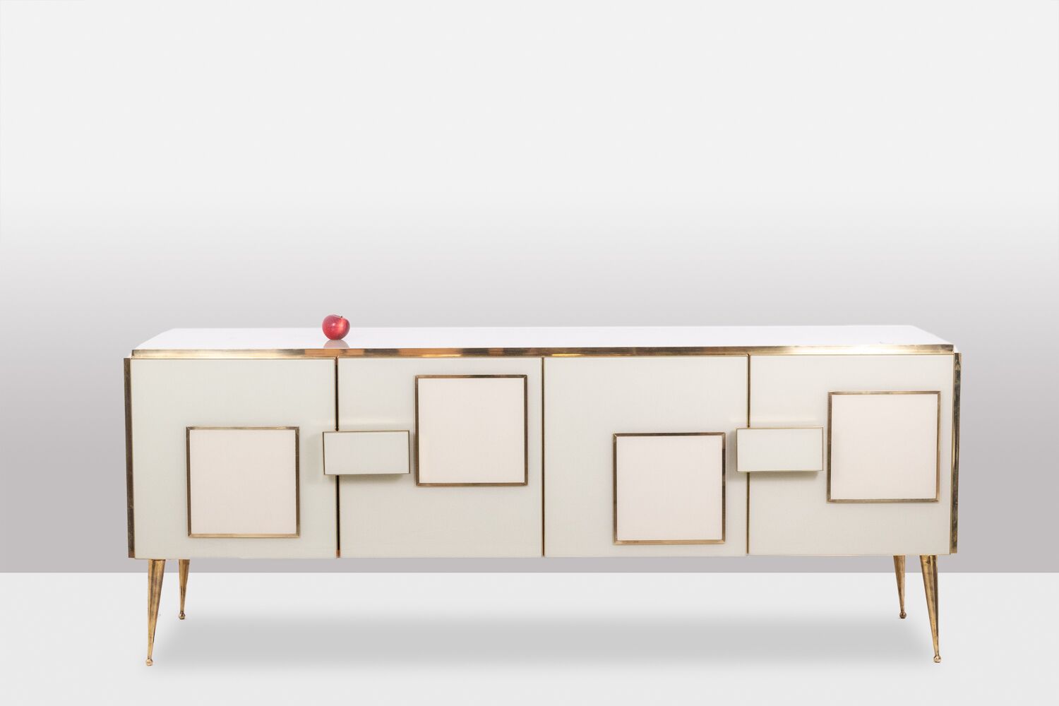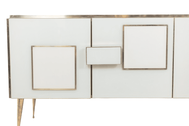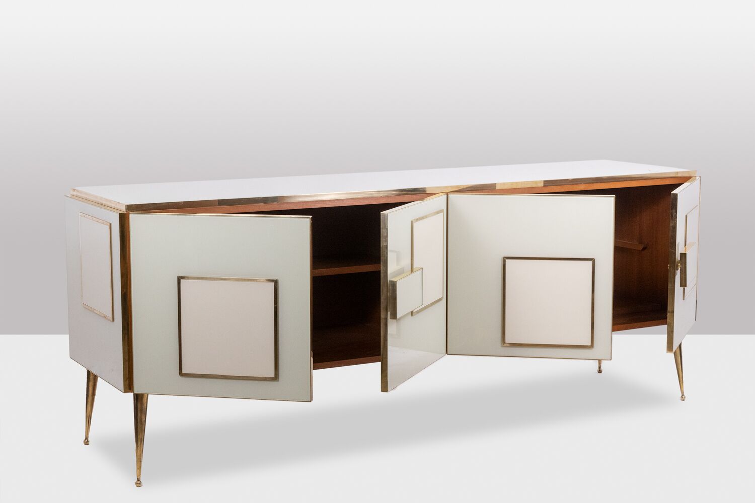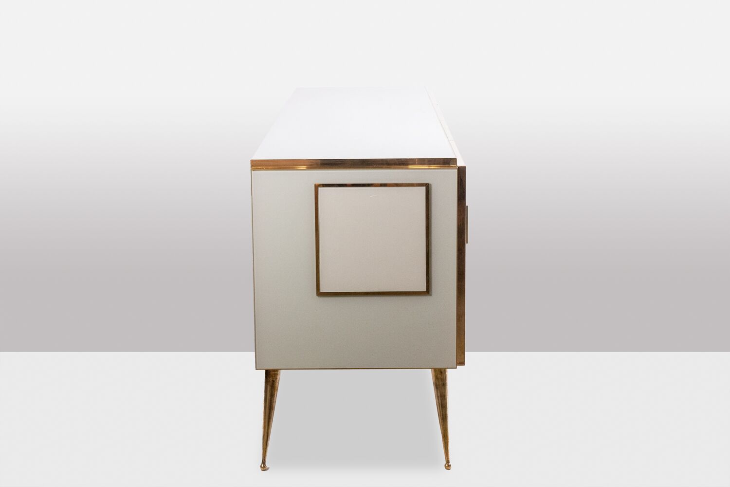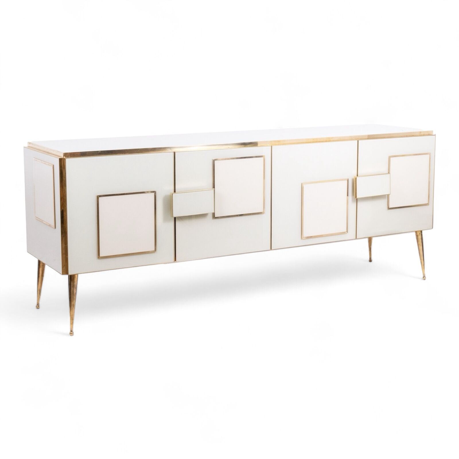 This contemporary Italian geometric sideboard stands out with its striking design and premium materials. The sideboard features a sleek white-colored glass front and gilded brass accents, making it a sophisticated addition to any modern interior. It opens with four doors, each adorned with square and rectangular shapes, and uses rectangular handles for a cohesive look. The spindle-shaped gilded brass base ends in small decorative balls, adding a touch of elegance and uniqueness.