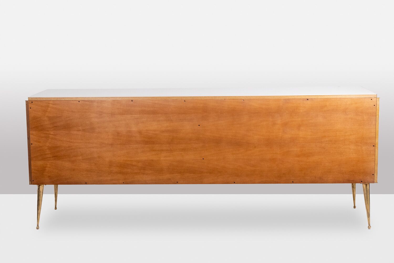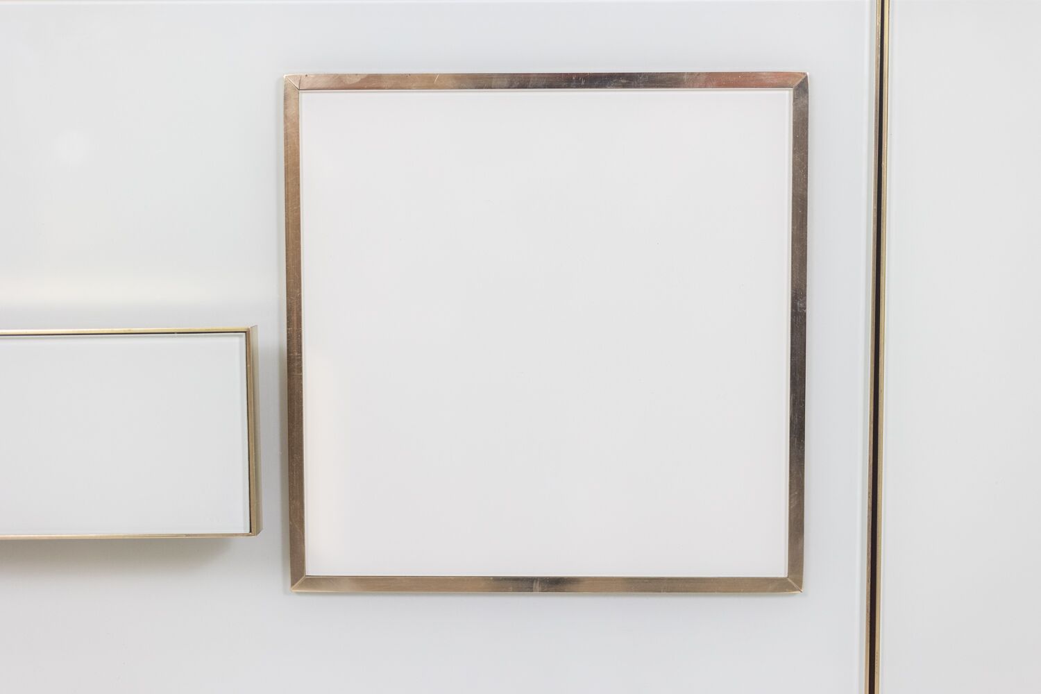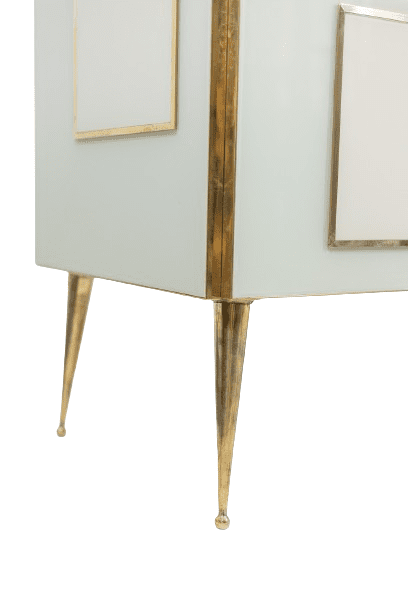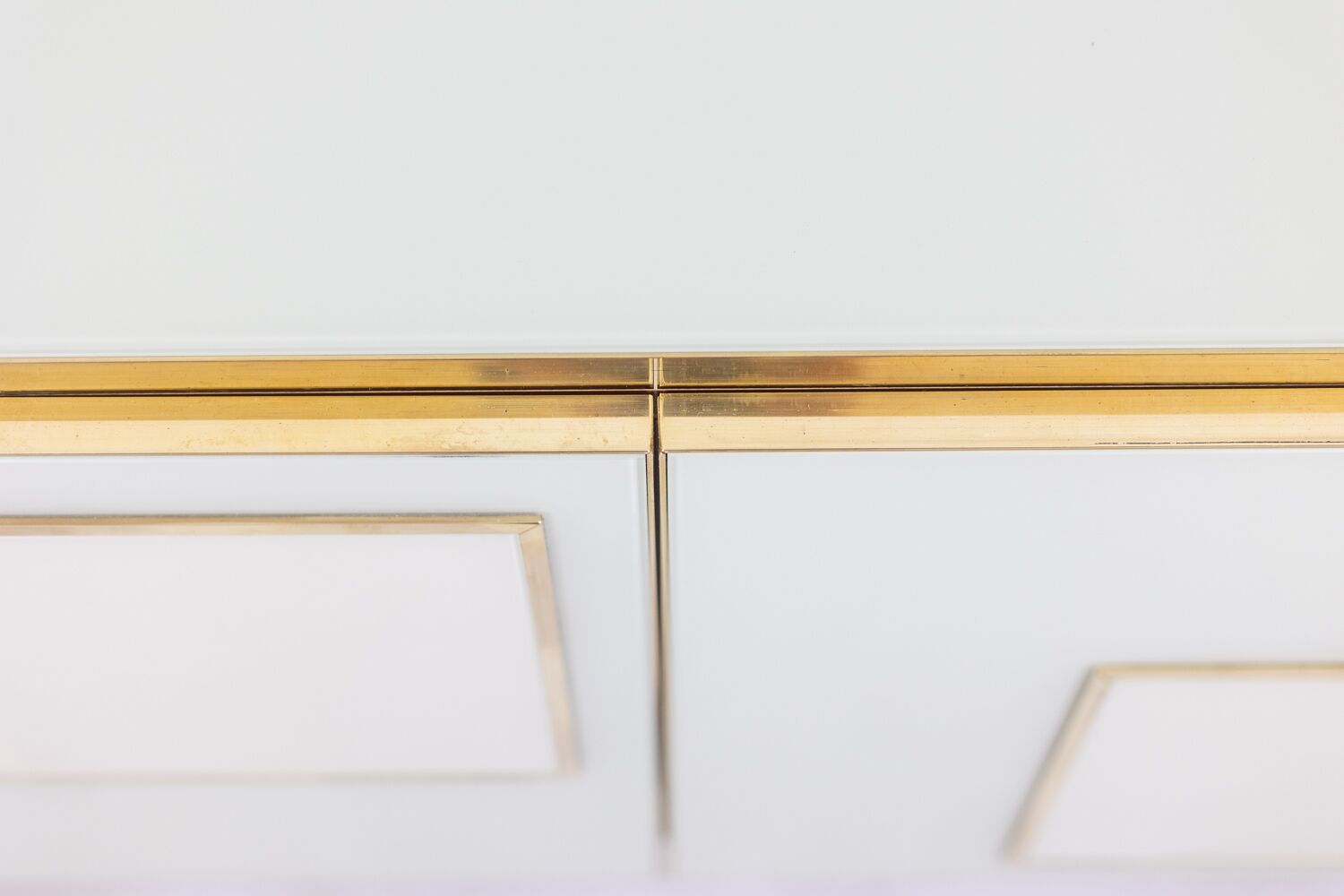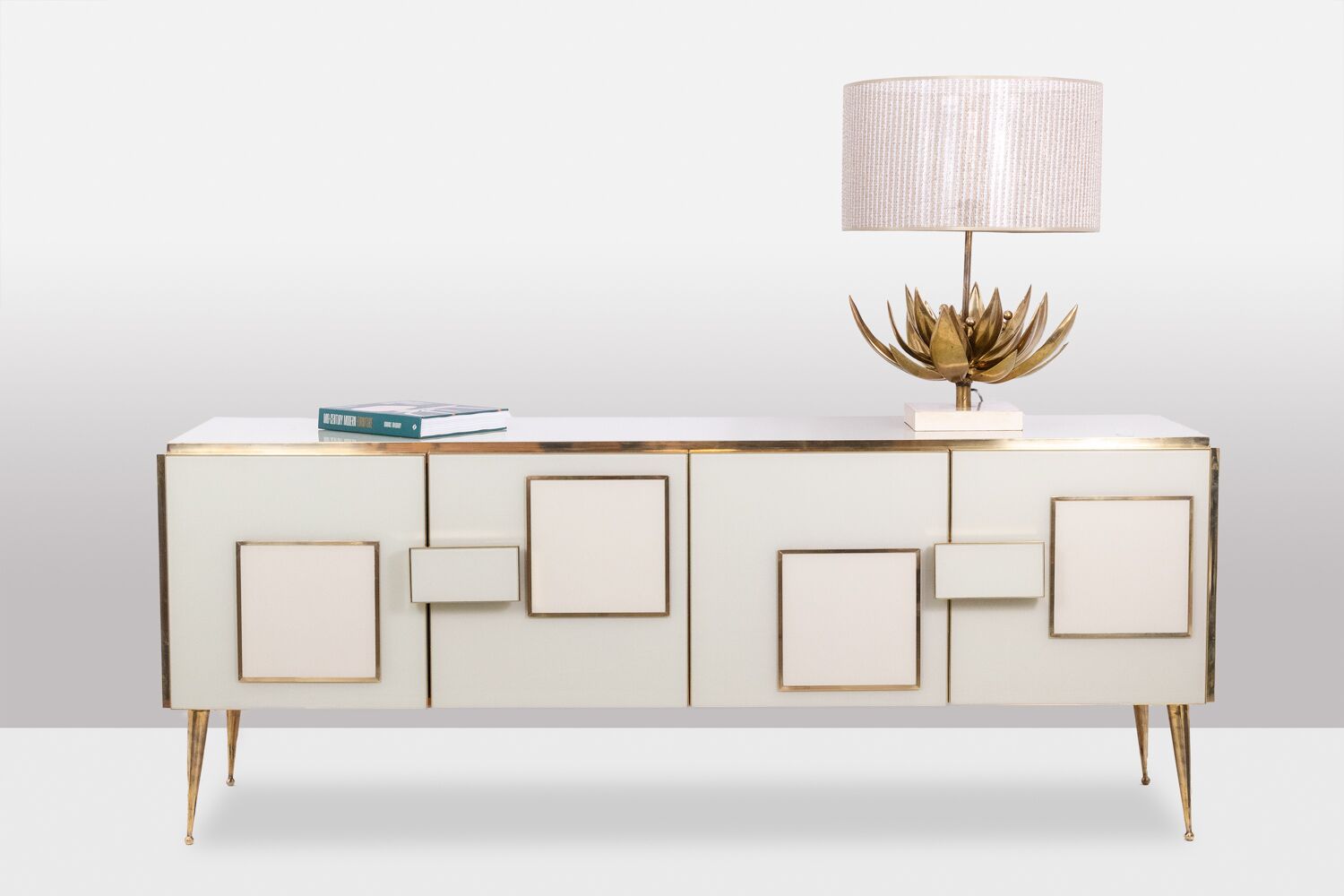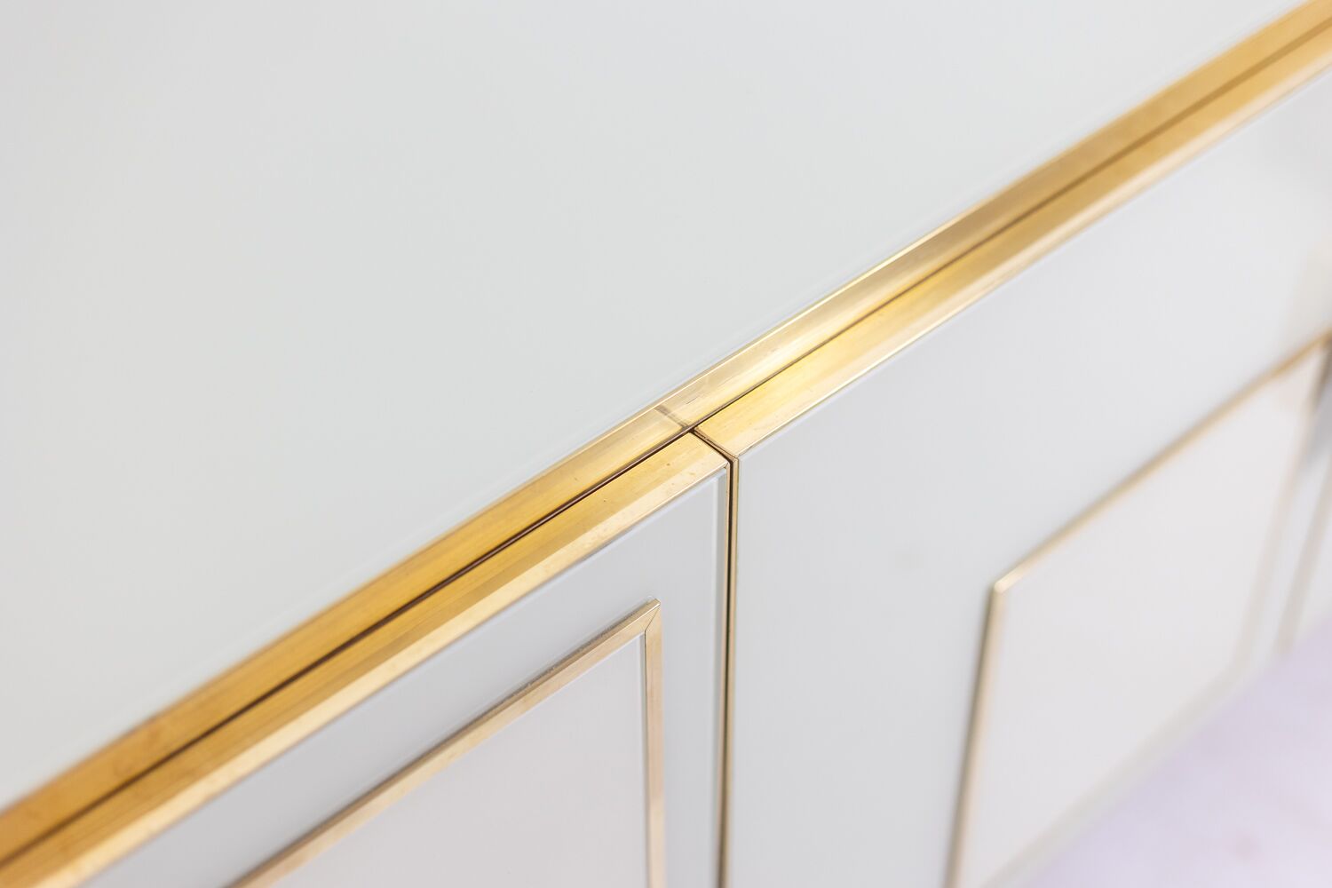This contemporary Italian geometric sideboard stands out with its striking design and premium materials. The sideboard features a sleek white-colored glass front and gilded brass accents, making it a sophisticated addition to any modern interior. It opens with four doors, each adorned with square and rectangular shapes, and uses rectangular handles for a cohesive look. The spindle-shaped gilded brass base ends in small decorative balls, adding a touch of elegance and uniqueness.