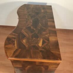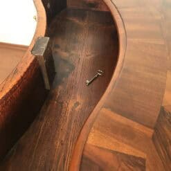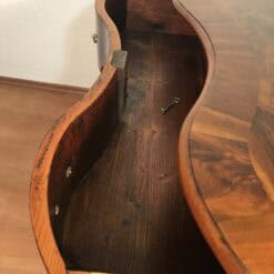Original brass handles and escutcheons remain intact, adding to its authenticity and historical character. The surface has been expertly refinished using traditional shellac hand polishing, enhancing the depth and warmth of the walnut veneer while preserving the integrity of the piece.