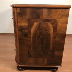 An elegant German Baroque chest of drawers dating to around 1750, crafted with a pine carcass and richly veneered in walnut with refined strapwork inlays. The façade features three gracefully curved drawers, resting on classic bun feet, giving the piece a balanced yet sculptural presence.