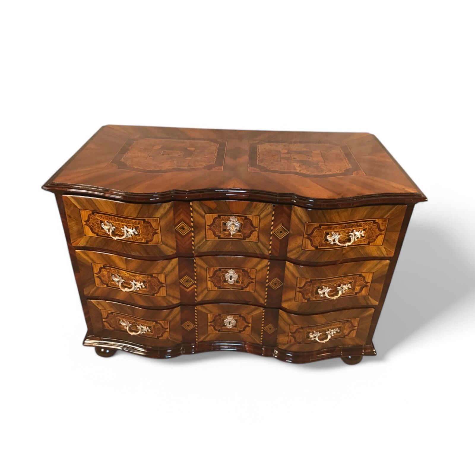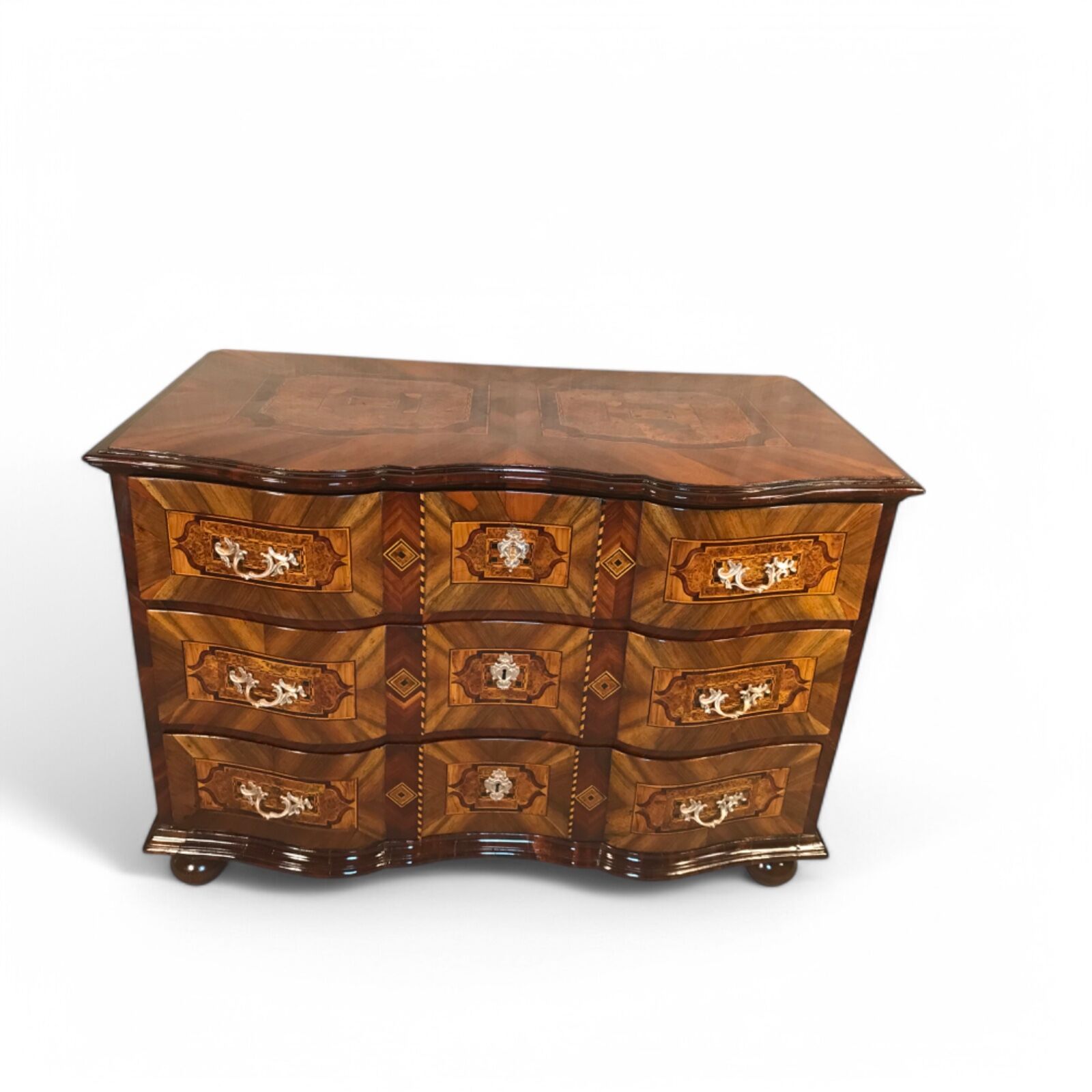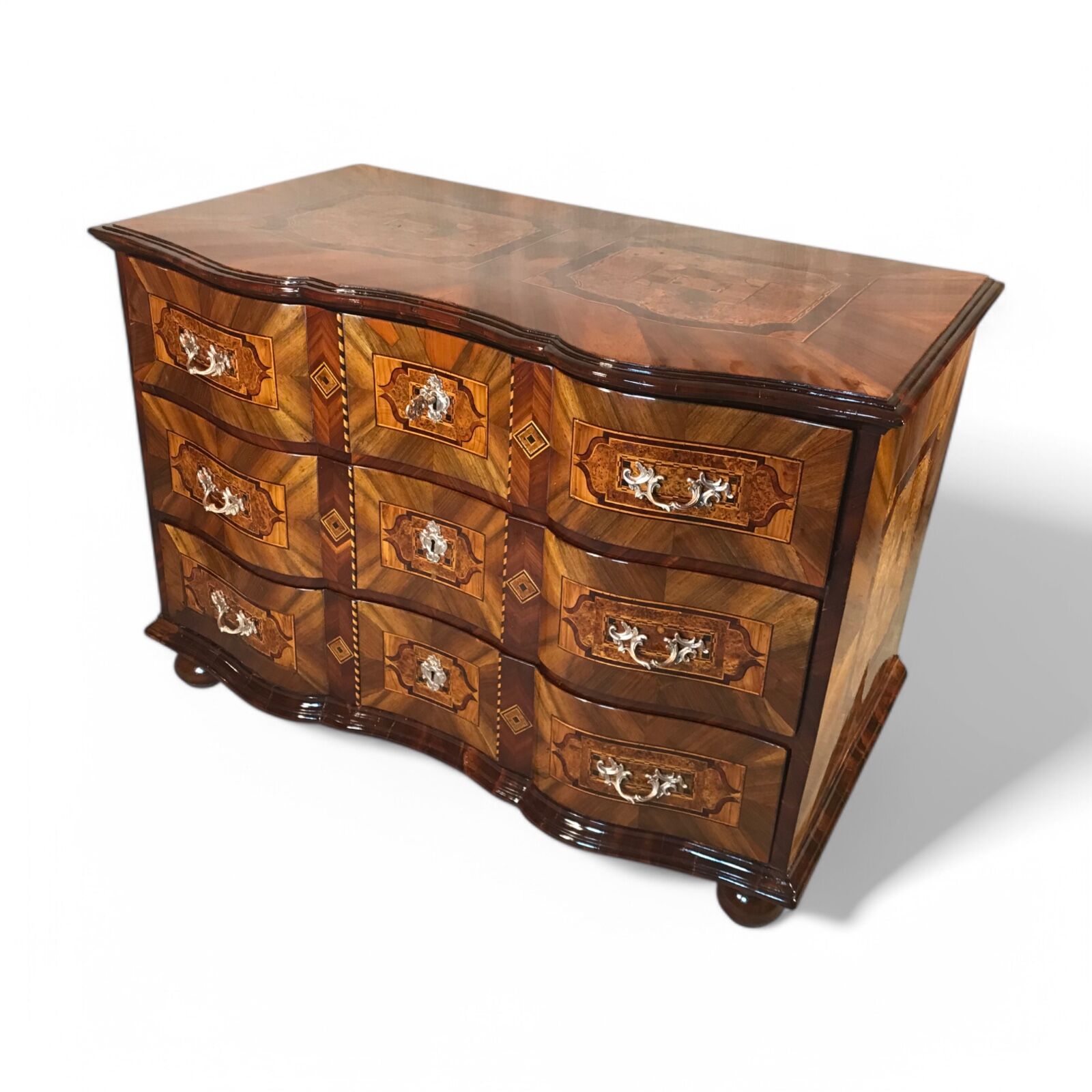 This 18th-century German Baroque chest of drawers is a stunning example of masterful craftsmanship, featuring a gracefully curved front and exquisite walnut veneer with intricate marquetry inlay in plum wood and bird’s eye maple on all sides and the top. The warm tones of the walnut, combined with the elaborate inlay work, make this piece a true statement of timeless elegance.
