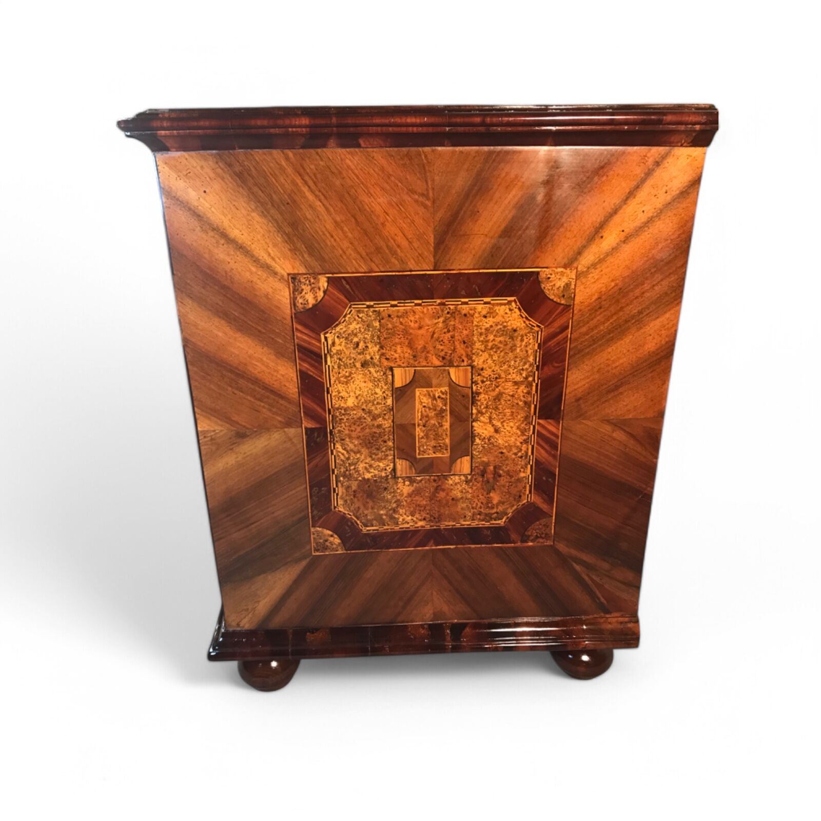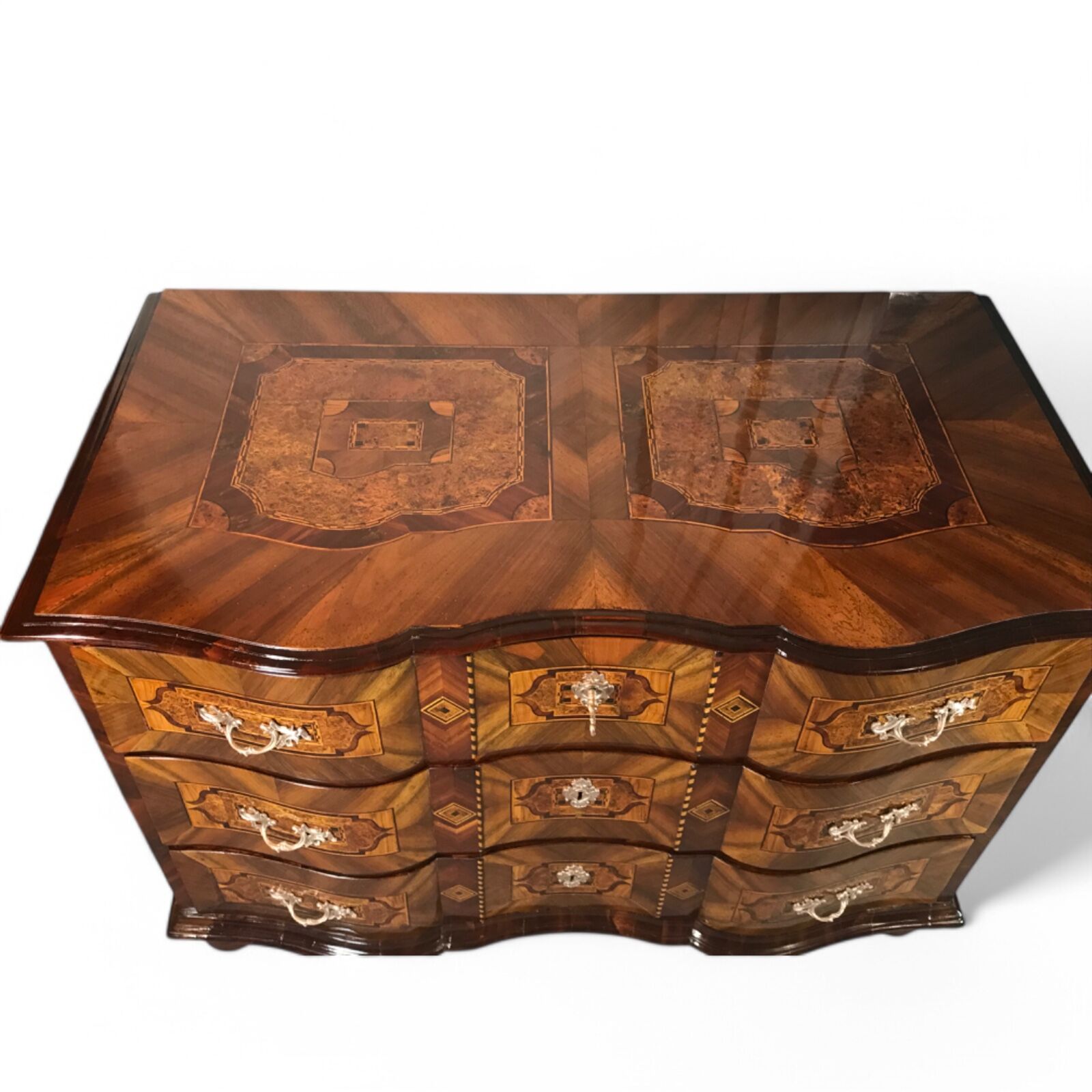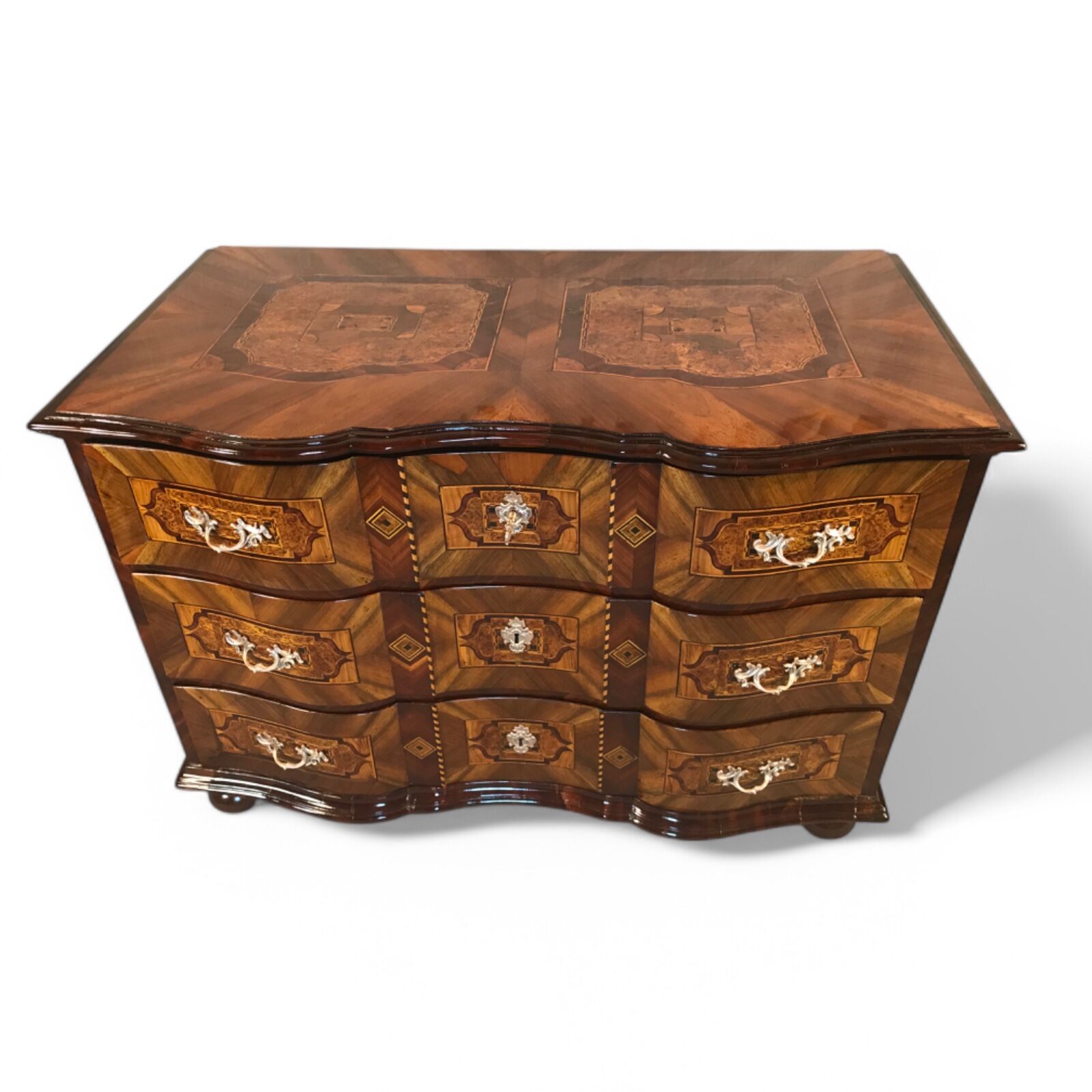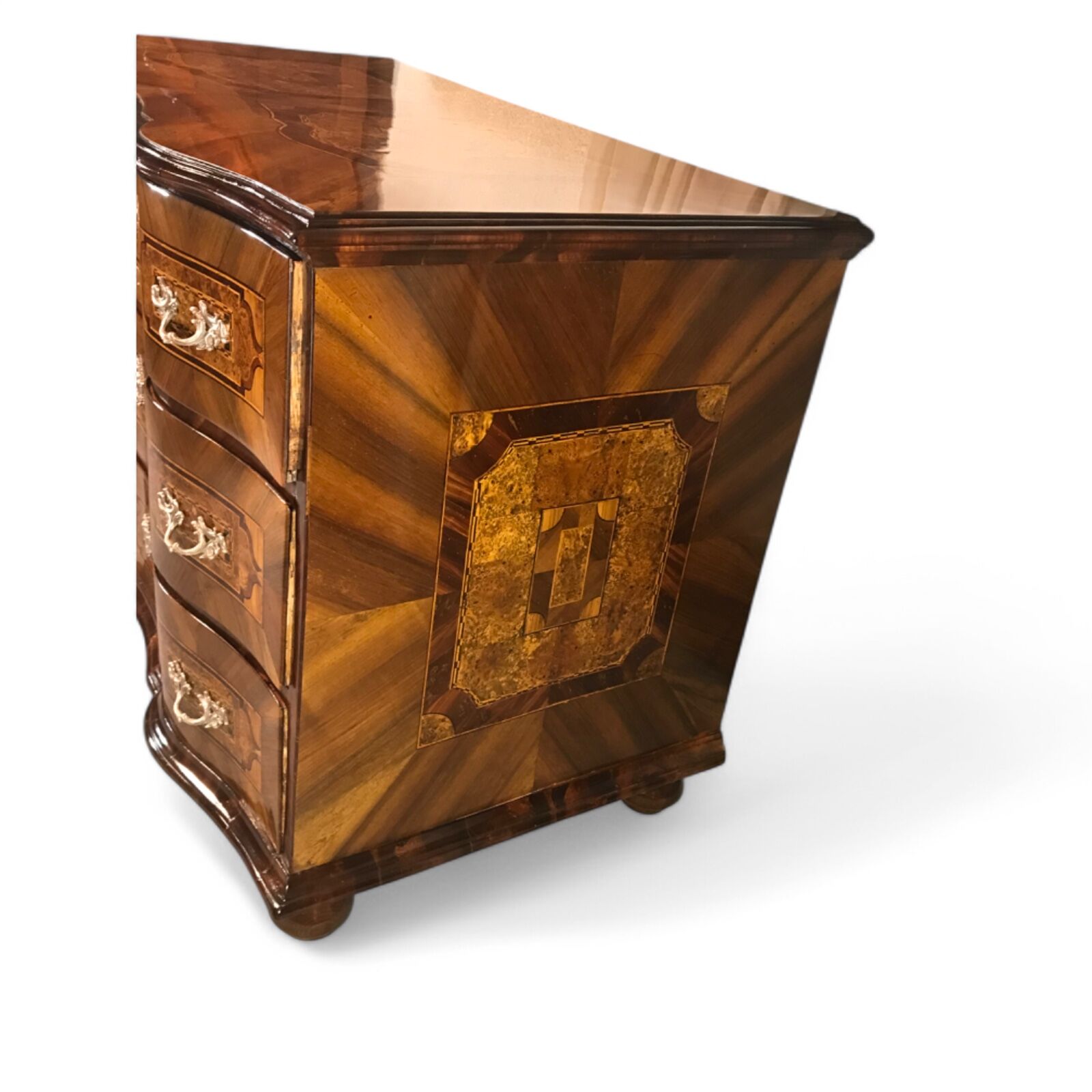 This 18th-century German Baroque chest of drawers is a stunning example of masterful craftsmanship, featuring a gracefully curved front and exquisite walnut veneer with intricate marquetry inlay in plum wood and bird’s eye maple on all sides and the top. The warm tones of the walnut, combined with the elaborate inlay work, make this piece a true statement of timeless elegance.