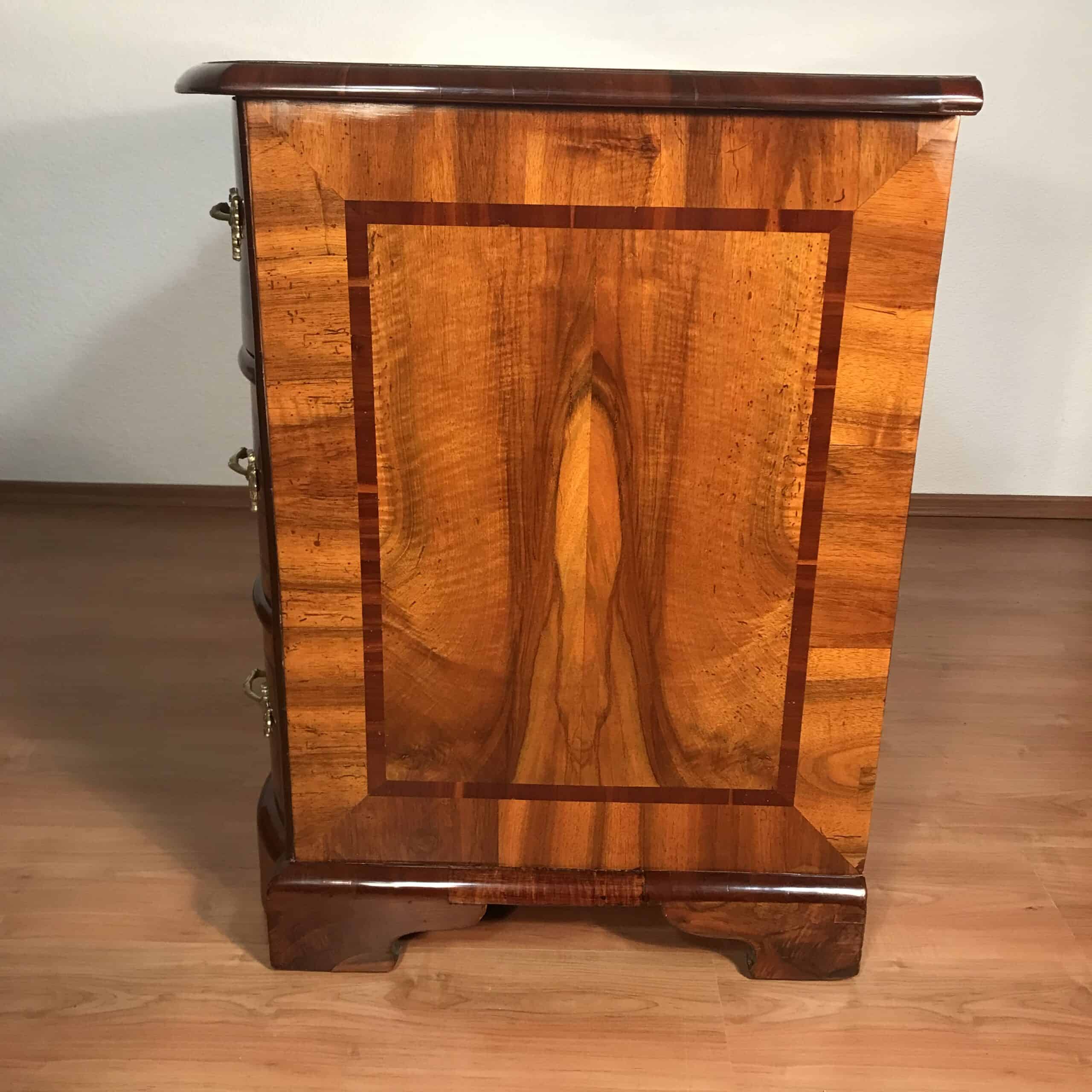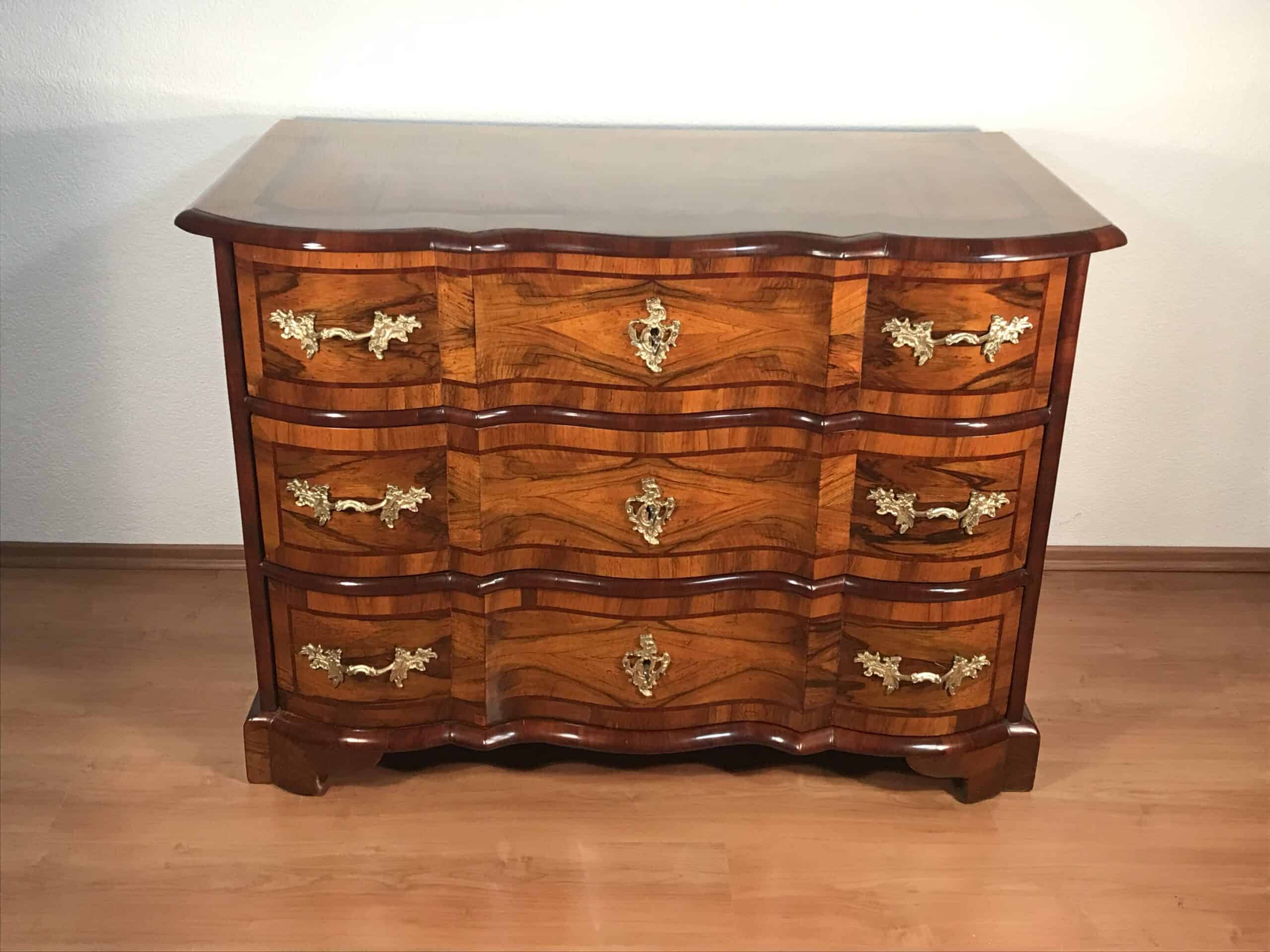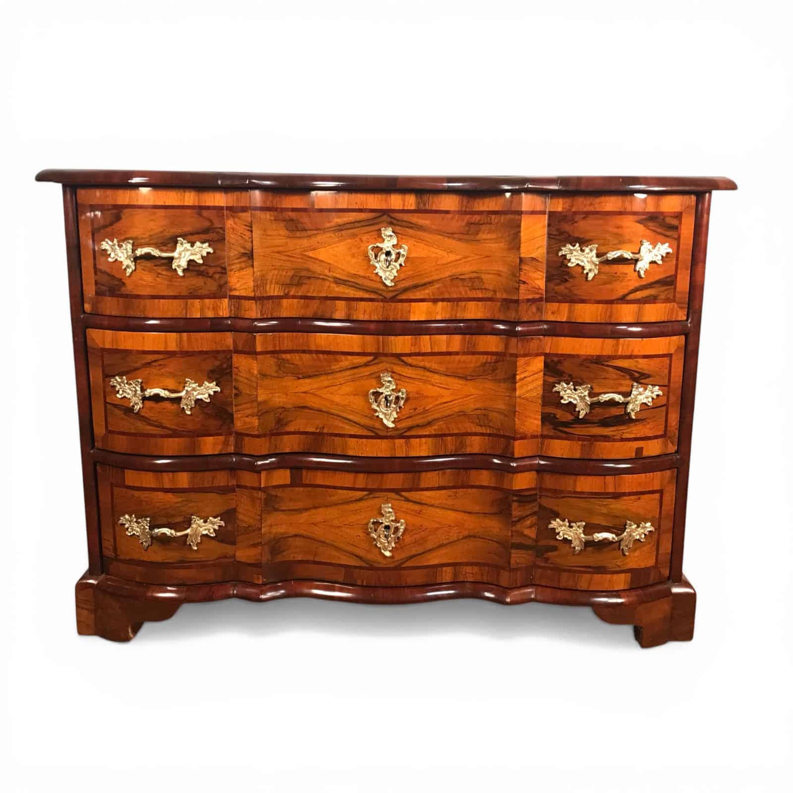 An exceptional 18th-century German Baroque chest of drawers, crafted in richly figured walnut veneer with refined inlay detailing. The façade features three elegantly shaped, serpentine drawers, each adorned with its original floral bronze mounts—an exquisite testament to the artistry and technical mastery of German cabinetmakers of the period.