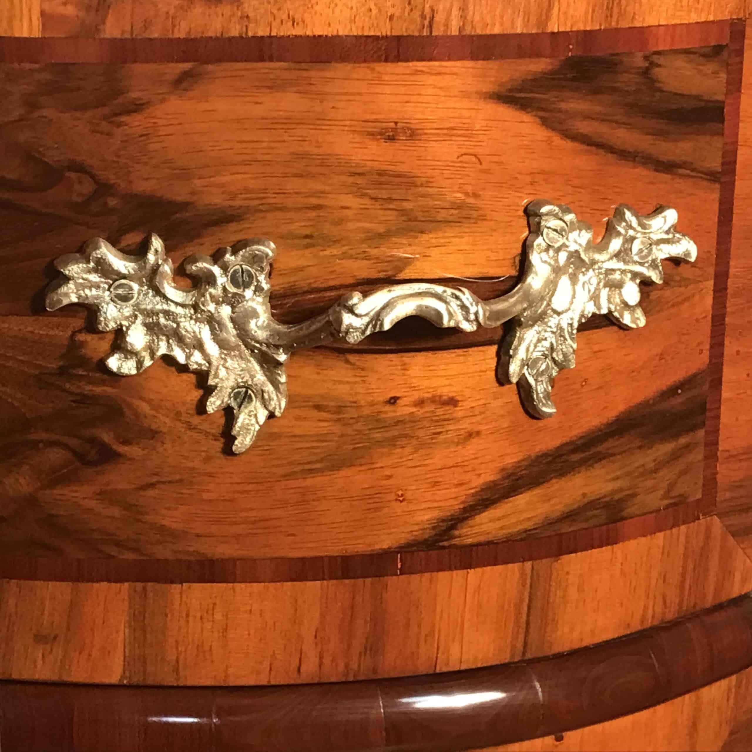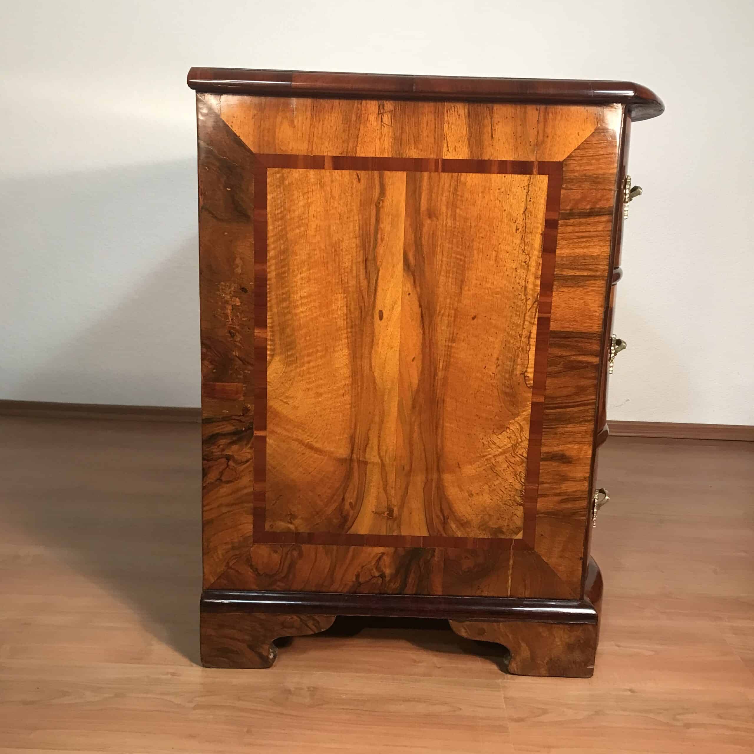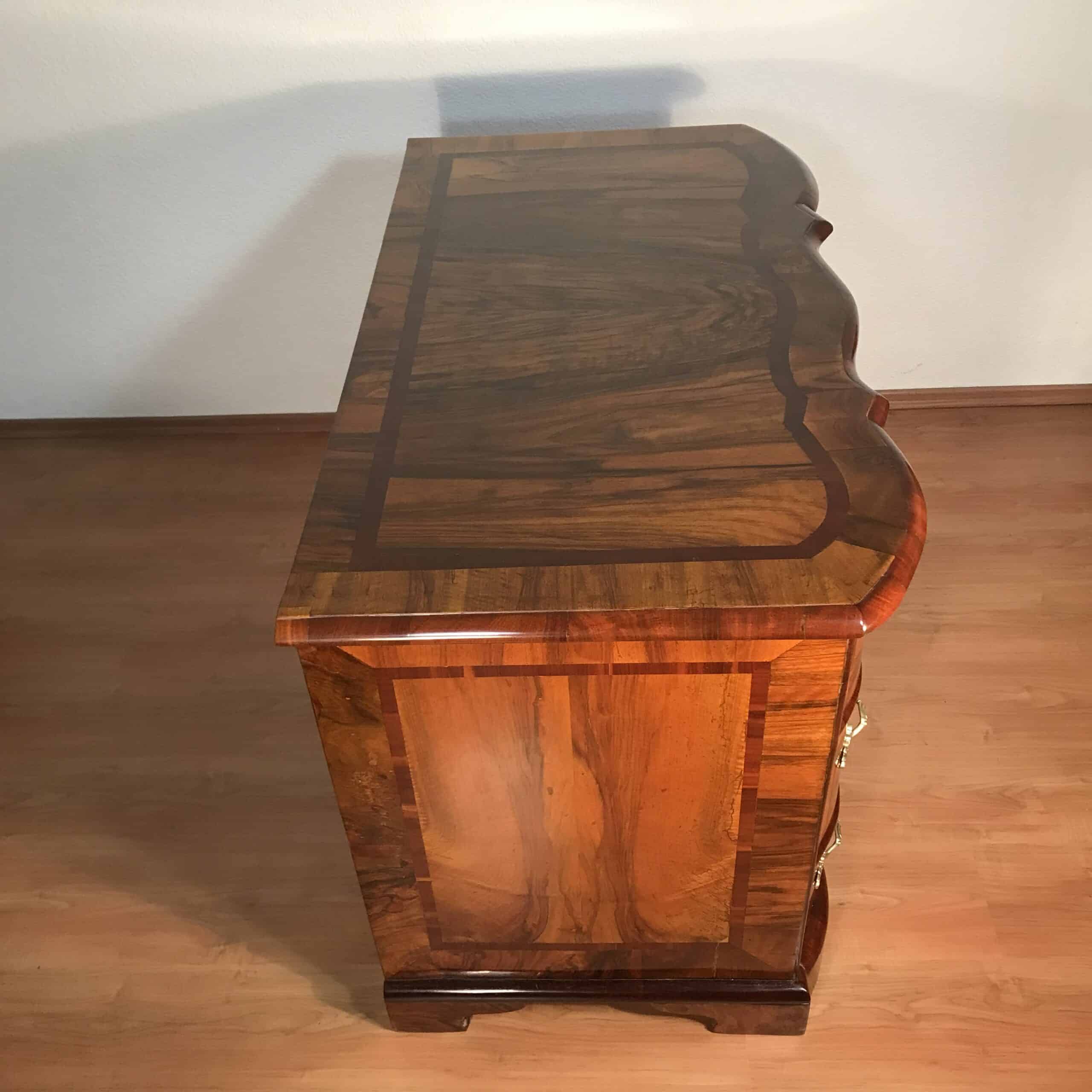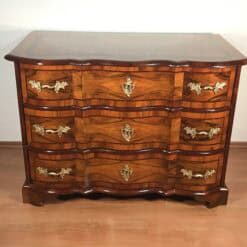 An exceptional 18th-century German Baroque chest of drawers, crafted in richly figured walnut veneer with refined inlay detailing. The façade features three elegantly shaped, serpentine drawers, each adorned with its original floral bronze mounts—an exquisite testament to the artistry and technical mastery of German cabinetmakers of the period.