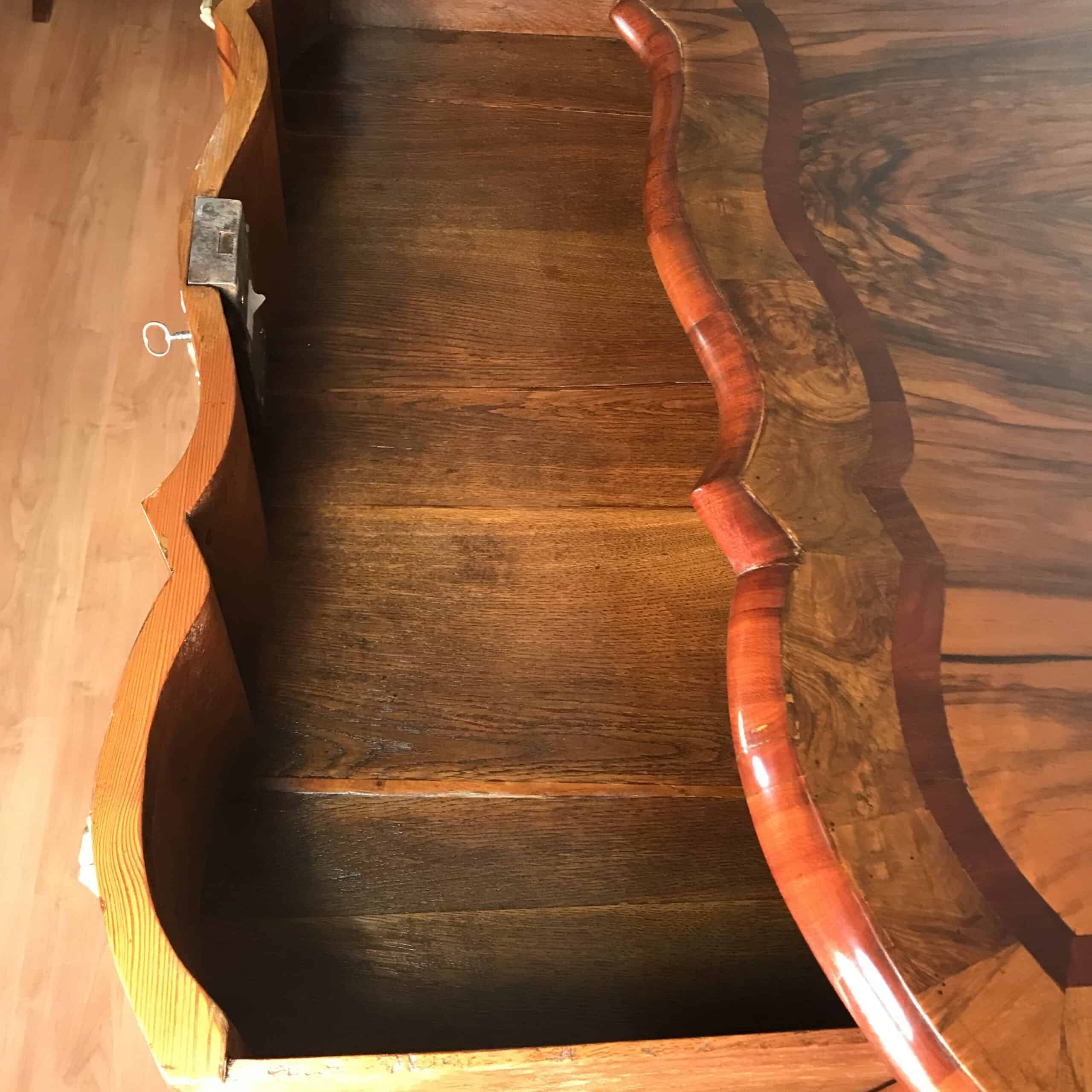 The proportions and curvature exemplify the dynamism of the Baroque aesthetic, while the warm walnut grain brings depth and sophistication. Professionally refinished to enhance the natural beauty of the wood, the surface reveals a renewed richness while preserving the piece’s historical character.