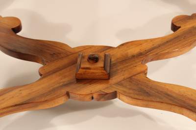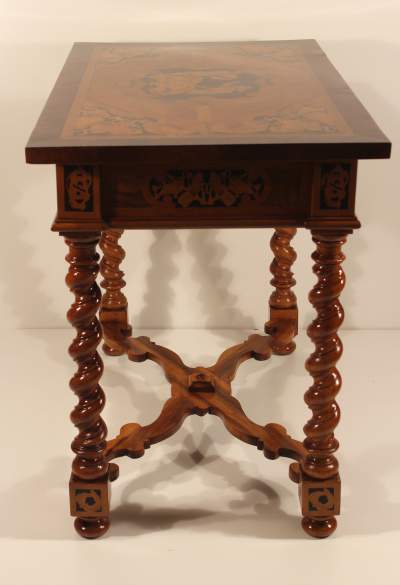 One of the key features of this table are its remarkable spiraling legs. Joined together by a curved stretcher, they lend the entire table a completely unique personality that is sure to pop out in every room it occupies. The legs support a table top that is rife with decorative features, as well. The insartia are undeniably breathtaking.