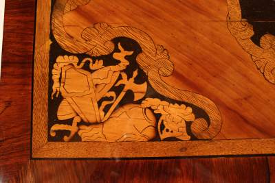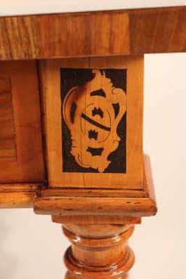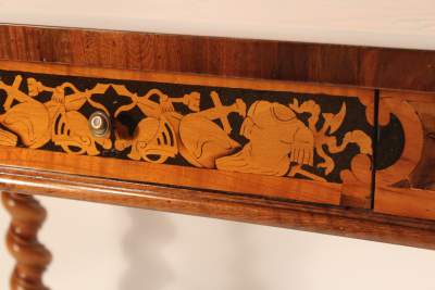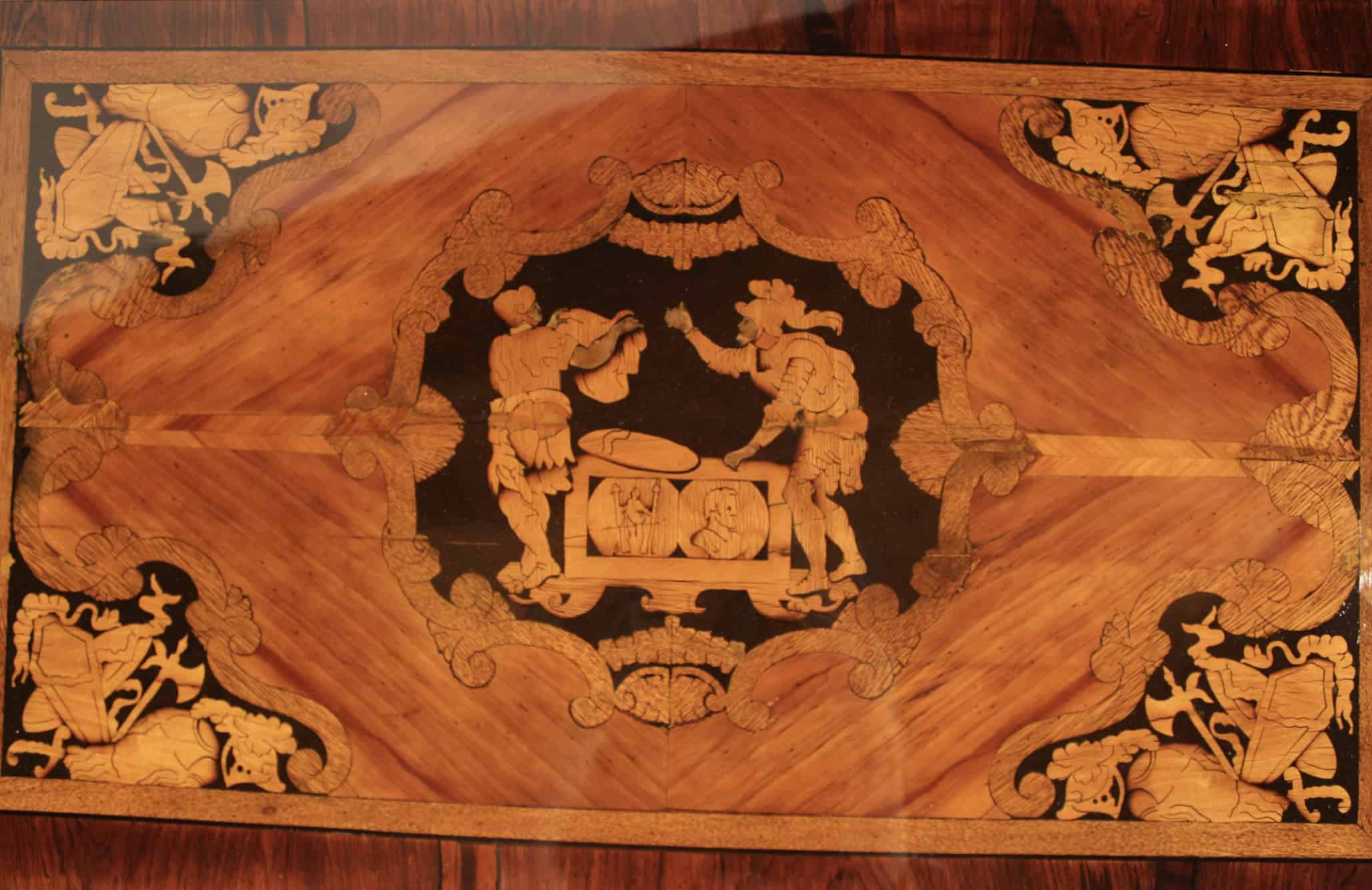 The intarsia in this German Baroque table combine small pieces from four different woods to create complex images. Using the different, naturally occurring shades and grains of certain wood types, whole landscapes and scenes can be constructed in the veneer.