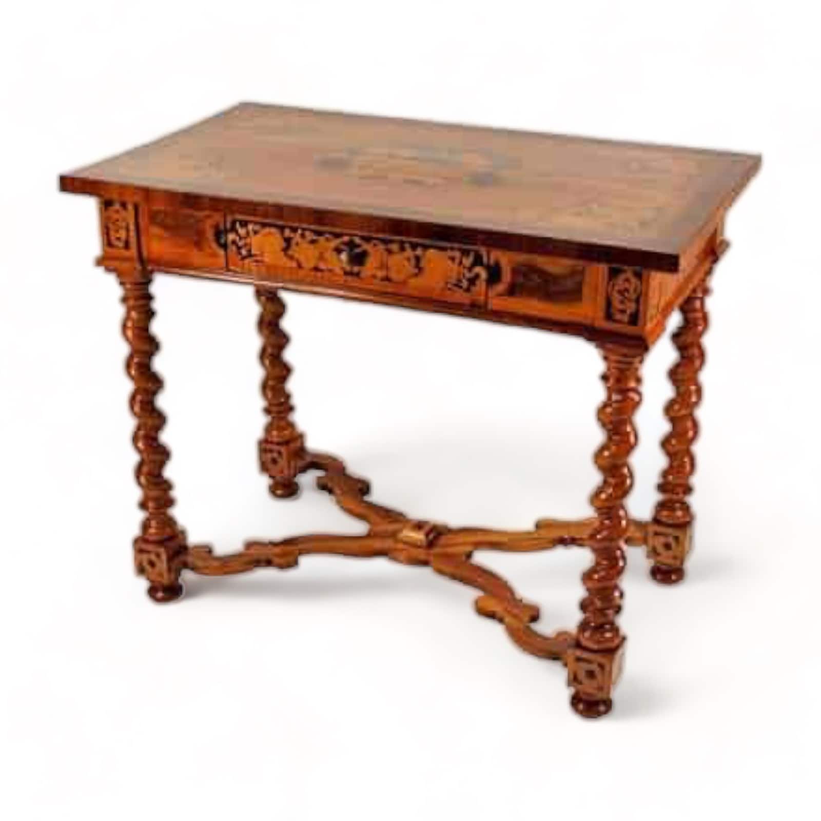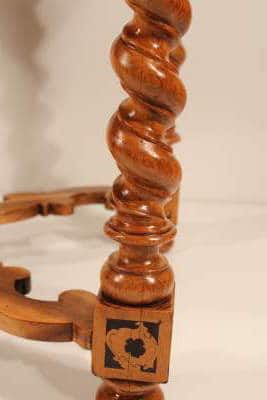 This unique antique South German Baroque table with inlaid walnut veneer is in very good condition. With the kind of playful and lavish design choices expected from the Baroque period, this piece is an absolute showstopper. From the spiraling legs to the gorgeously detailed intarsia (or wood mosaics), there is a whole catalogue of features that make it stand out.