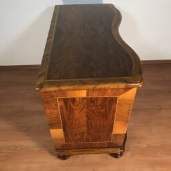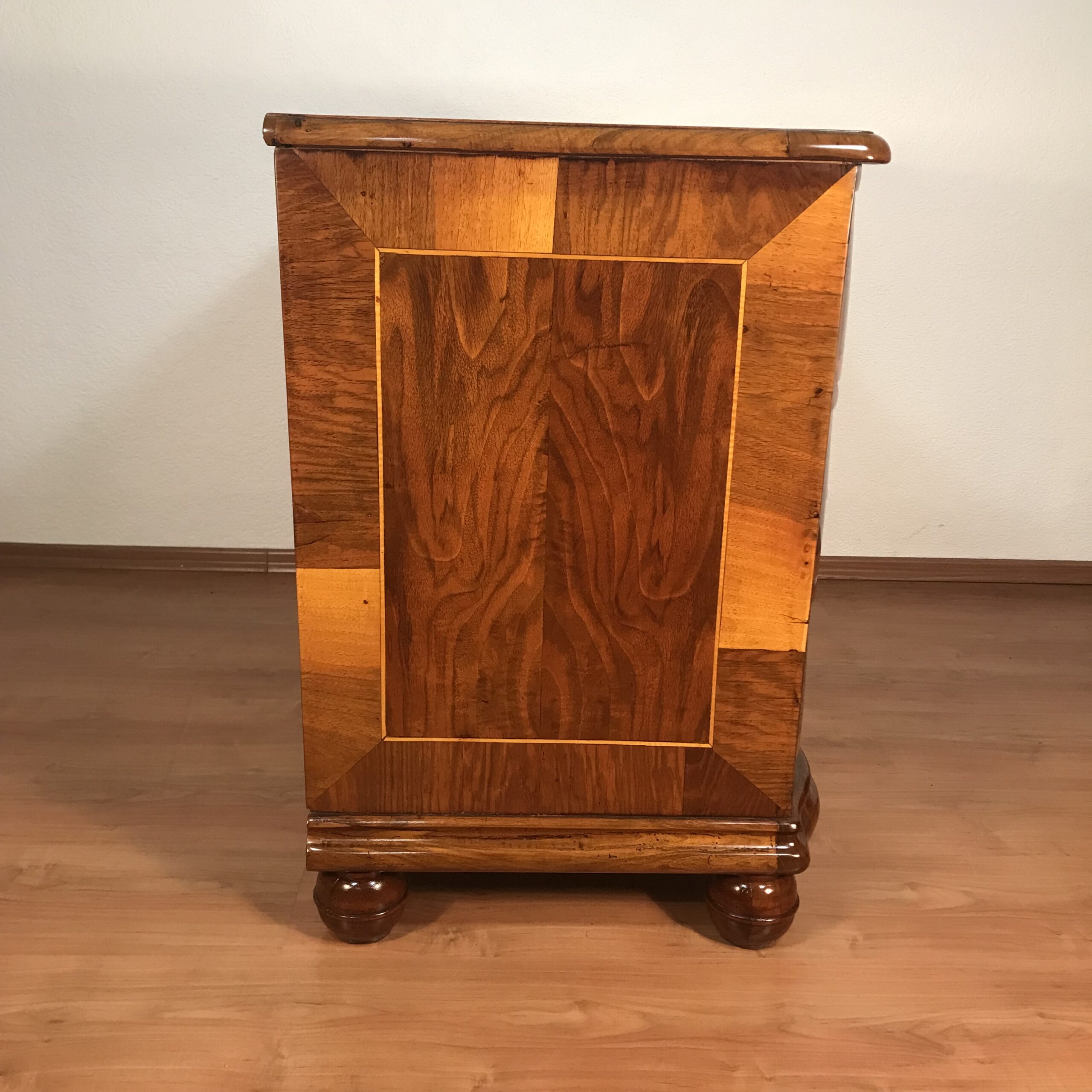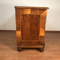 The chest has three drawers. Each drawer is decorated with a pretty walnut veneer and inlay pattern. The flowing grain adds visual interest and warmth. The piece stands on classic bun feet, which enhance its sculptural form.