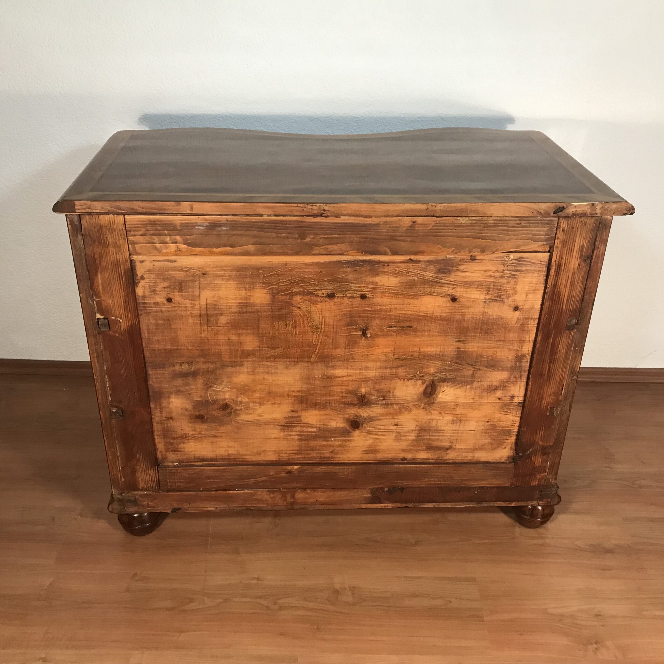 This German Baroque walnut chest of drawers dates to circa 1750. The piece features a softly curved front, typical of Baroque design. Its compact scale makes it easy to place.