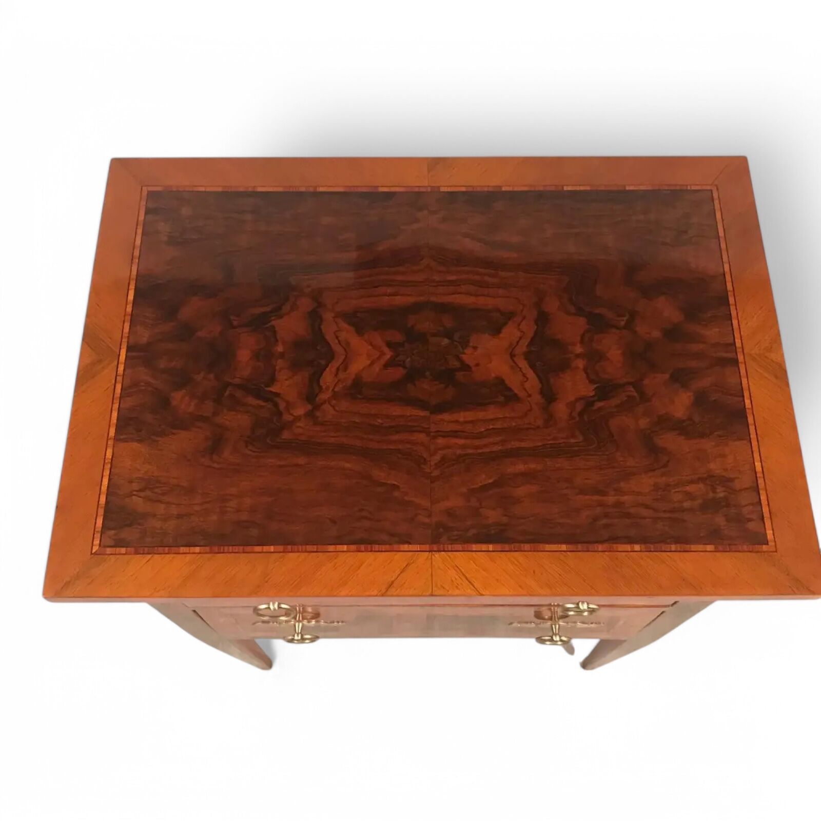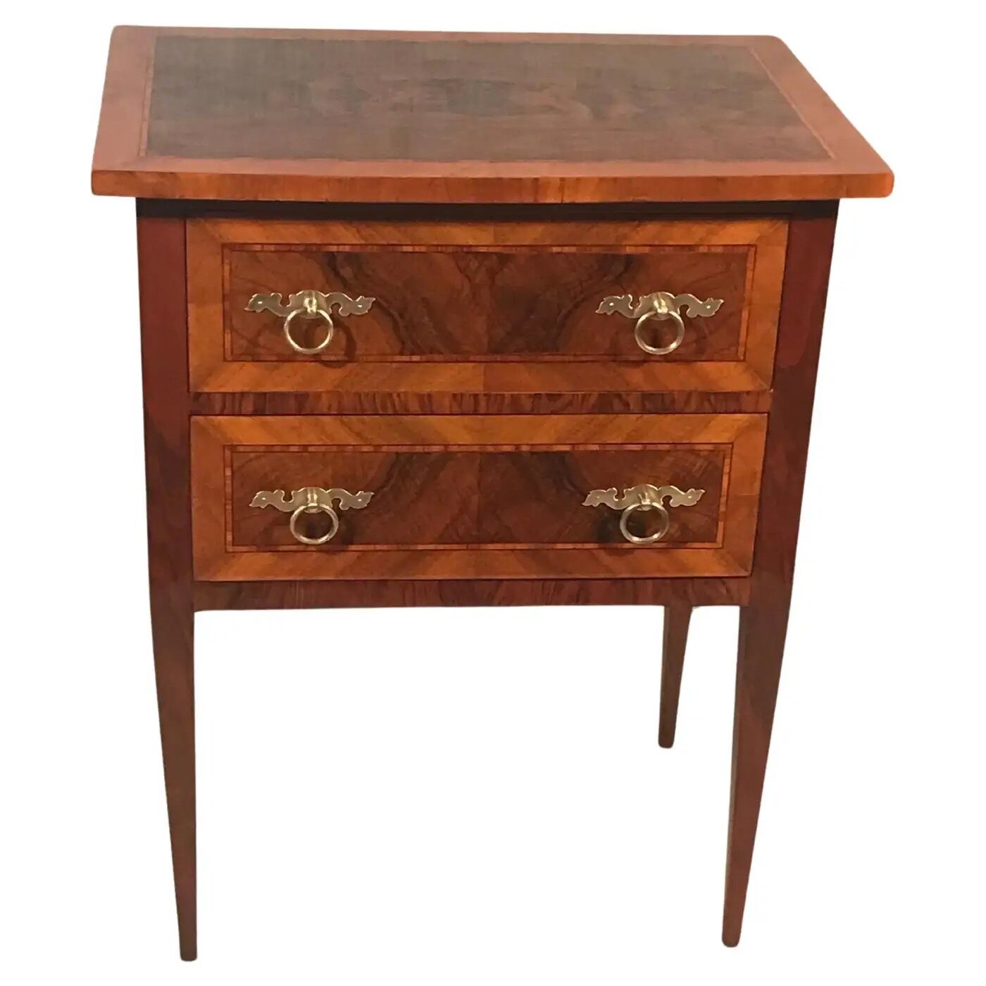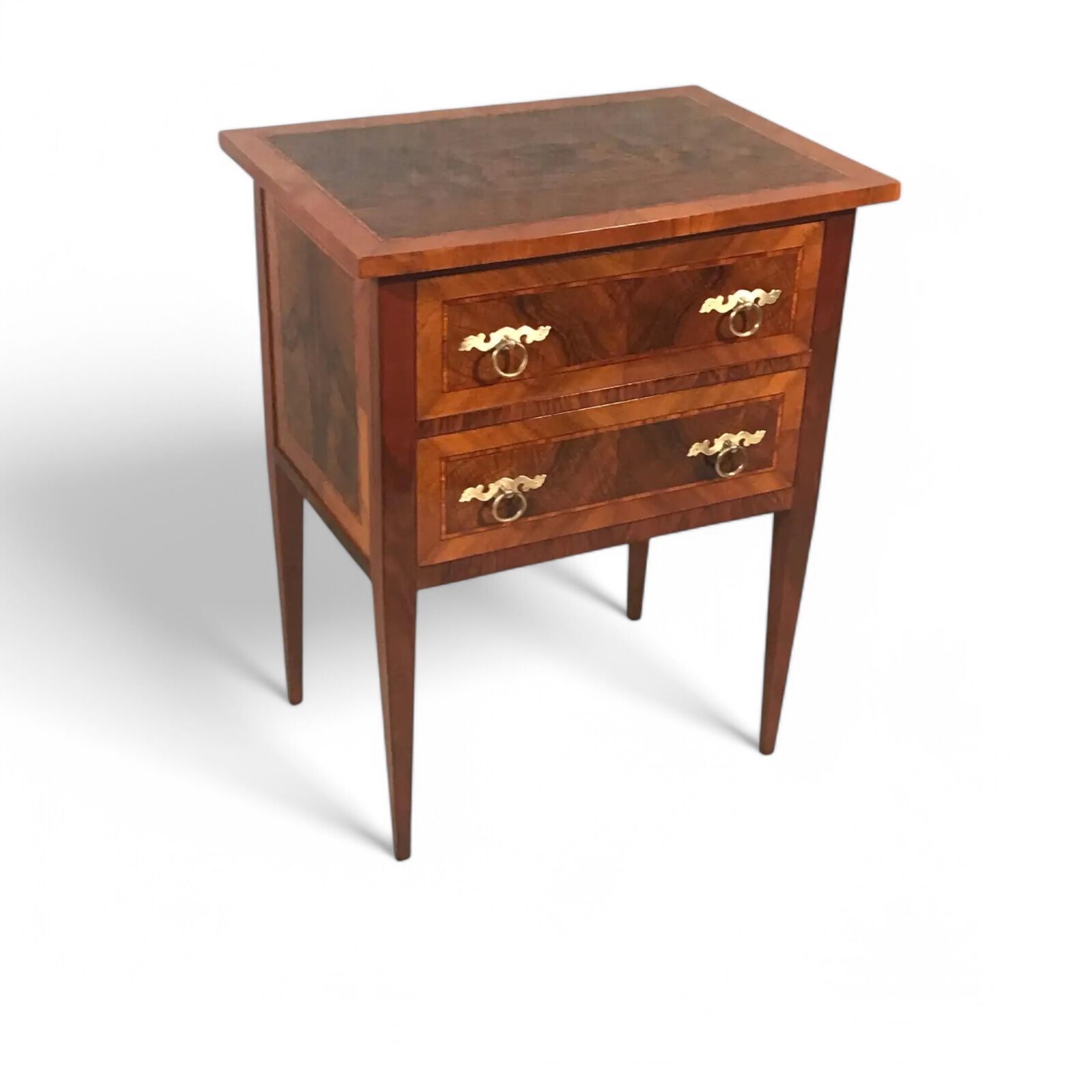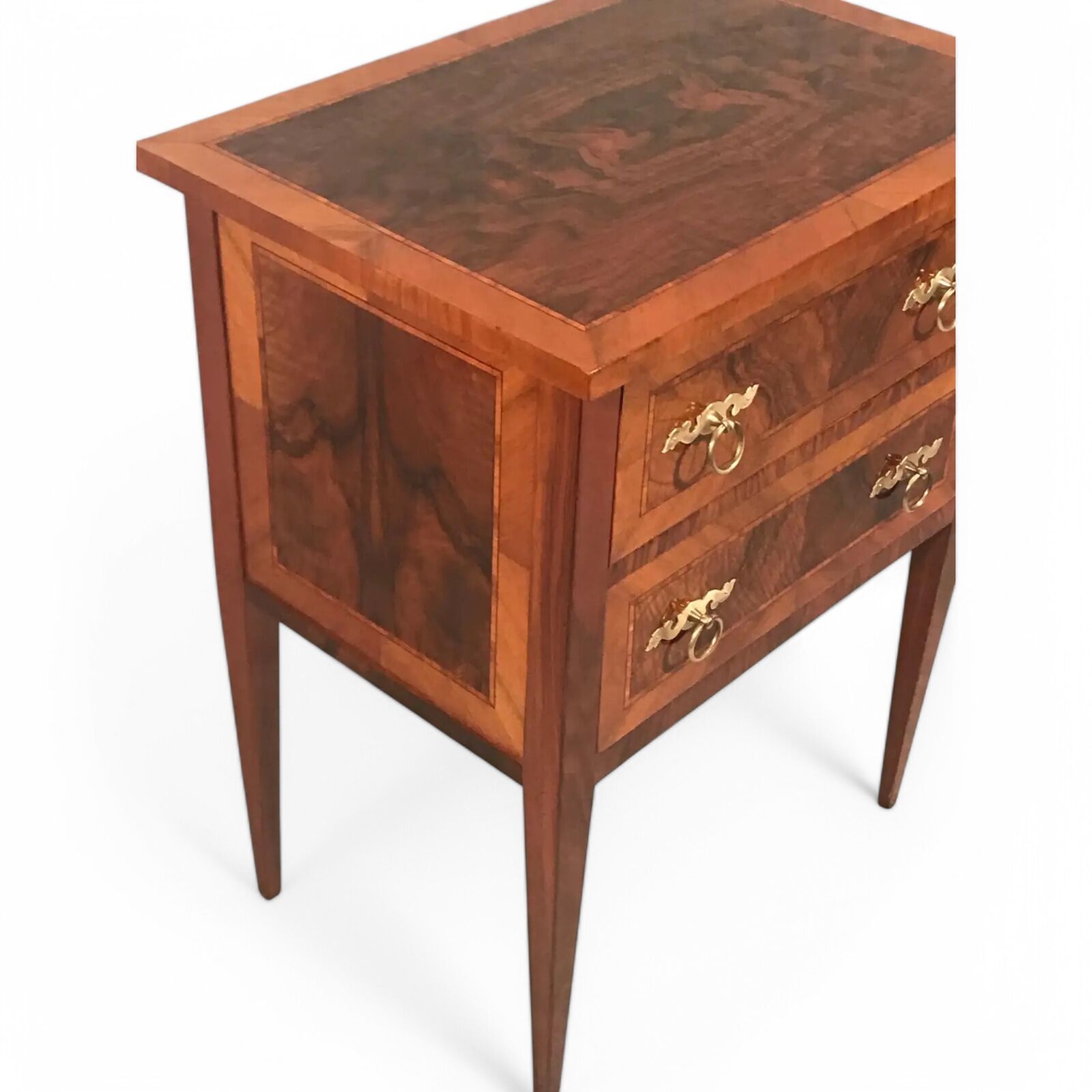 Discover the timeless elegance of this meticulously crafted 19th-century German Neoclassical chest of drawers or nightstand. Adorned with pretty walnut veneer grain, this piece exudes charm and sophistication. Standing gracefully on slender legs, two drawers offer both functionality and style. The top surface, showcasing a gorgeous veneer grain, is a true testament to the craftsmanship of the 19th century. Refinished with a shellac hand polish, this exquisite furniture piece is ready to elevate any space with its enduring allure.