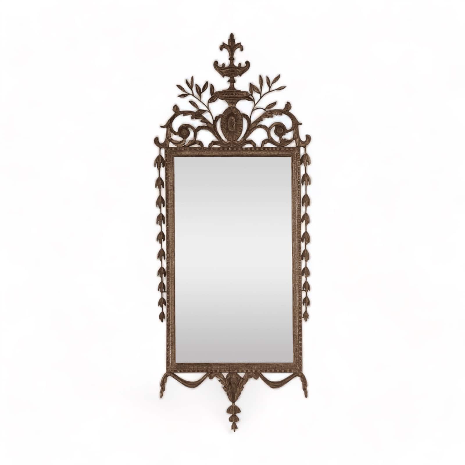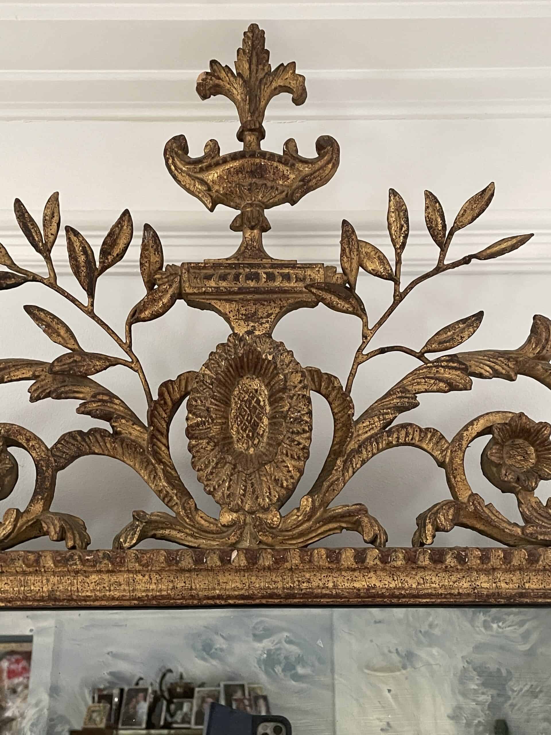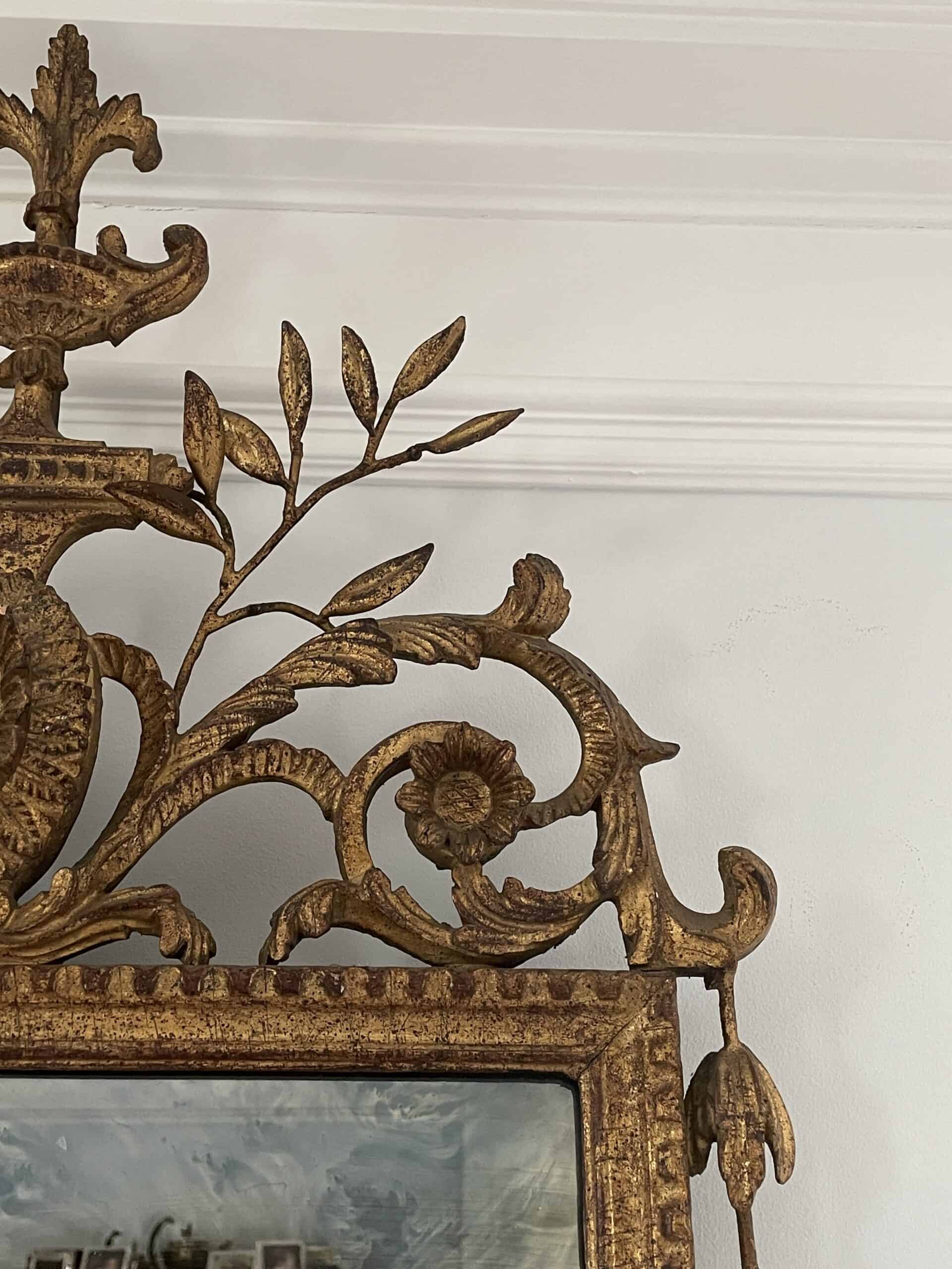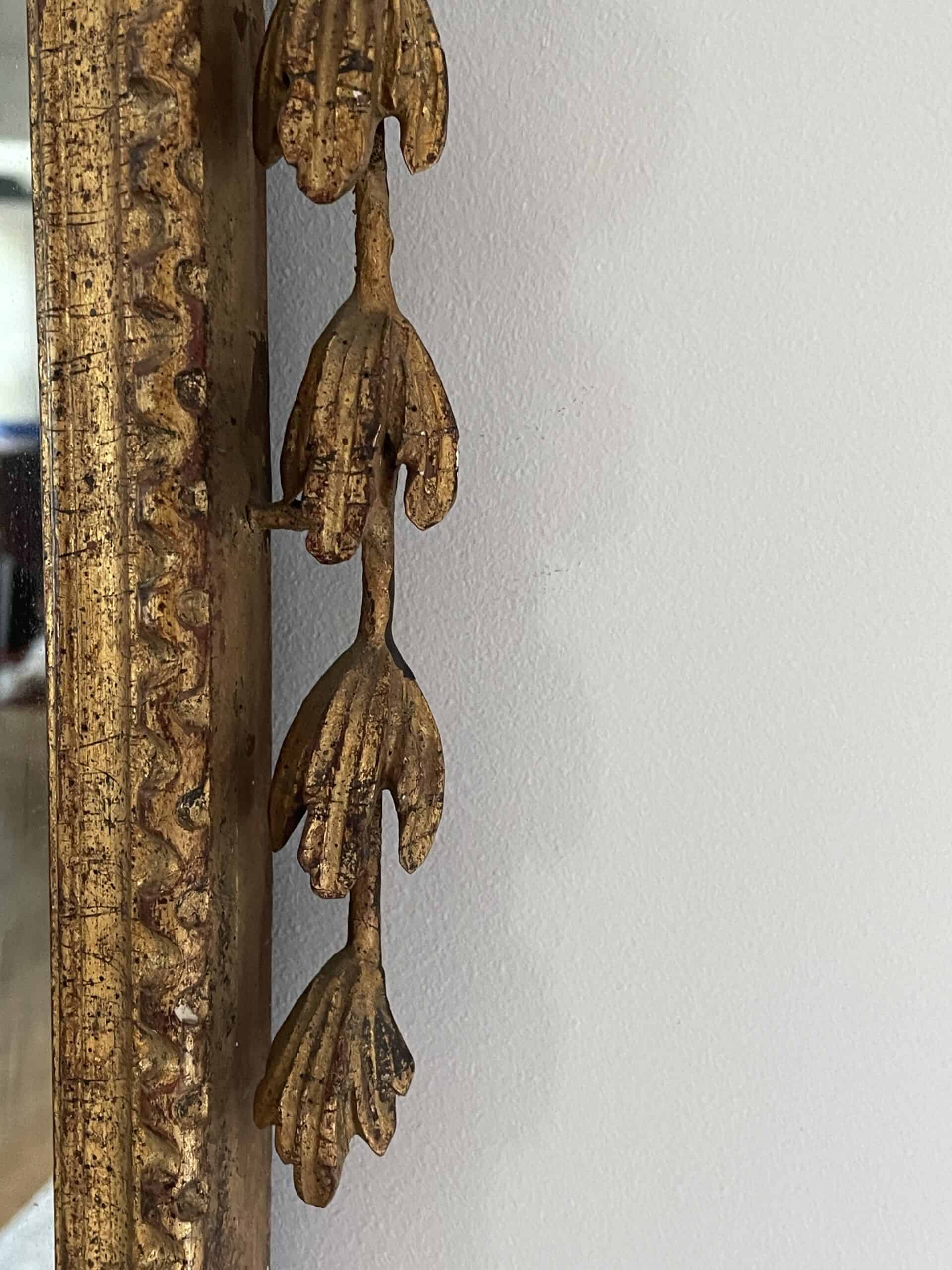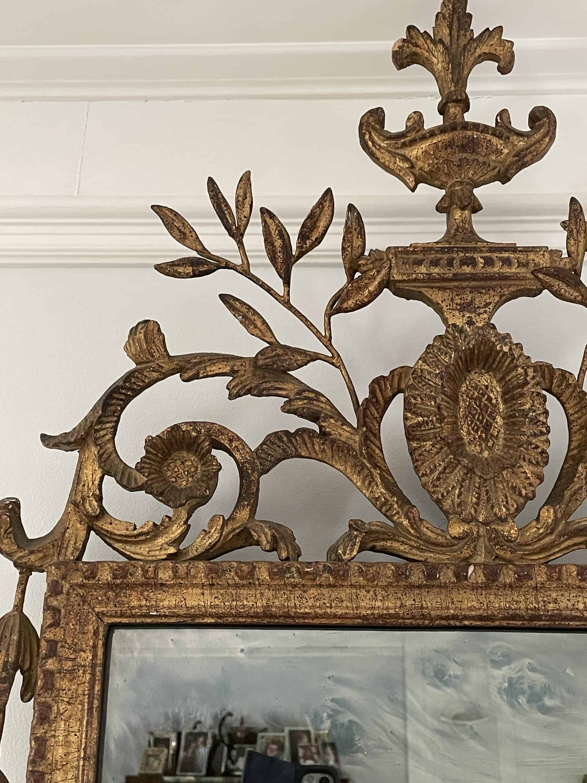 Discover the Beauty of a Hand-Carved Gilt Wood Louis XVI Mirror with Leaf and Flower Decor which dates back to the 19th century and comes from France. Experience the allure of this exquisite wall mirror featuring a meticulously hand-carved gilt wood and metal frame adorned with intricate leaf and flower decorations This beautiful piece is not just a mirror; it’s a captivating work of art that will enhance any living space.