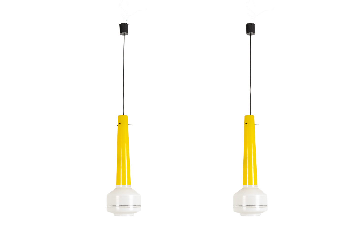 This matching pair features two-tone yellow and white glass with bold visual contrast.