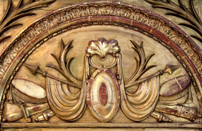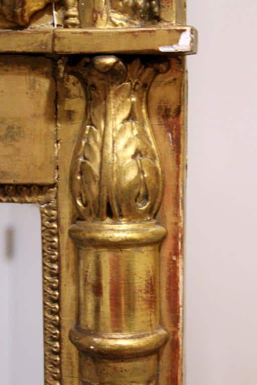 The design of this mirror features the typical characteristics of the French Louis XVI and Neoclassical style. Straight lines embellished with decorations, like the tropaion, deriving from antique design motives.