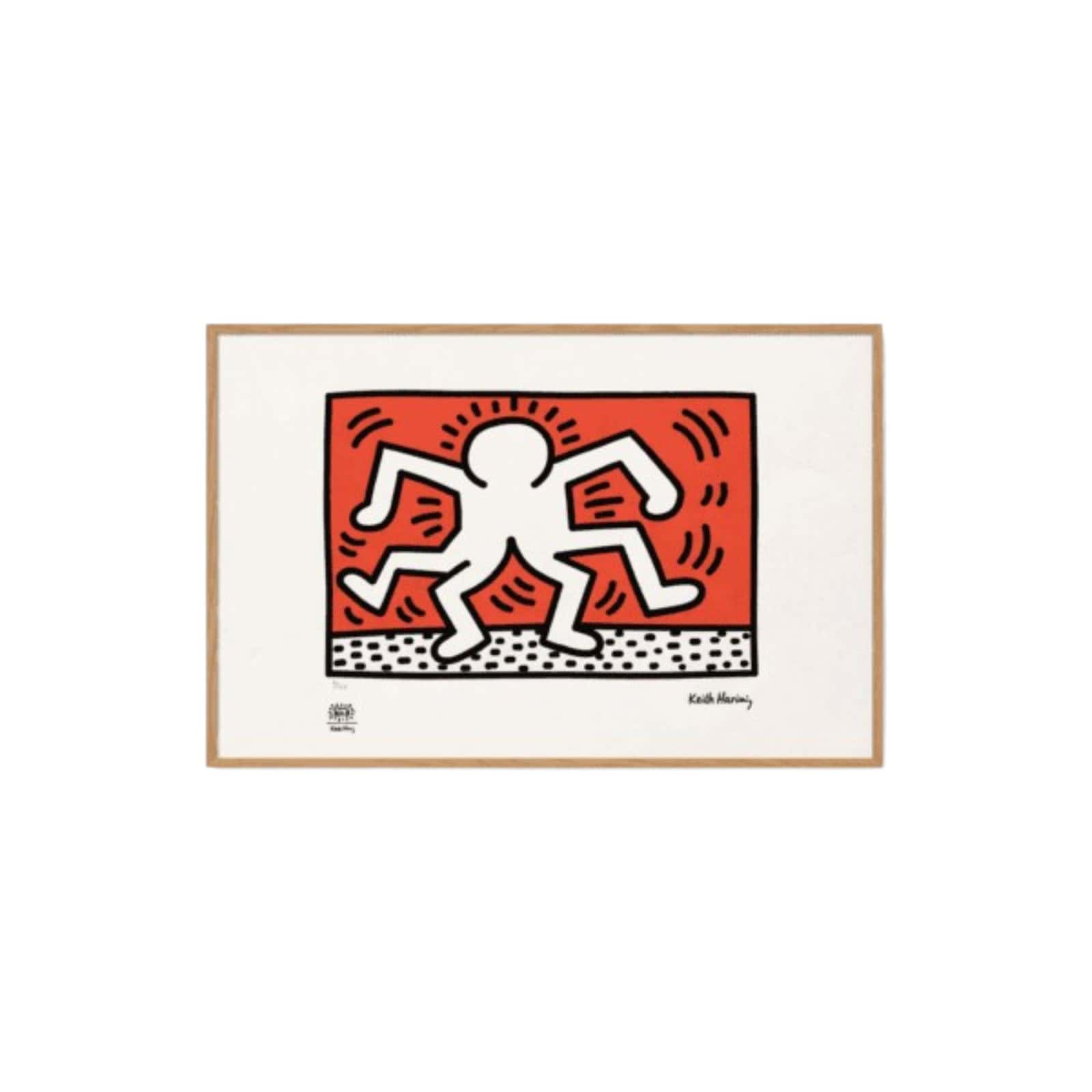 Keith Haring Numbered Color Print with bold rhythm and graphic intensity. This print features a vibrant silkscreen in a light oak frame. Keith Haring created this composition with energetic lines and iconic figures. The imagery reflects his unmistakable visual language.