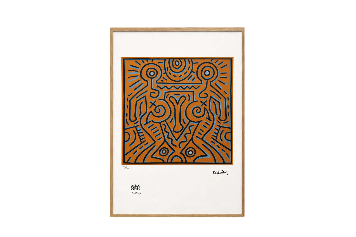 Keith Haring Silkscreen Print with bold movement and graphic clarity. This print features a vibrant color composition in a light oak frame. Keith Haring created this work with energetic lines and iconic figures. The composition reflects his unmistakable visual language.