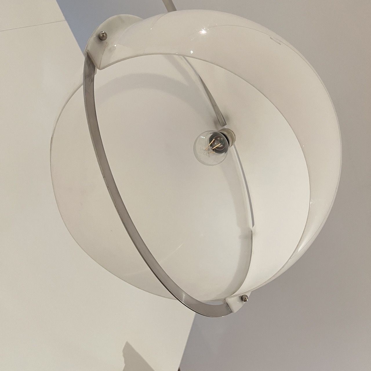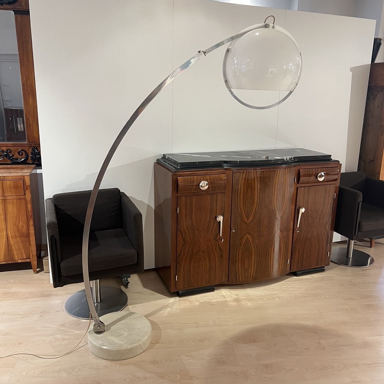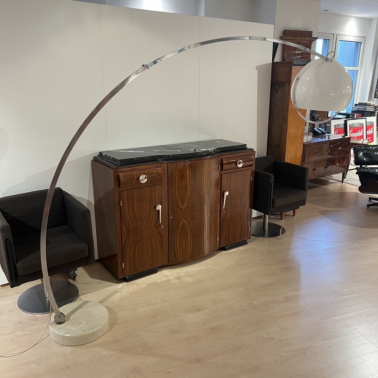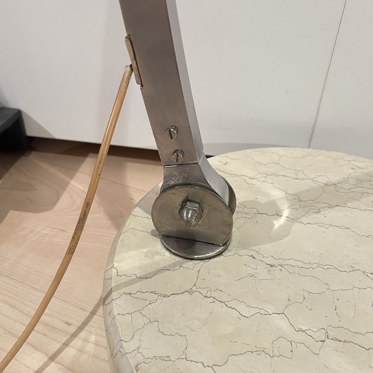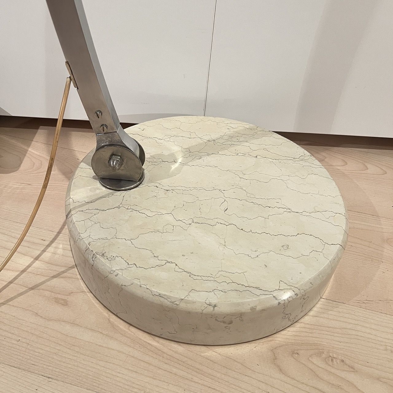 This vintage Harvey Guzzini arc floor lamp is a stunning example of mid-century modern Italian design. With its gracefully curved aluminum arm and adjustable projection (140 cm – 220 cm / 55 in – 86.6 in), it offers both elegance and versatility for any interior.