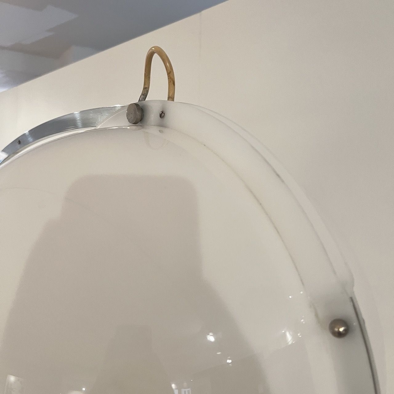 The two-piece white plastic lampshade emits a warm, diffused glow, a signature of Guzzini’s timeless aesthetic. A heavy travertine stone base provides stability while adding a natural, textured contrast to the sleek metallic structure.