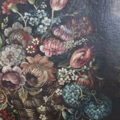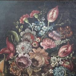 The artist uses precise detail and controlled brushwork throughout the composition. Dark tones highlight the vibrant colors of the flowers. This painting creates a striking focal point in any space. The painting has undergone careful restoration with relining. This process preserves its structure and original character.